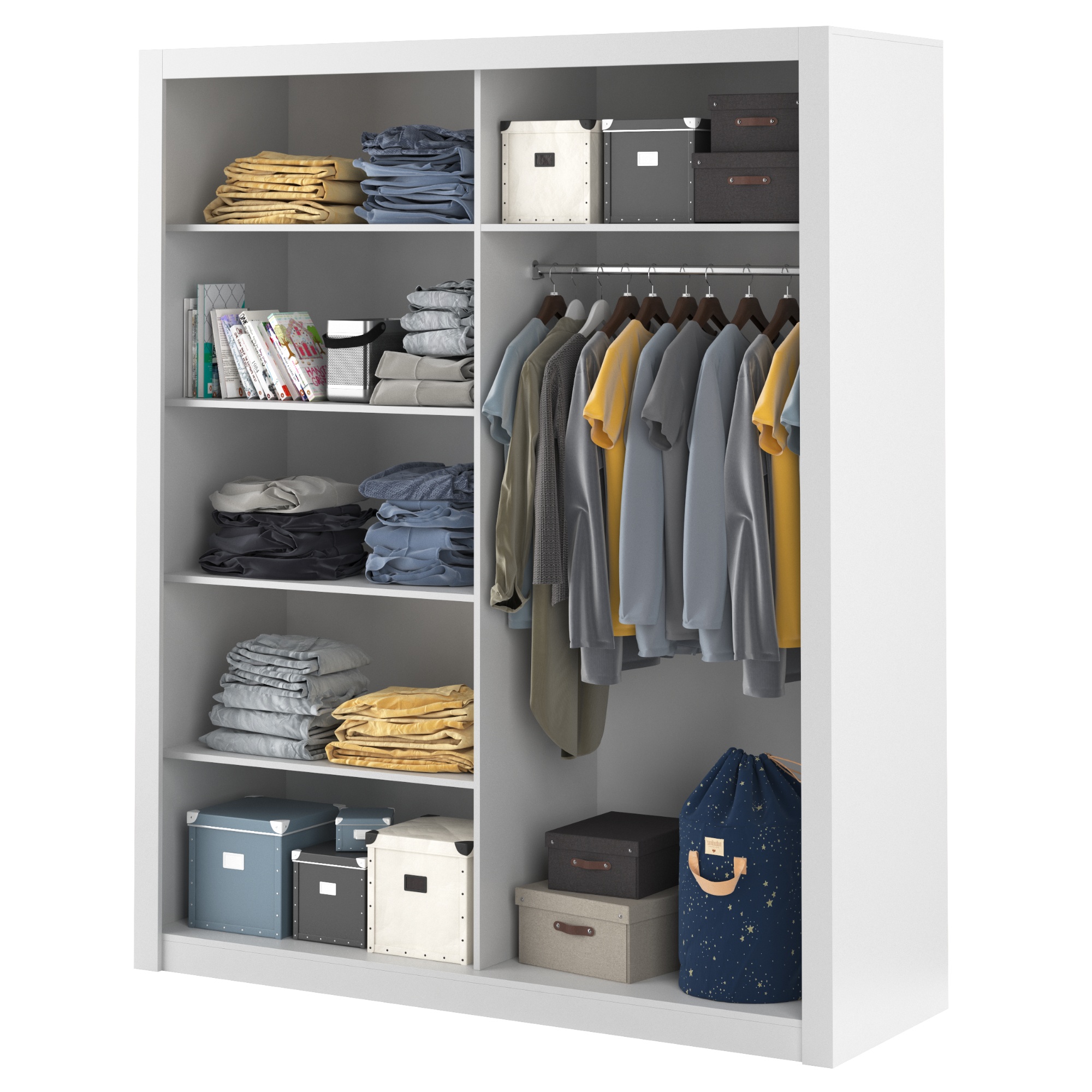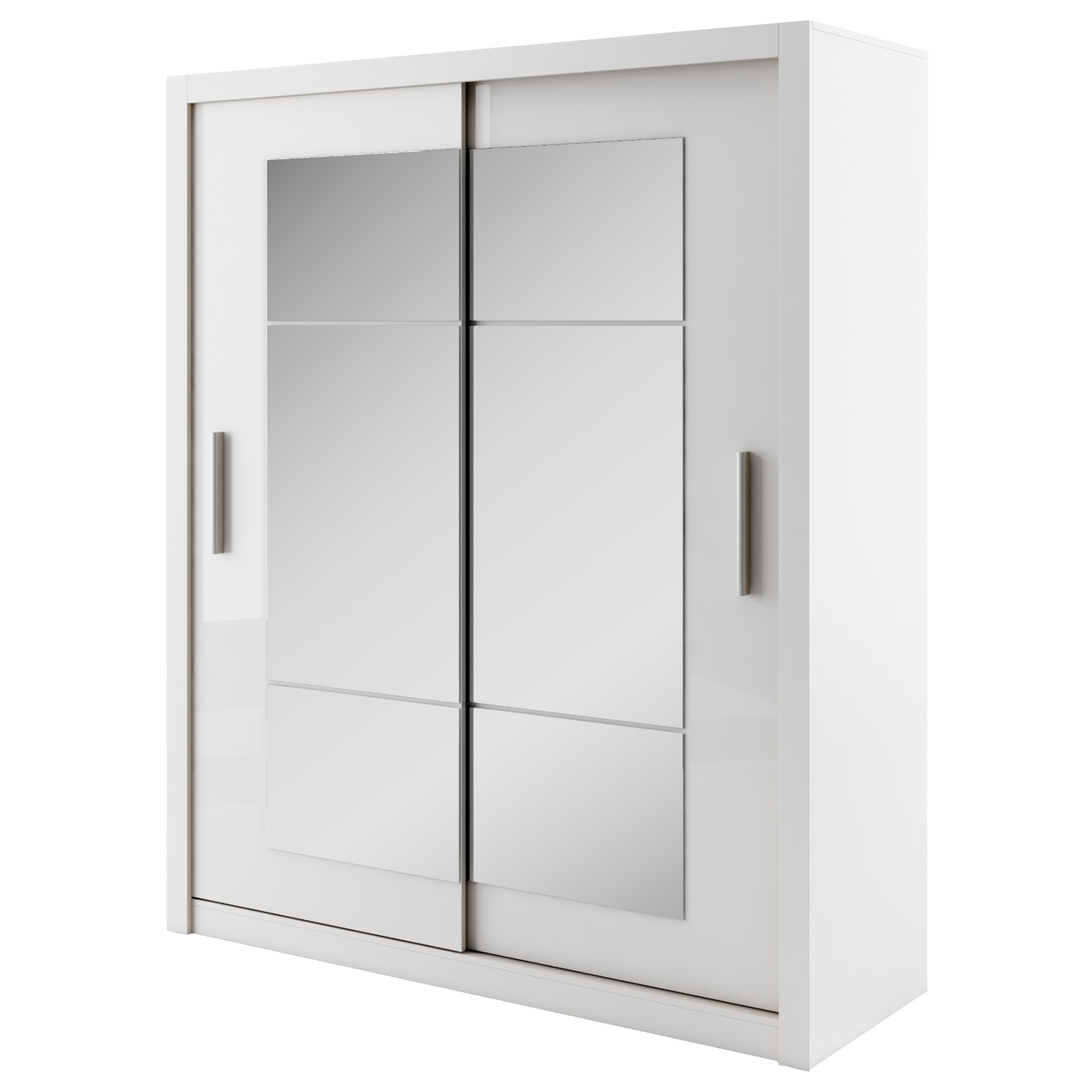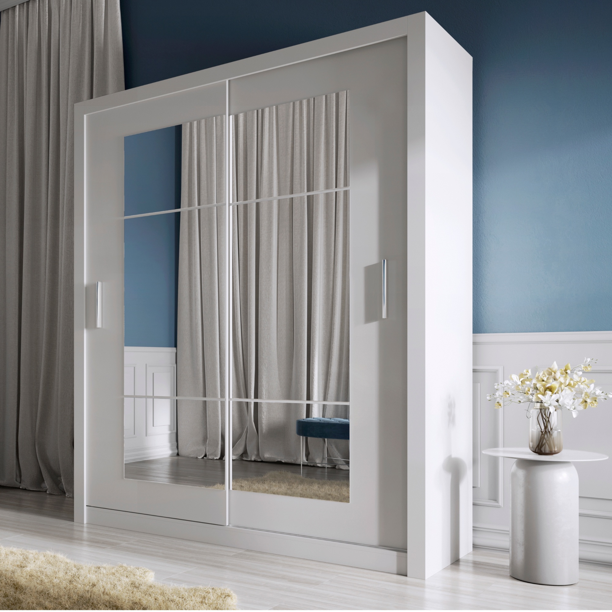 Šatníková skriňa IDEA 02 zaujme na prvý pohľad svojim veľmi praktickým a zároveň dizajnovým prvkom - posuvnými dverami so zrkadlami. Za nimi sa skrýva veľa úložného priestoru členeného na oddiel so šatníkovou tyčou a hornou policou a na oddiel so štyrmi policami. Vyrobená je z laminovaného dreveného materiálu a povrchovú úpravu je možné zvoliť z dvoch dostupných variantov - matnej bielej a dekora duba sanremo. Moderný vzhľad skrini dodávajú rúčky vo farbe kovu.