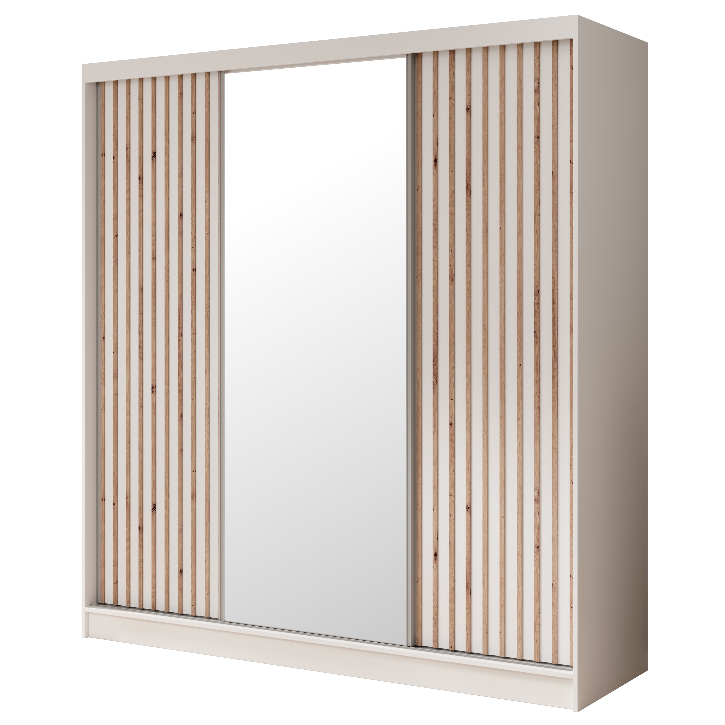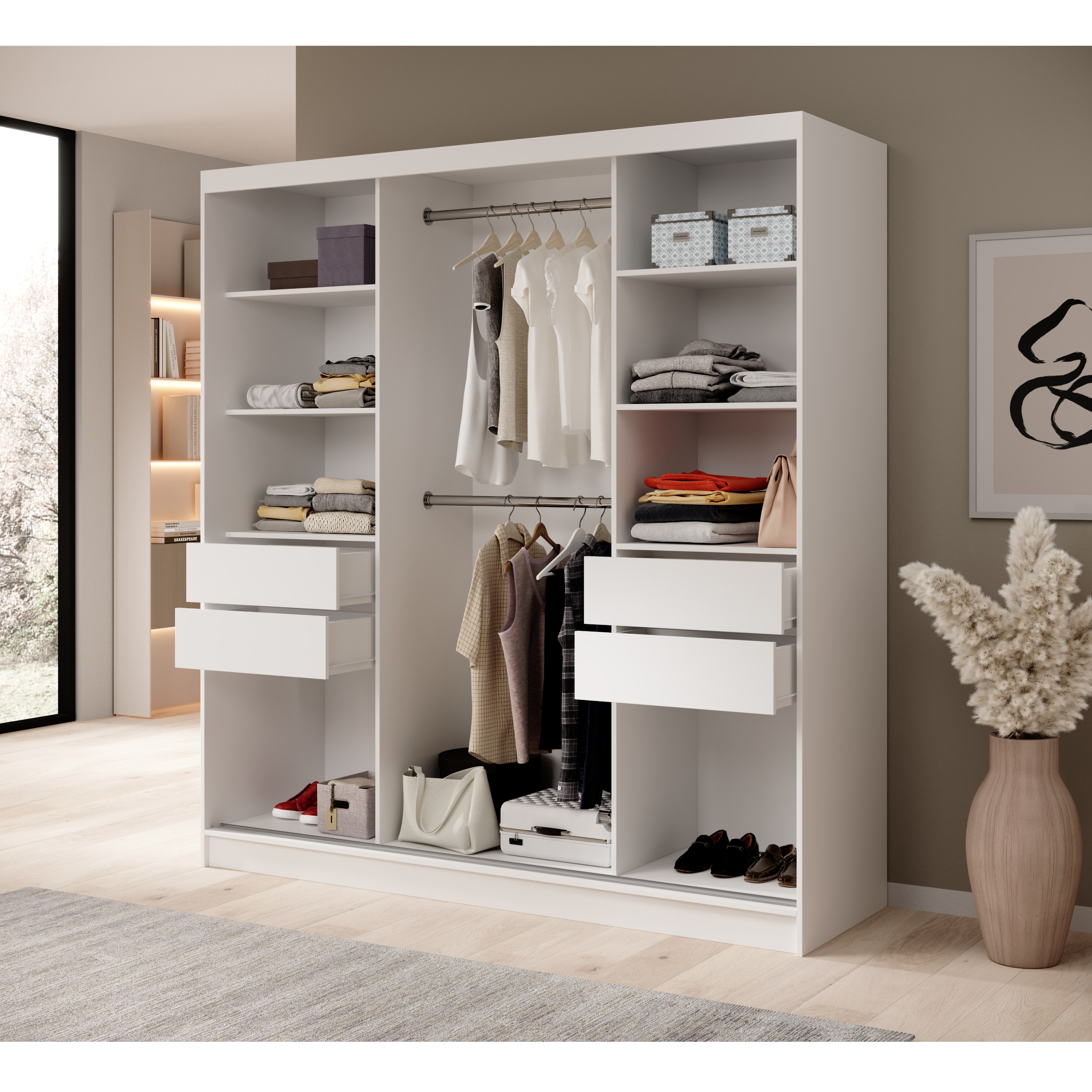 Vnútorný priestor je vybavený 2 šatníkovými tyčami, ktoré využijete na zavesenie väčších alebo ľahko krčivých kúskov oblečenia. Skriňa ďalej obsahuje 2 vložené police a 2 zásuvky na každej strane, ktoré spolu vytvárajú veľký a prakticky rozdelený úložný priestor. Skriňu uzatvárajú posuvné dvere, ktoré nezaberajú cenné miesto ani vo vnútri, ani mimo skrine. Jedny z dverí sú navyše doplnené o praktické zrkadlo, vďaka ktorému si môžete kedykoľvek upraviť svoj vzhľad.