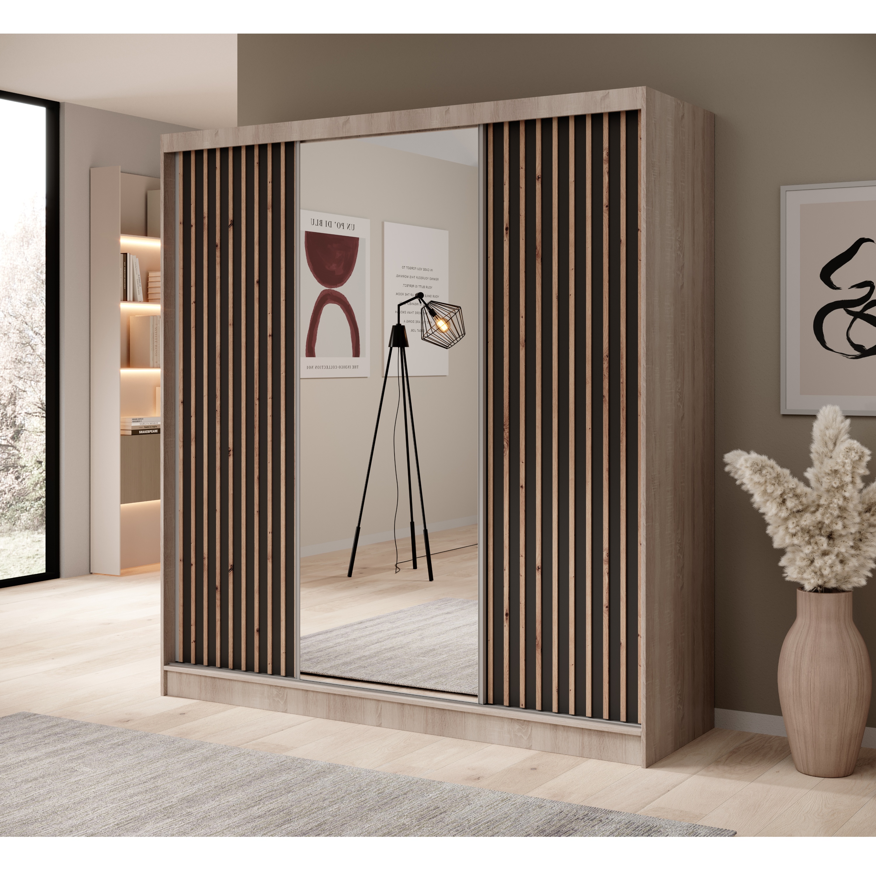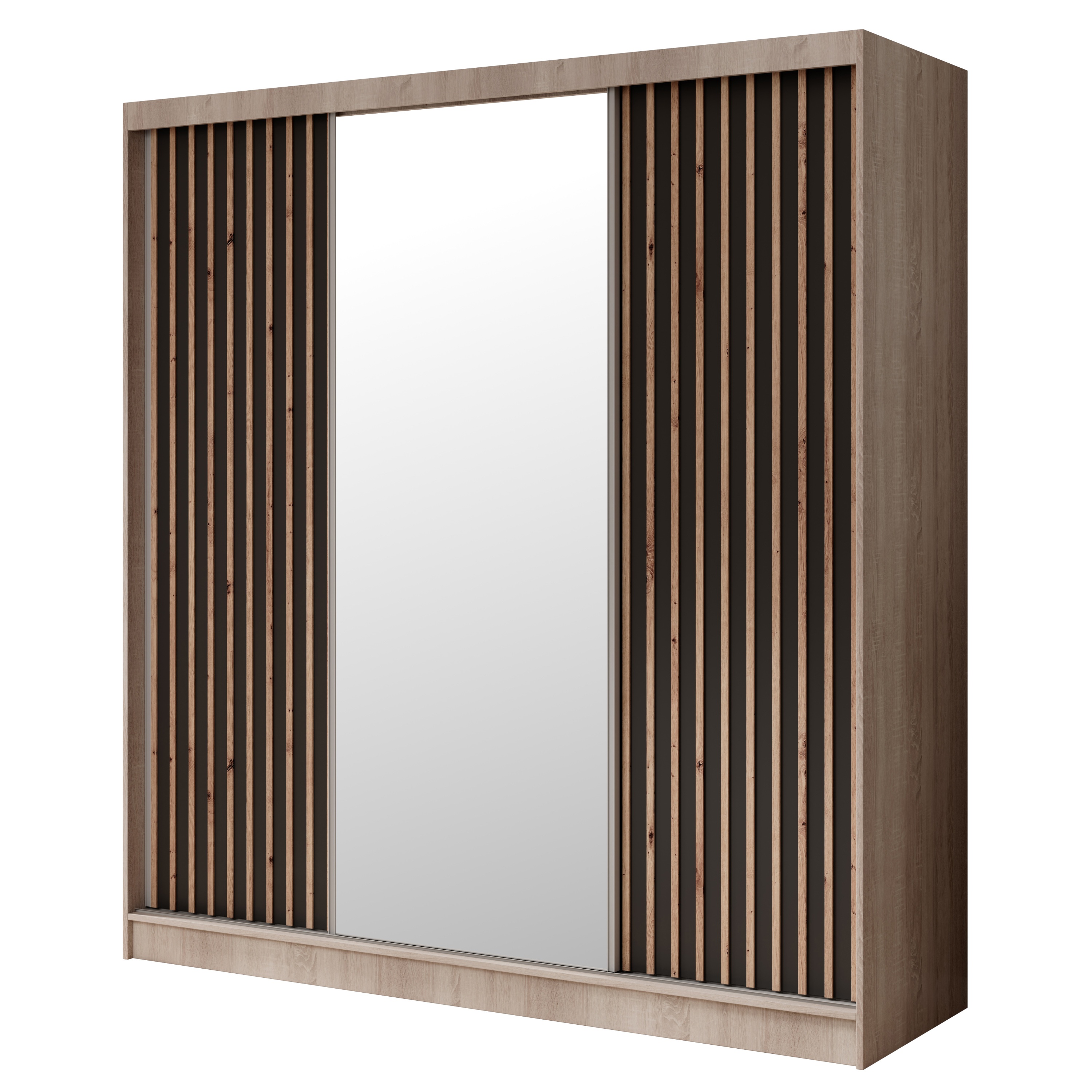 Vnútorný priestor je vybavený 2 šatníkovými tyčami, ktoré využijete na zavesenie väčších alebo ľahko krčivých kúskov oblečenia. Skriňa ďalej obsahuje 2 vložené police a 2 zásuvky na každej strane, ktoré spolu vytvárajú veľký a prakticky rozdelený úložný priestor. Skriňu uzatvárajú posuvné dvere, ktoré nezaberajú cenné miesto ani vo vnútri, ani mimo skrine. Jedny z dverí sú navyše doplnené o praktické zrkadlo, vďaka ktorému si môžete kedykoľvek upraviť svoj vzhľad.