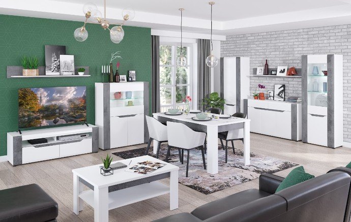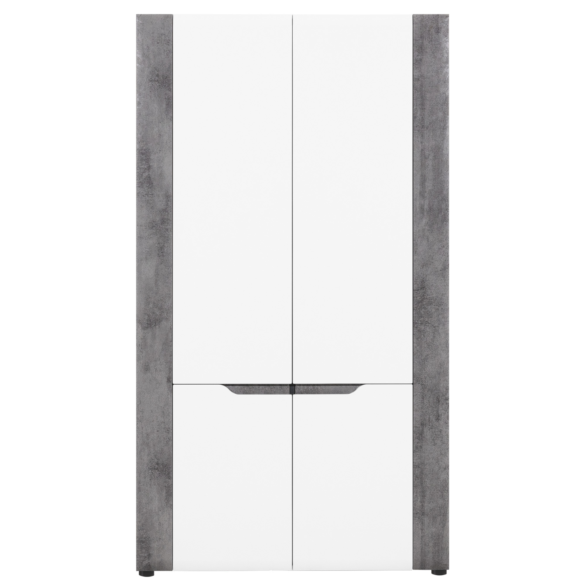 Šatníková skriňa je delená do dvoch úložných sekcií. Každú z nich zakrýva dvojica dverí, ktoré sa otvárajú do priestoru. Vrchná sekcia obsahuje jednu šatníkovú tyč a stane sa ideálnym miestom na kabáty, bundy a ďalšie módne kúsky. Spodná sekcia ponúka priestor delený dvomi policami, kam sa skvele hodia tričká, nohavice či spodná bielizeň. Skriňa je vyrobená z laminovaného dreveného materiálu, ktorý sa vyznačuje ľahkou udržiavateľnosťou aj dlhou životnosťou. Biele dvierka skvele dopĺňa kontrastný dekor betóna.