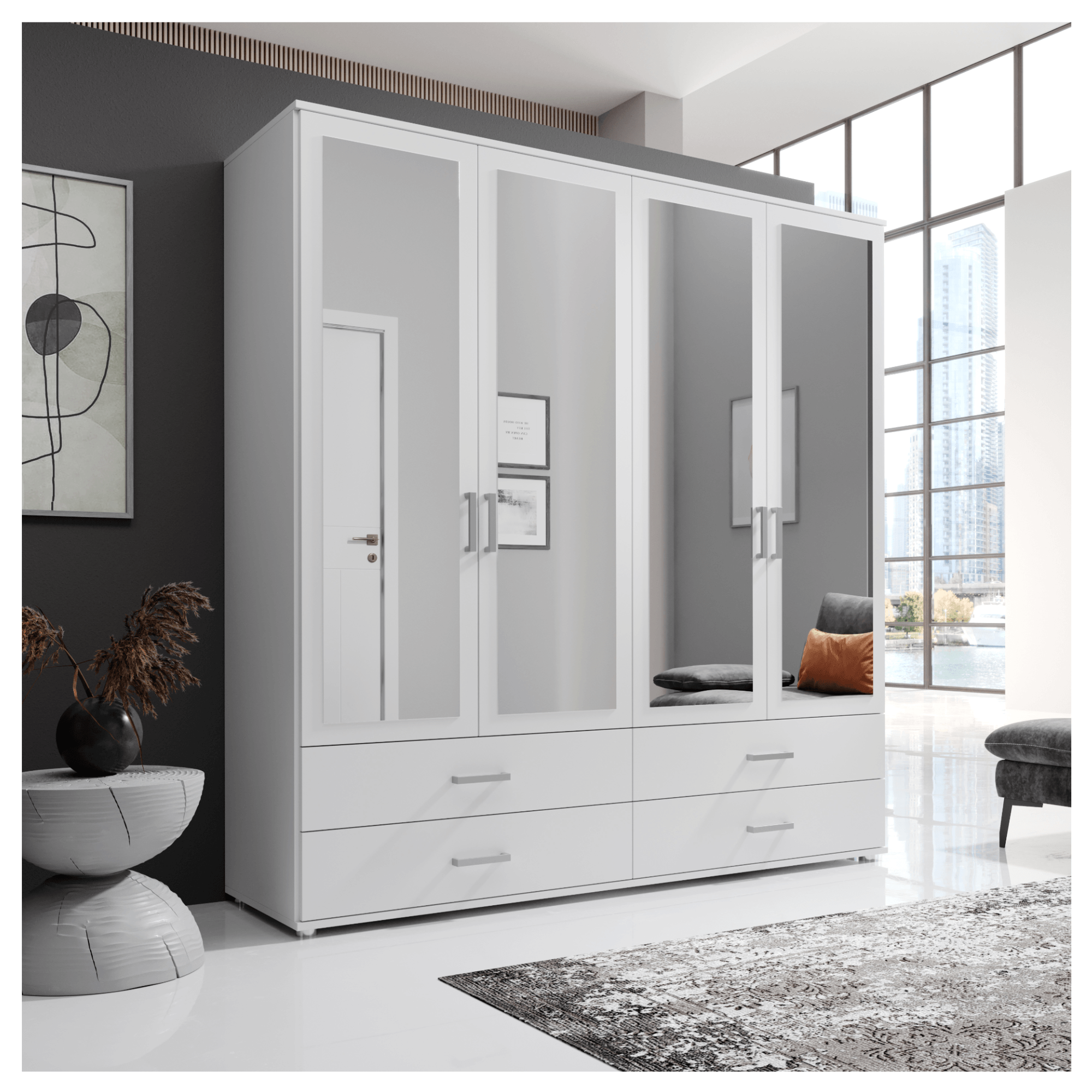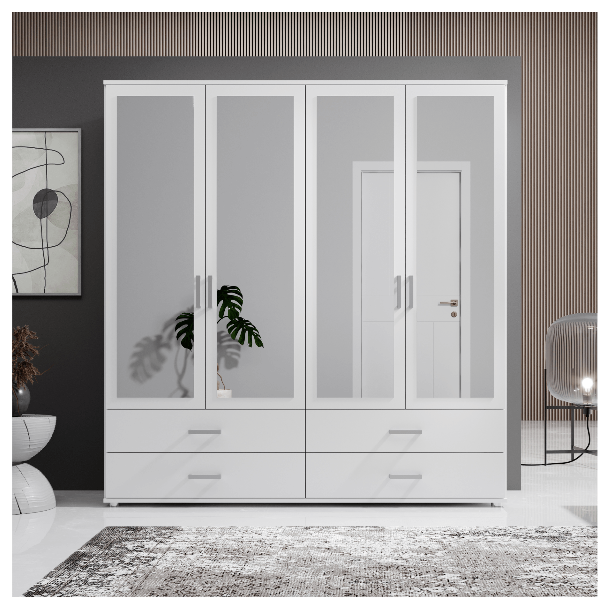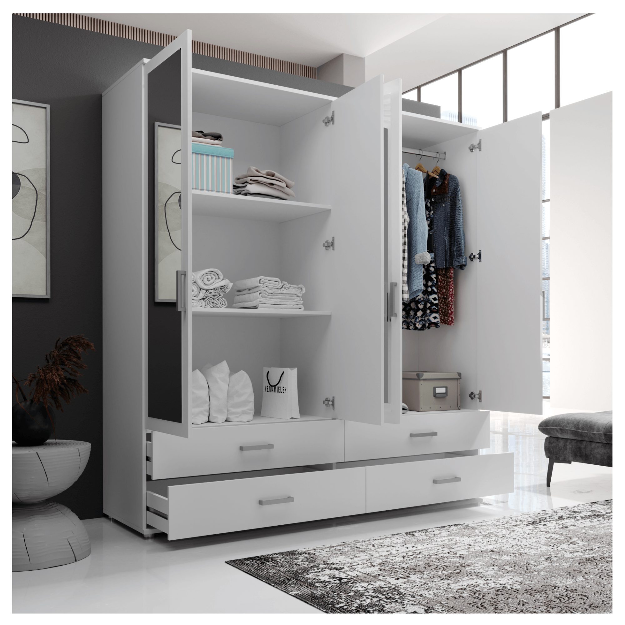Skriňu uzatvárajú 4 otočné dvere otvárajúce sa do priestoru, ktoré umožňujú využiť vnútorný priestor na maximum. Predné plochy všetkých dverí sú vyplnené zrkadlami, ktoré opticky zväčšia a presvetlia aj tmavé miestnosti. Za ľavým párom dverí sa nachádzajú 2 priestranné, vložené police, ktoré ponúkajú dostatok miesta na uskladnenie poskladaného šatstva či lôžkovín. Do políc môžete tiež umiestniť vlastné úložné boxy, ktoré priestor prakticky rozčlenia. Pravá polovica obsahuje šatníkovú tyč na zavesenie búnd, kabátov či krčivých kúskov oblečenia. Drobné odevy, doplnky, šperky a ďalšie nevyhnutnosti môžete pohodlne uložiť do 4 priestranných zásuviek. Všetky predné plochy sú doplnené o výrazné rúčky, ktoré ľahko nahmatáte aj za tmy.
