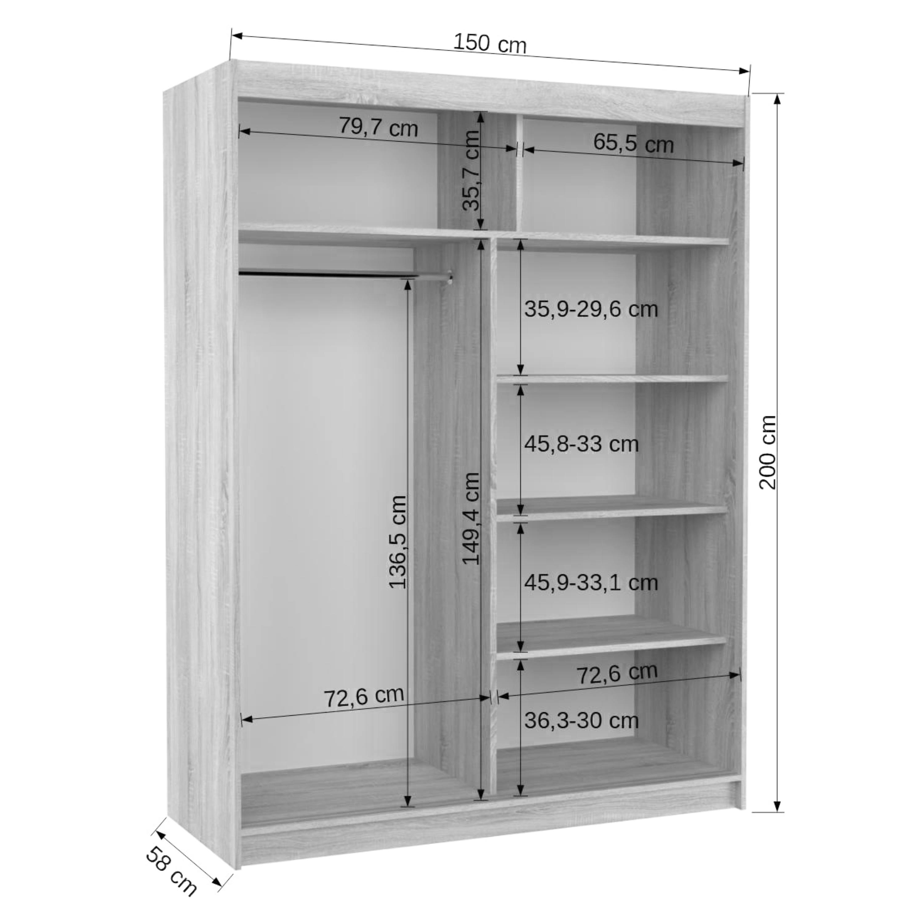 Vnútorné vybavenie pozostáva celkom z 5 políc a 1 šatníkovej tyče pre rôzne typy odevov. Skriňu uzatvárajú posuvné dvere, ktoré šetria cenný priestor vo vnútri aj mimo skriňu. Jedny z dverí sú navyše vybavené praktickým zrkadlom, v ktorom si môžete kedykoľvek upraviť svoj vzhľad a zároveň skvele presvetlí miestnosť. Korpus je vyrobený z laminovaného dreveného materiálu doplneného o ABS hrany chrániace pred mechanickým poškodením.