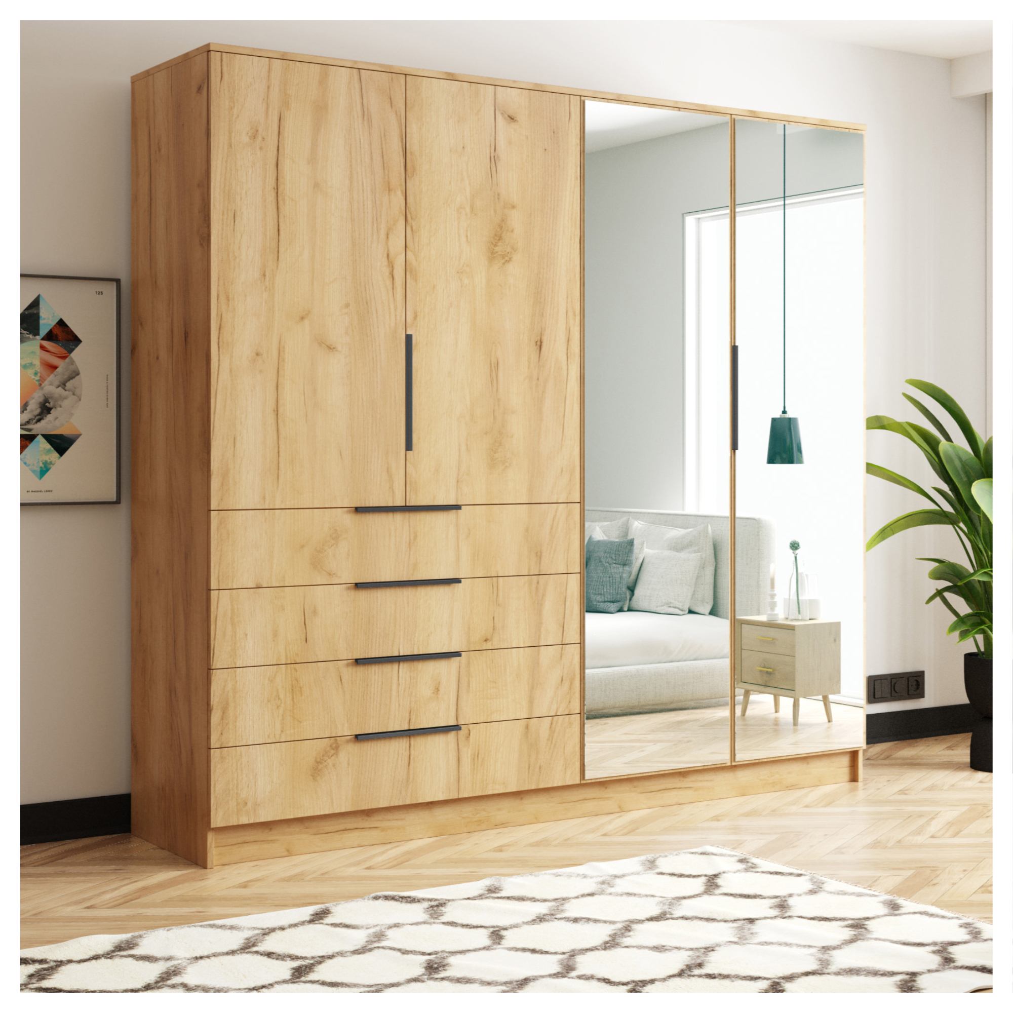 Pár otočných dverí na ľavej strane za sebou ukrýva prepojený priestor s 2 vloženými policami po celej šírke na prehľadné skladovanie poskladaného textilu. Zostávajúci pár dverí na pravej strane je vybavený zrkadlami, ktoré miestnosť opticky zväčšia a zároveň si v nich môžete kedykoľvek skontrolovať svoj vzhľad. Za dverami nájdete vnútorné vybavenie v podobe šatníkovej tyče a vloženej police nad ňou. Drobné odevy, doplnky a ďalšie predmety, ku ktorým chcete mať ľahký prístup potom môžete uložiť do 4 samostatných zásuviek. Všetky predné plochy sú doplnené o výrazné rúčky na jednoduchšiu každodennú manipuláciu.