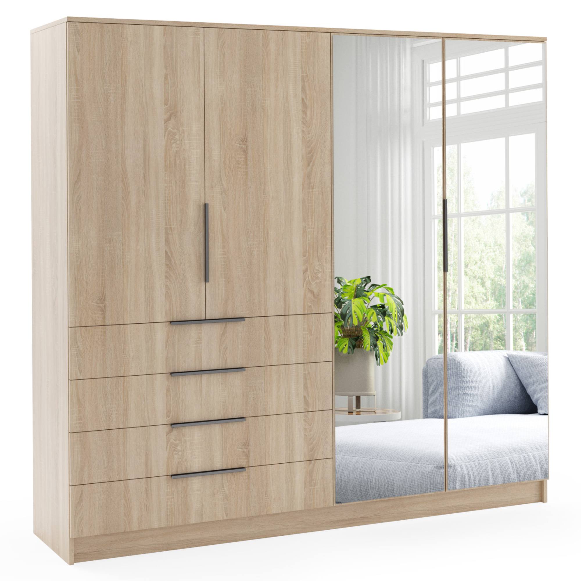 Pár otočných dverí na ľavej strane za sebou ukrýva prepojený priestor s 2 vloženými policami po celej šírke na prehľadné skladovanie poskladaného textilu. Zostávajúci pár dverí na pravej strane je vybavený zrkadlami, ktoré miestnosť opticky zväčšia a zároveň si v nich môžete kedykoľvek skontrolovať svoj vzhľad. Za dverami nájdete vnútorné vybavenie v podobe šatníkovej tyče a vloženej police nad ňou. Drobné odevy, doplnky a ďalšie predmety, ku ktorým chcete mať ľahký prístup potom môžete uložiť do 4 samostatných zásuviek. Všetky predné plochy sú doplnené o výrazné rúčky na jednoduchšiu každodennú manipuláciu.