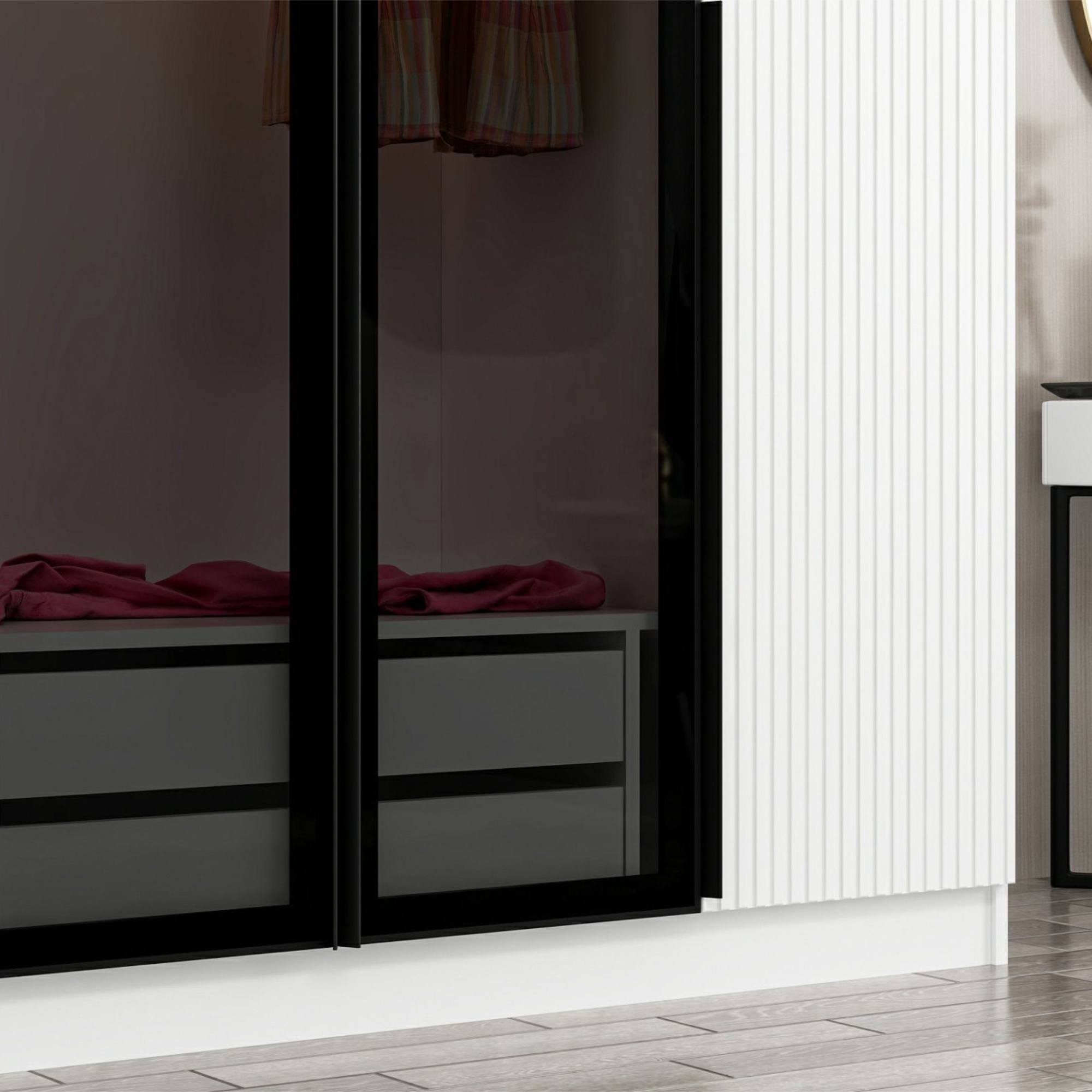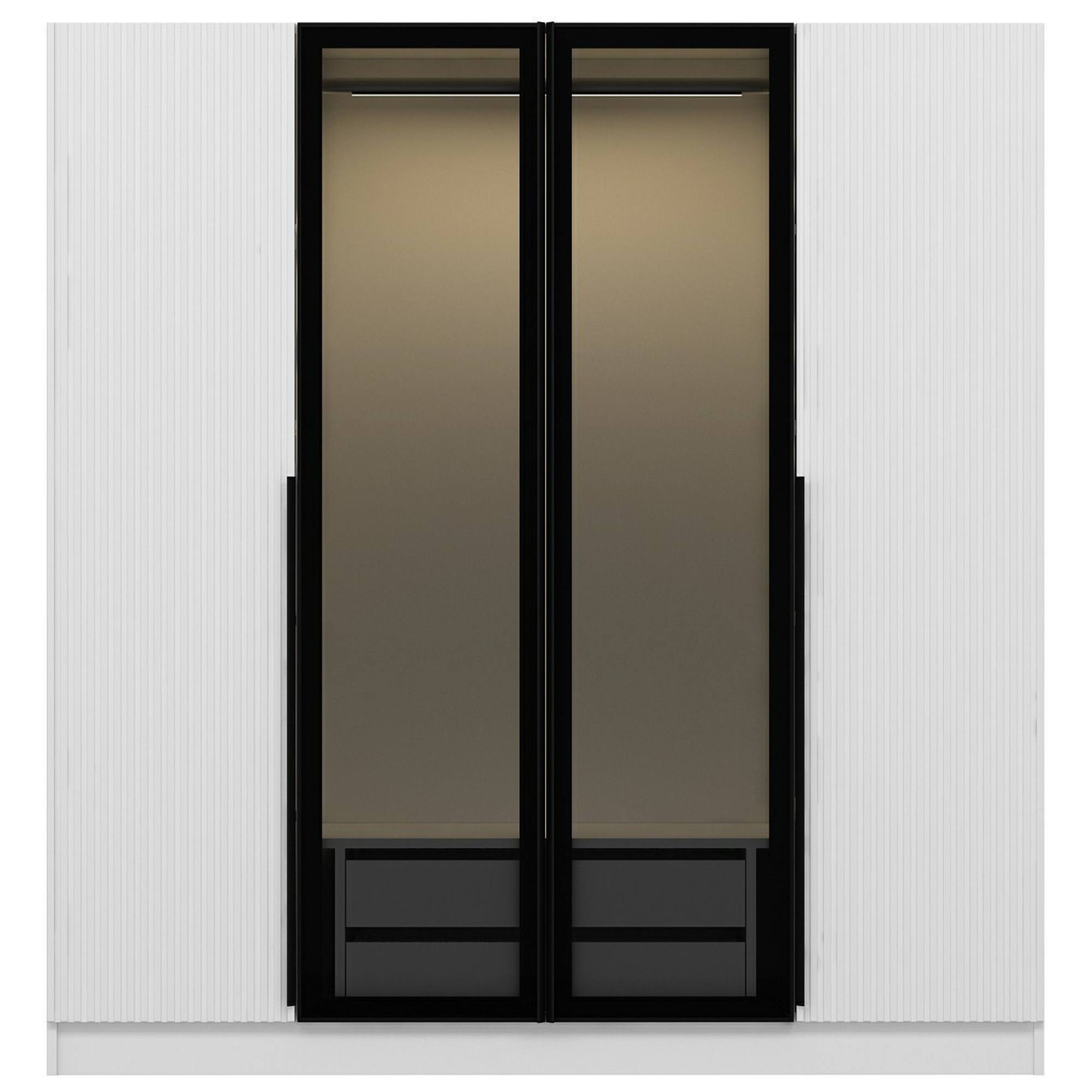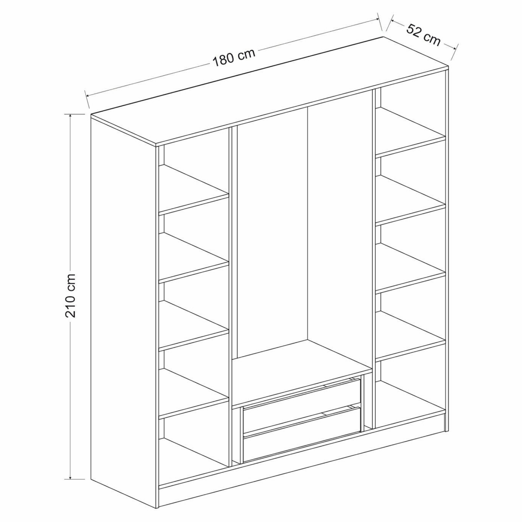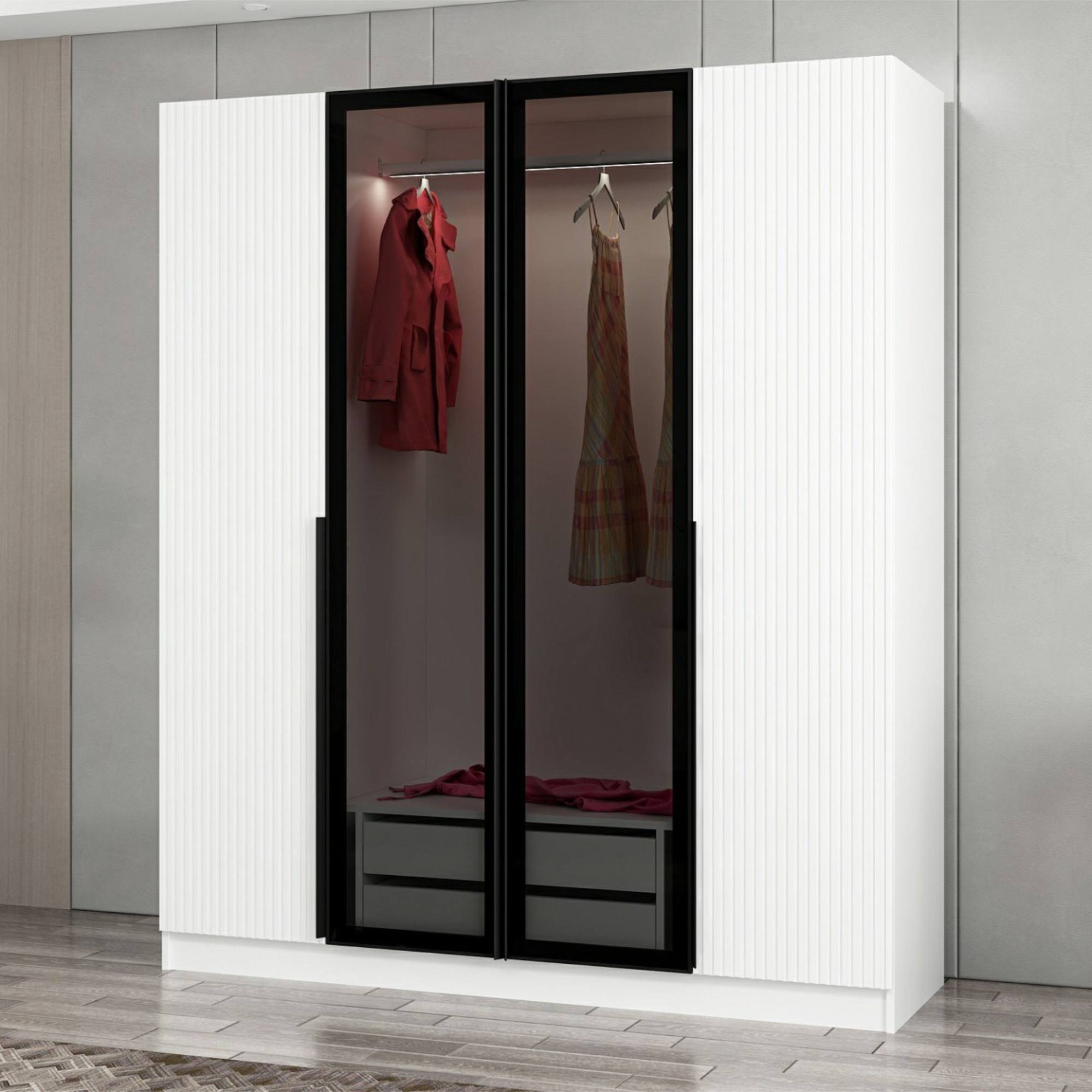Pár otočných dverí uprostred za sebou skrýva prepojený priestor so šatníkovou tyčou na zavesenie krčivých a objemnejších kúskov a 2 zásuvkami na oddelenie drobnejších odevov a doplnkov Za každými samostatnými dverami nájdete 4 vložené police ** na prehľadné skladovanie oblečenia a ďalšieho textilu. Predné plochy 2 stredných dverí sú vyplnené **dymovým sklom, vďaka ktorému je obsah skrine chránený pred okolitými vplyvmi, ale stále zostáva čiastočne na očiach. Sklo je tiež dizajnérskym prvkom, ktorý zaujme na prvý pohľad a robí nábytok jedinečným. Konštrukcia je vyrobená z laminovanej drevotriesky s povrchom nenáročným na údržbu. Skriňa je dodávaná vrátane vnútorného LED osvetlenia.