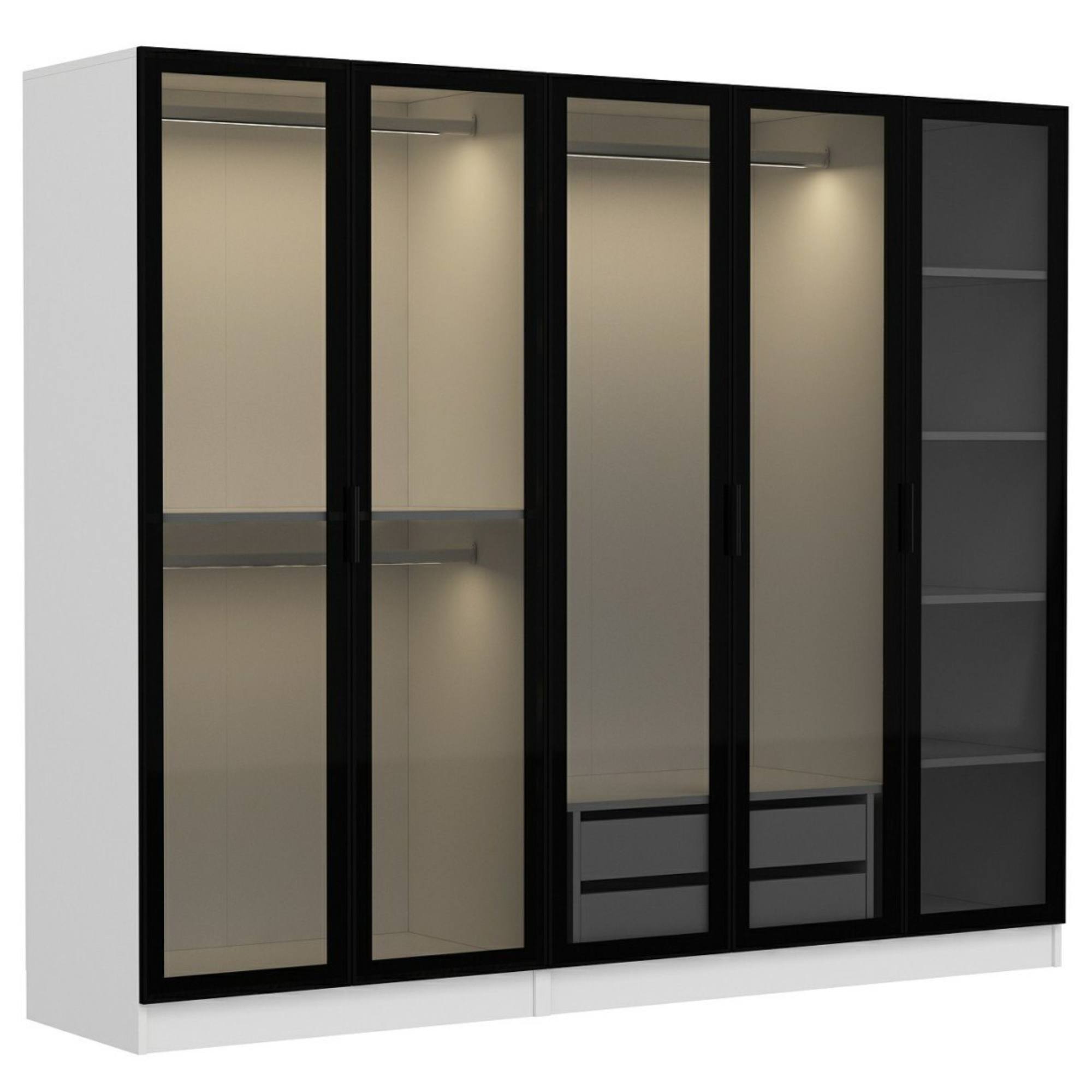 Skriňa je uzatvárateľná pomocou 5 otočných dverí, ktoré sú vybavené nenápadnými rúčkami na jednoduchšiu každodennú manipuláciu. Dvere sú navyše vyplnené dymovým sklom, vďaka ktorému je obsah skrine chránený pred okolitými vplyvmi, ale stále zostáva čiastočne na očiach. Sklo je tiež dizajnérskym prvkom, ktorý zaujme na prvý pohľad a robí nábytok jedinečným. Vnútorné vybavenie pozostáva celkom z 3 šatníkových tyčí, 2 priestranných zásuviek a 5 vložených políc na prehľadné uskladnenie oblečenia a doplnkov s ľahkým prístupom. Konštrukcia skrine je vyrobená z laminovanej drevotriesky s povrchom nenáročným na údržbu. Dodávaná je vrátane vnútorného LED osvetlenia.