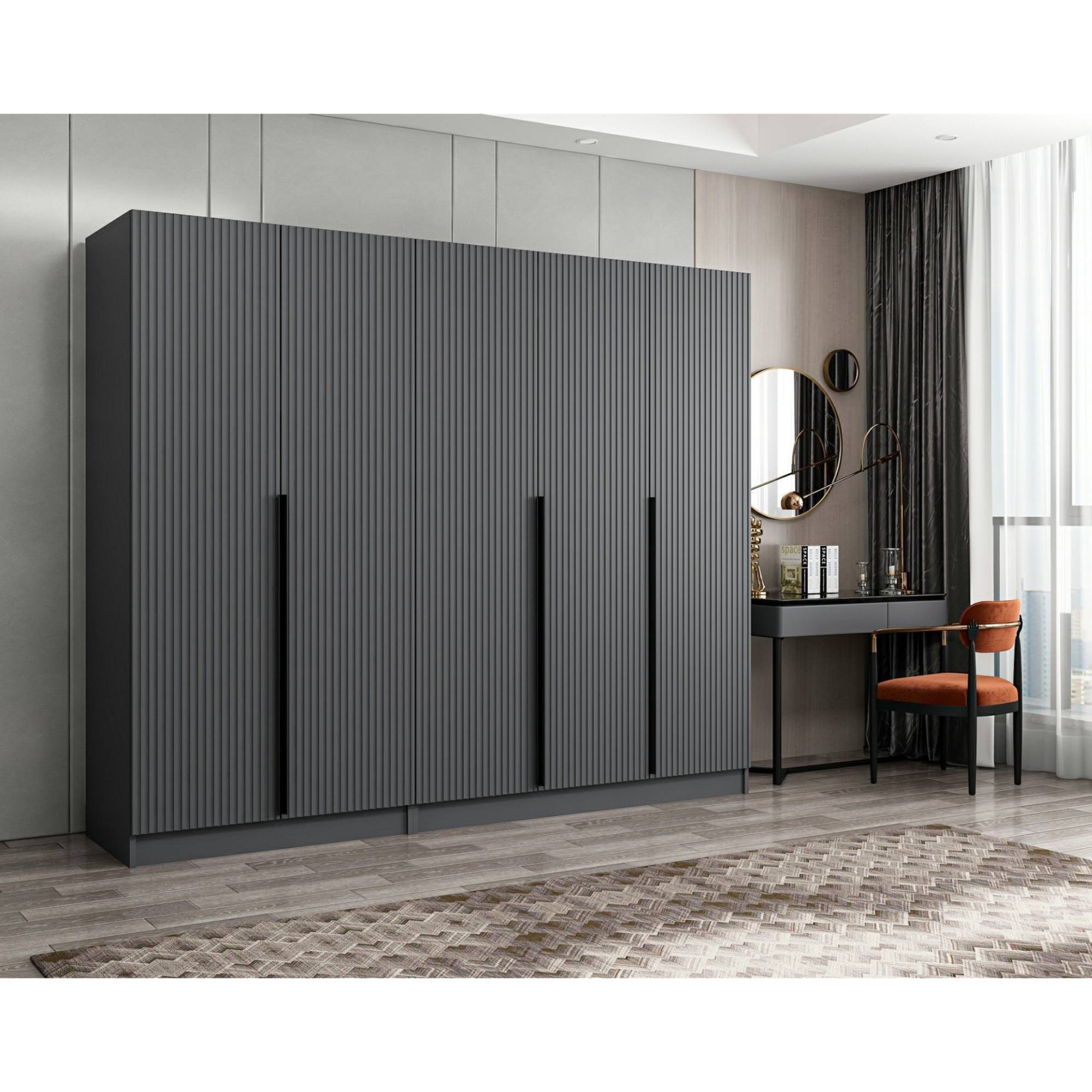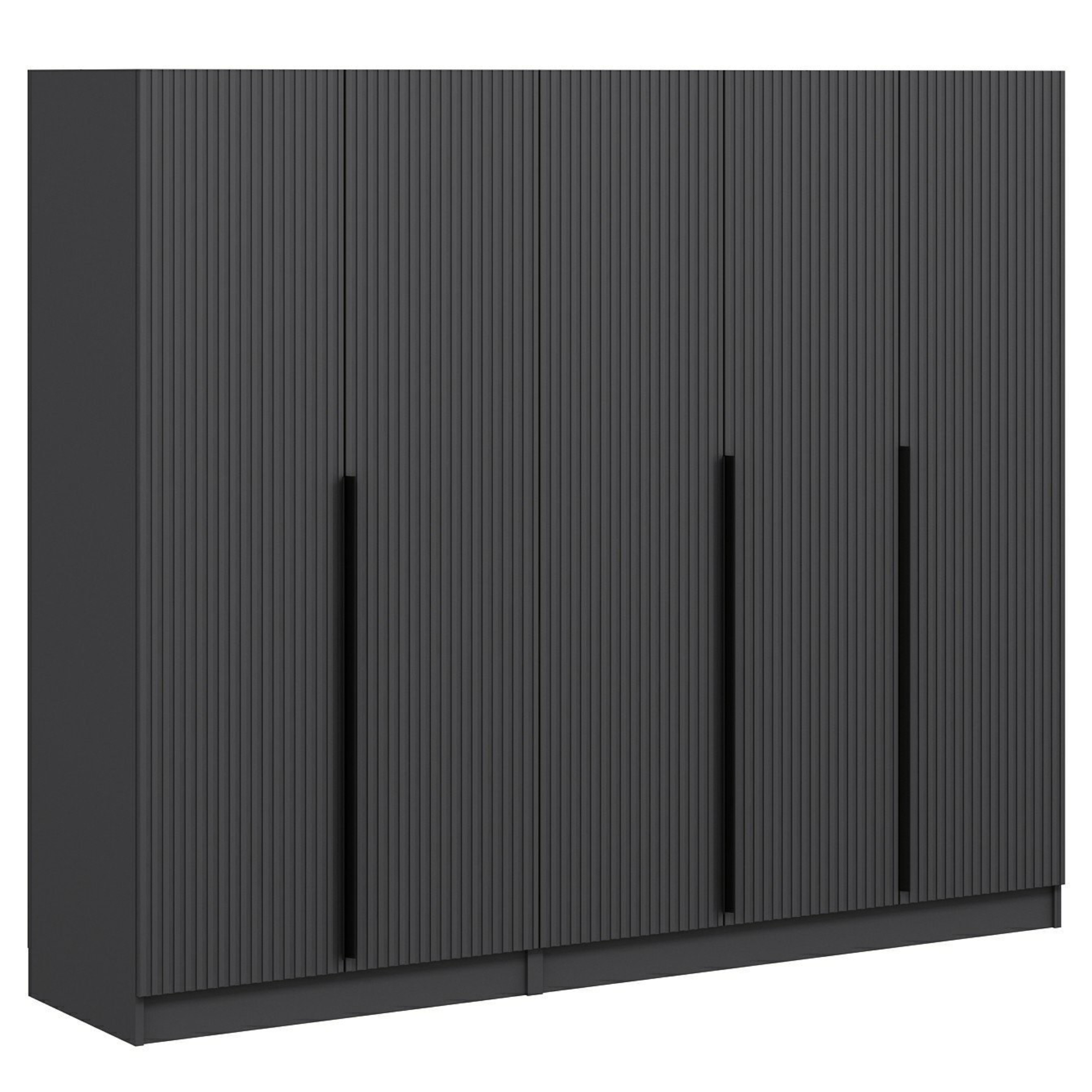 Skriňa je uzatvárateľná pomocou 5 otočných dverí, ktoré sú doplnené o dekoratívne frézovanie a praktické lišty na jednoduchšiu každodennú manipuláciu. Vnútorné vybavenie pozostáva celkom z 3 šatníkových tyčí, 2 priestranných zásuviek a 5 vložených políc na prehľadné uskladnenie oblečenia a doplnkov s ľahkým prístupom. Konštrukcia skrine je vyrobená z laminovanej drevotriesky s povrchom nenáročným na údržbu.