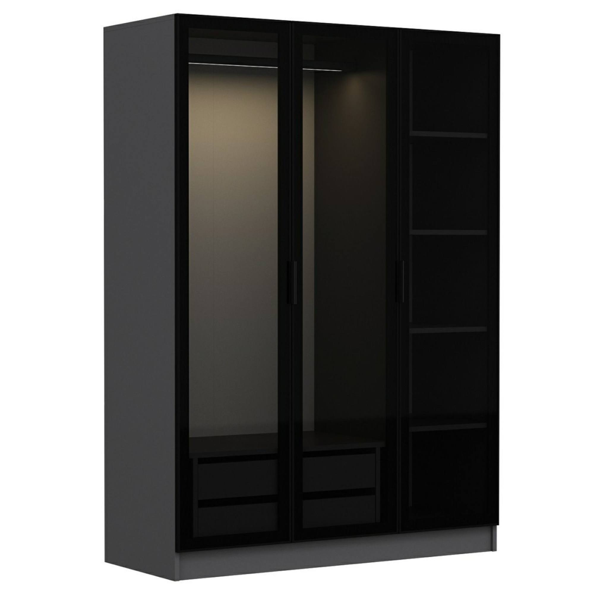 Pár otočných dverí na ľavej strane za sebou skrýva prepojený priestor so šatníkovou tyčou na zavesenie krčivých a objemnejších kúskov a 2 zásuvkami na oddelenie drobnejších odevov a doplnkov. Za samostatnými dverami nájdete 4 vložené police na prehľadné skladovanie oblečenia a ďalšieho textilu. Predné plochy dverí sú vyplnené dymovým sklom, vďaka ktorému je obsah skrine chránený pred okolitými vplyvmi, ale stále zostáva čiastočne na očiach. Sklo je tiež dizajnérskym prvkom, ktorý zaujme na prvý pohľad a robí nábytok jedinečným. Konštrukcia je vyrobená z laminovanej drevotriesky s povrchom nenáročným na údržbu. Skriňa je dodávaná vrátane vnútorného LED osvetlenia.