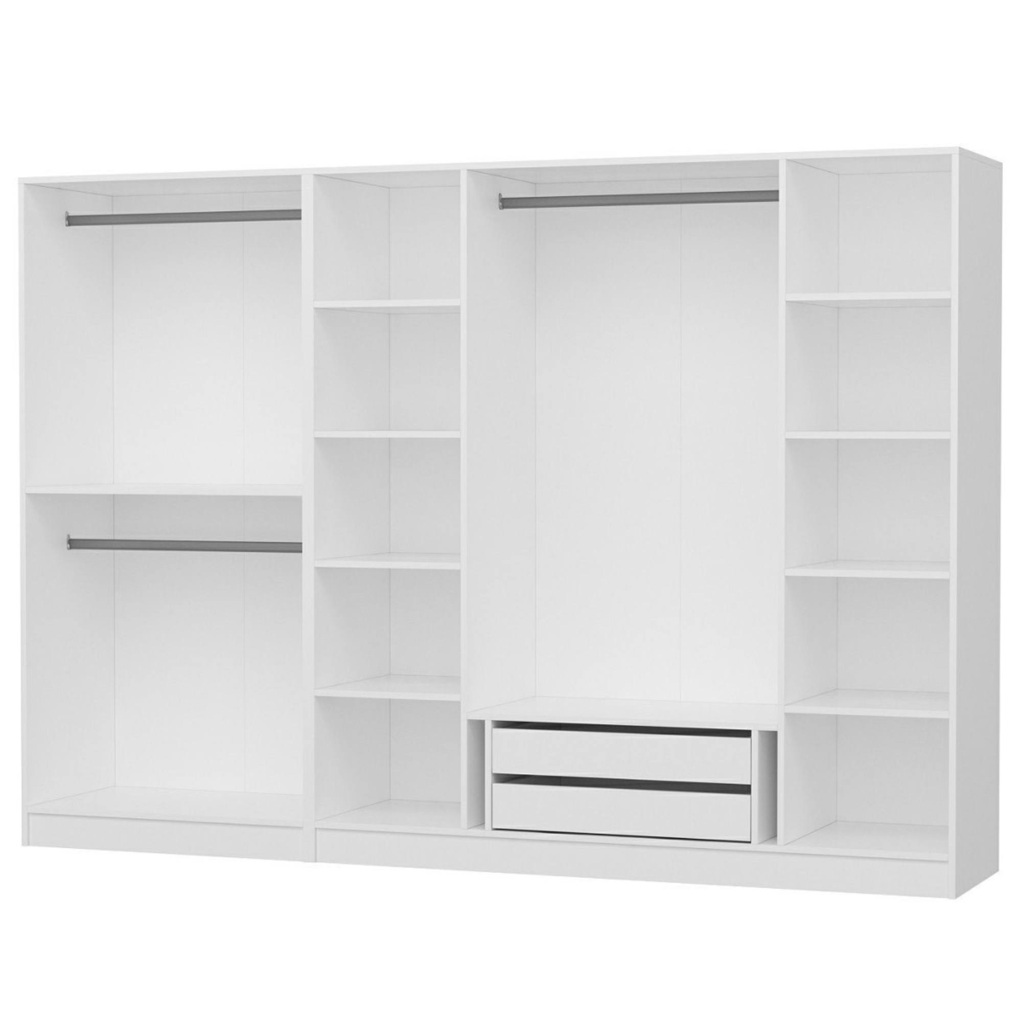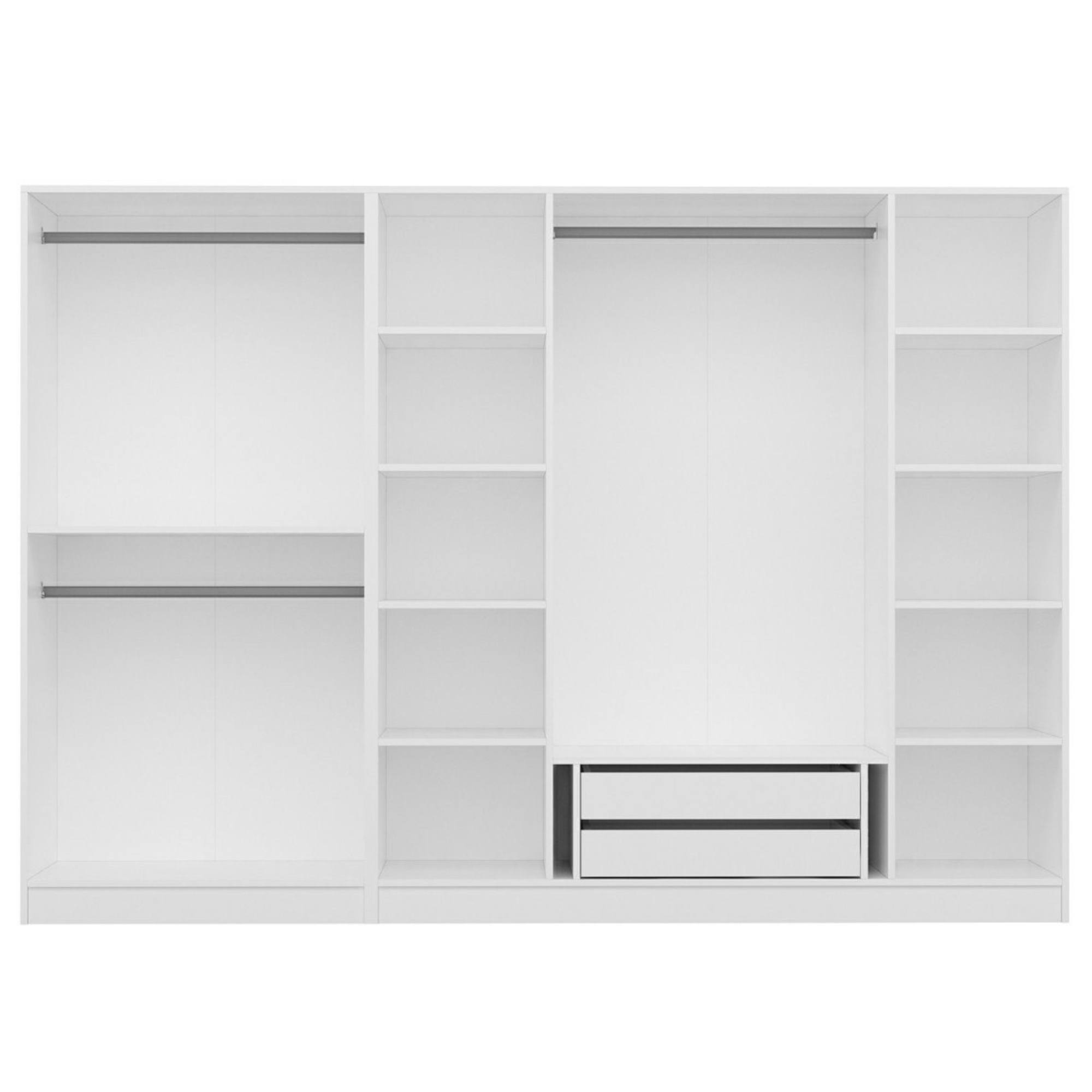 Vnútorné vybavenie pozostáva z 3 šatníkových tyčí na zavesenie krčivých a objemnejších odevov a 2 priestranných zásuviek na oddelenie drobnejších predmetov. Do 8 vložených políc môžete uložiť poskladaný textil. Vďaka otvorenému vyhotoveniu skrine budete mať svoje obľúbené kúsky stále na očiach s ľahkým prístupom. Konštrukcia skrine je vyrobená z laminovanej drevotriesky s povrchom nenáročným na údržbu.