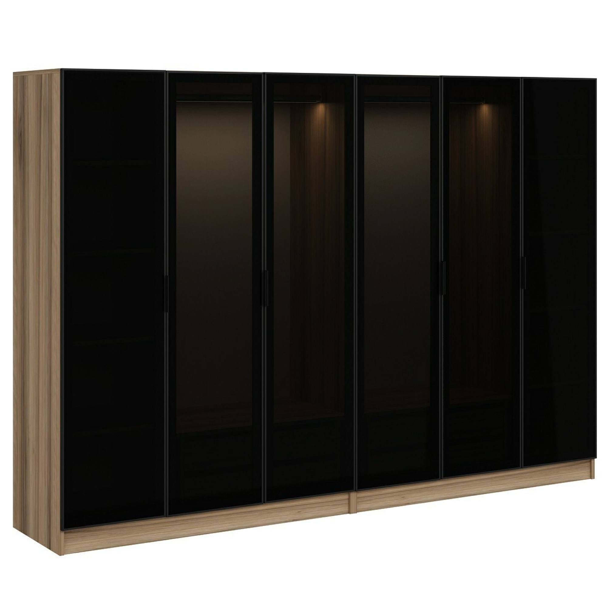 Skriňa je uzatvárateľná pomocou 6 otočných dverí, ktoré sú vybavené nenápadnými rúčkami na jednoduchšiu každodennú manipuláciu. Dvere sú navyše vyplnené dymovým sklom, vďaka ktorému je obsah skrine chránený pred okolitými vplyvmi, ale stále zostáva čiastočne na očiach. Sklo je tiež dizajnovým prvkom, ktorý zaujme na prvý pohľad a robí nábytok jedinečným. Vnútorné vybavenie pozostáva celkom z 2 šatníkových tyčí, 4 priestranných zásuviek a 8 vložených políc na prehľadné uskladnenie oblečenia a doplnkov s ľahkým prístupom. Ich rozmiestnenie si môžete čiastočne zvoliť sami počas montáže. Konštrukcia skrine je vyrobená z laminovanej drevotriesky s povrchom nenáročným na údržbu. Dodávaná je vrátane vnútorného LED osvetlenia.
