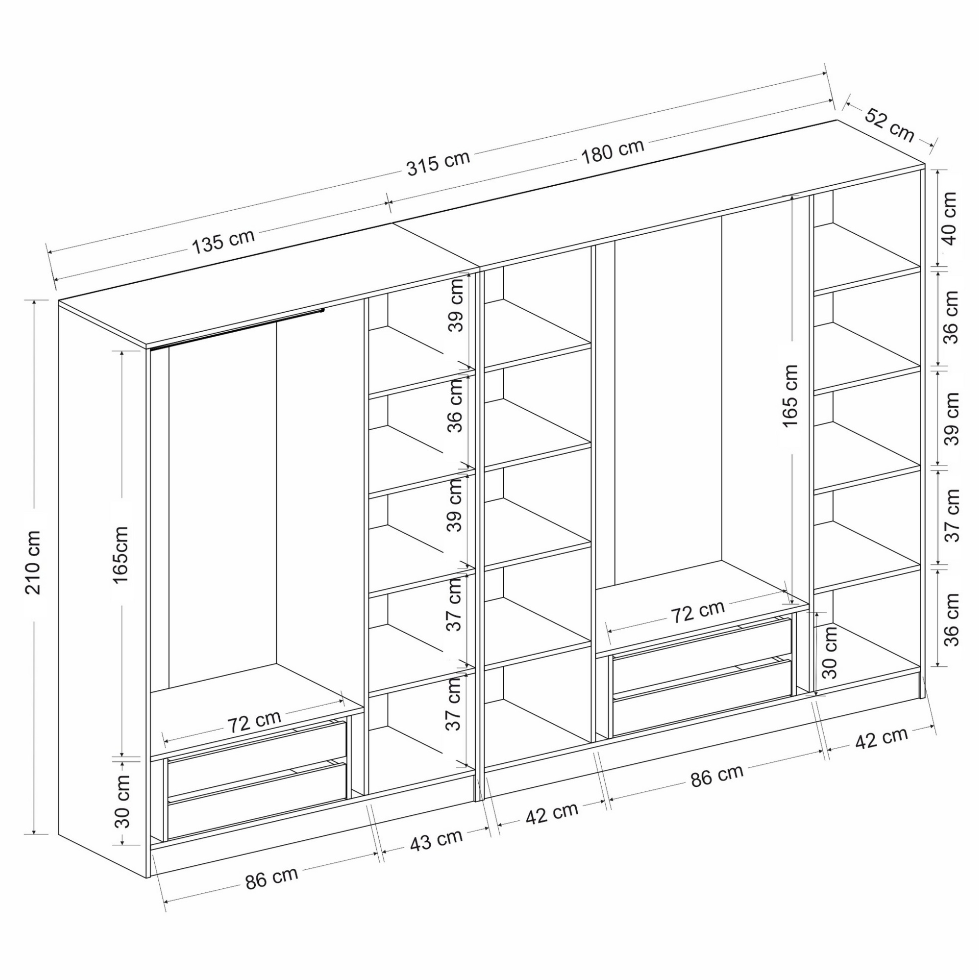 - 2 šatníkové tyče, 4 zásuvky a 12 vložených políc