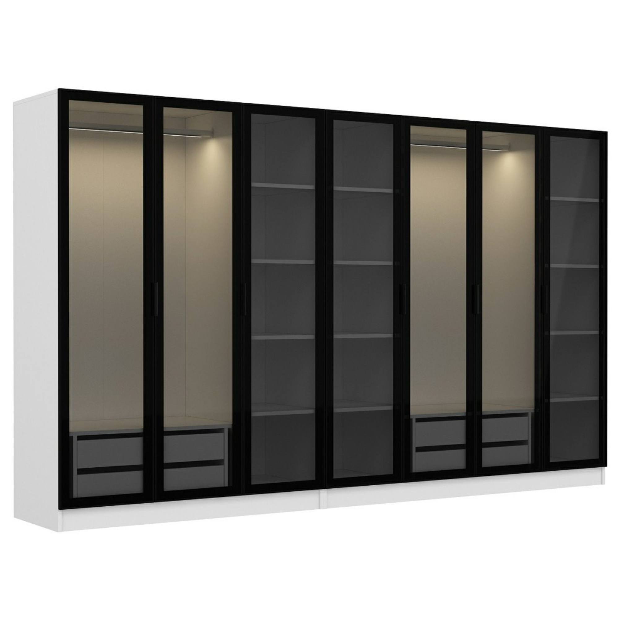 Skriňa je uzatvárateľná pomocou 7 otočných dverí, ktoré sú vybavené nenápadnými rúčkami na jednoduchšiu každodennú manipuláciu. Dvere sú navyše vyplnené dymovým sklom, vďaka ktorému je obsah skrine chránený pred okolitými vplyvmi, ale stále zostáva čiastočne na očiach. Sklo je tiež dizajnovým prvkom, ktorý zaujme na prvý pohľad a robí nábytok jedinečným. Vnútorné vybavenie pozostáva celkom z 2 šatníkových tyčí, 4 priestranných zásuviek a 12 vložených políc na prehľadné uskladnenie oblečenia a doplnkov s ľahkým prístupom. Konštrukcia skrine je vyrobená z laminovanej drevotriesky s povrchom nenáročným na údržbu. Dodávaná je vrátane vnútorného LED osvetlenia.