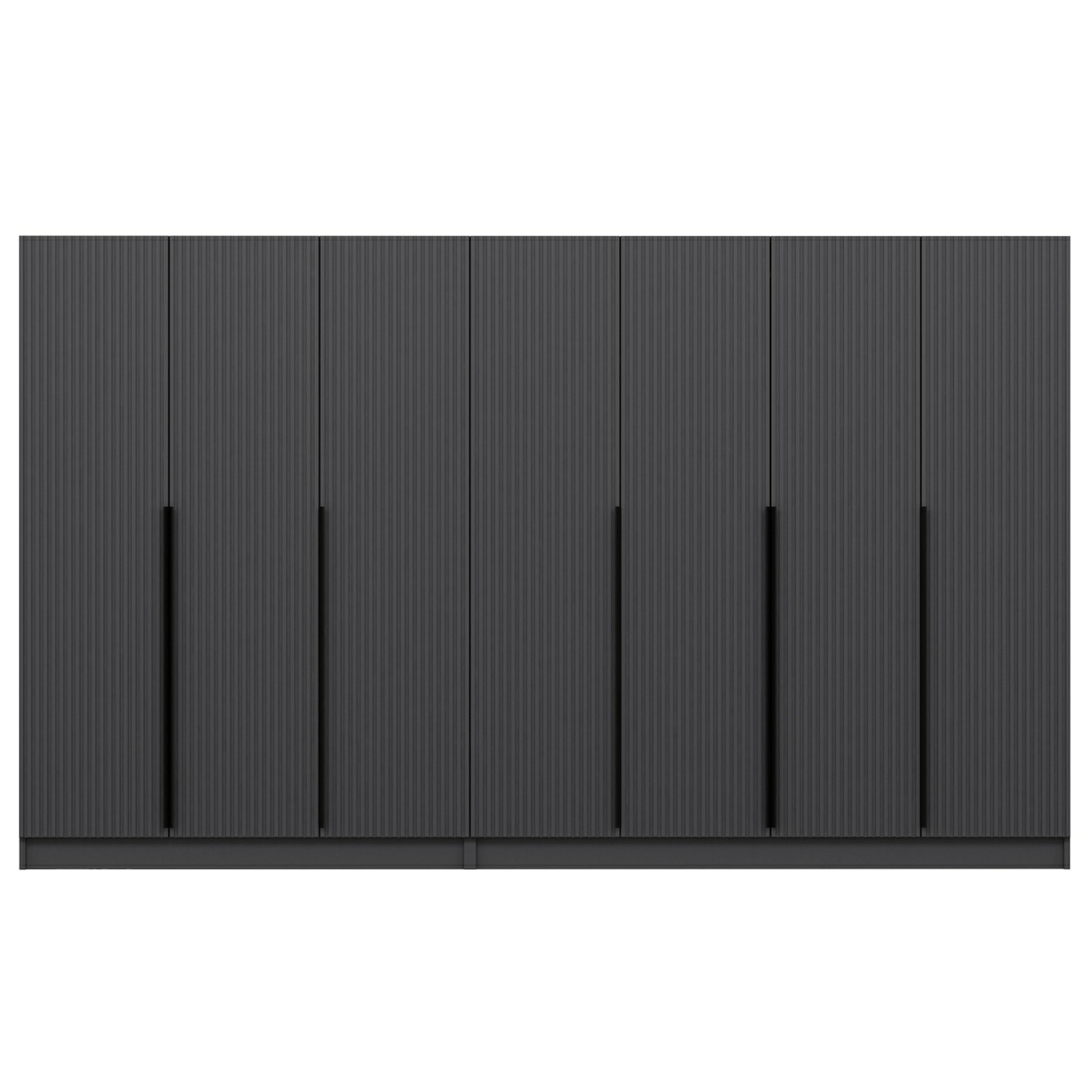 Skriňa je uzatvárateľná pomocou 7 otočných dverí, ktoré sú doplnené o dekoratívne frézovanie a praktické lišty na jednoduchšiu každodennú manipuláciu. Vnútorné vybavenie pozostáva celkom z 2 šatníkových tyčí, 4 priestranných zásuviek a 12 vložených políc na prehľadné uskladnenie oblečenia a doplnkov s ľahkým prístupom. Konštrukcia skrine je vyrobená z laminovanej drevotriesky s povrchom nenáročným na údržbu.