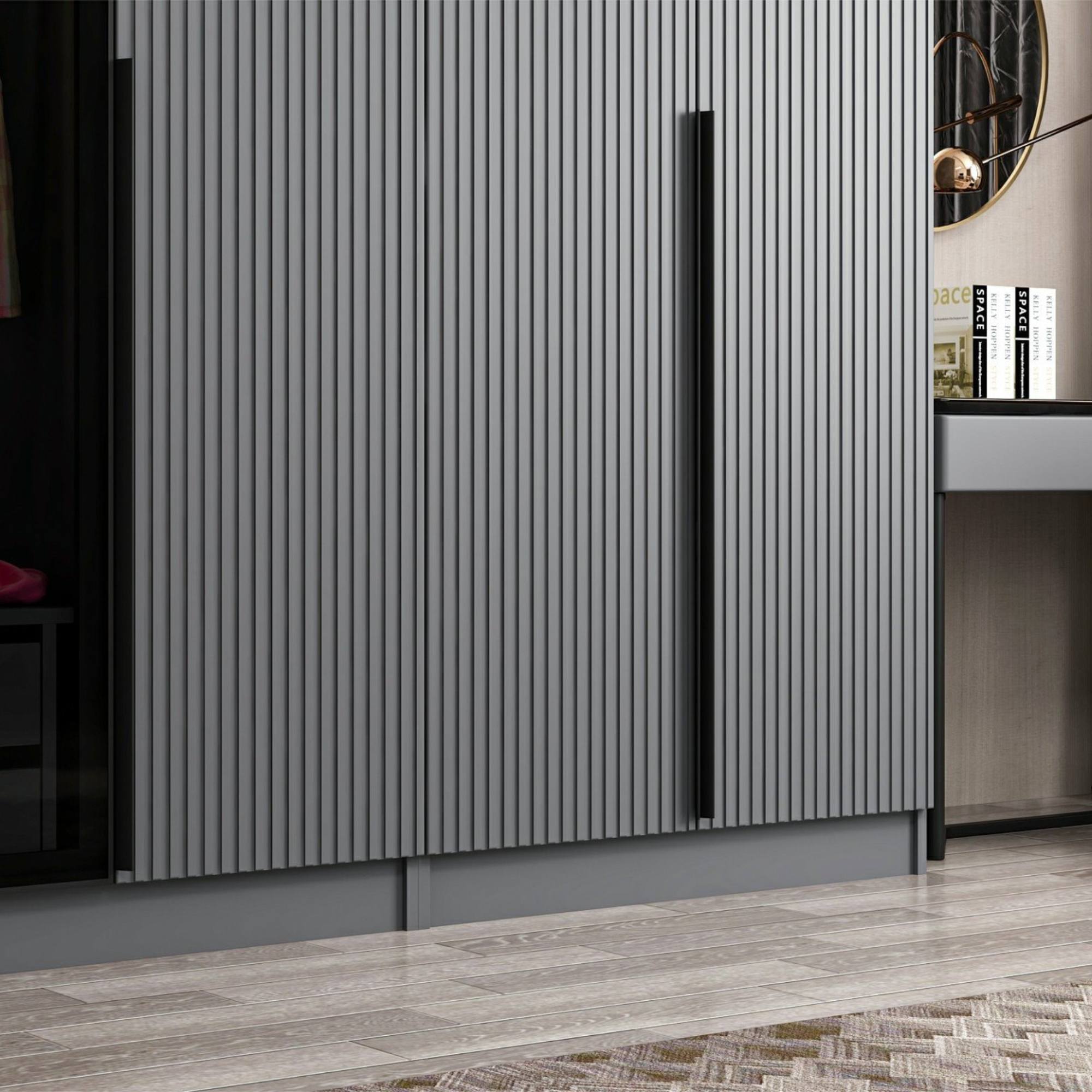 Skriňa je uzatvárateľná pomocou 7 otočných dverí, ktoré sú vybavené praktickými lištami na jednoduchšiu každodennú manipuláciu. Dvoje dvere sú navyše vyplnené dymovým sklom, vďaka ktorému je obsah skrine chránený pred okolitými vplyvmi, ale stále zostáva čiastočne na očiach. Sklo je tiež dizajnovým prvkom, ktorý zaujme na prvý pohľad a robí nábytok jedinečným. Vnútorné vybavenie pozostáva celkom z 5 šatníkových tyčí, 2 priestranných zásuviek a 6 vložených políc na prehľadné uskladnenie oblečenia a doplnkov s ľahkým prístupom. Konštrukcia skrine je vyrobená z laminovanej drevotriesky s povrchom nenáročným na údržbu. Dodávaná je vrátane vnútorného LED osvetlenia.