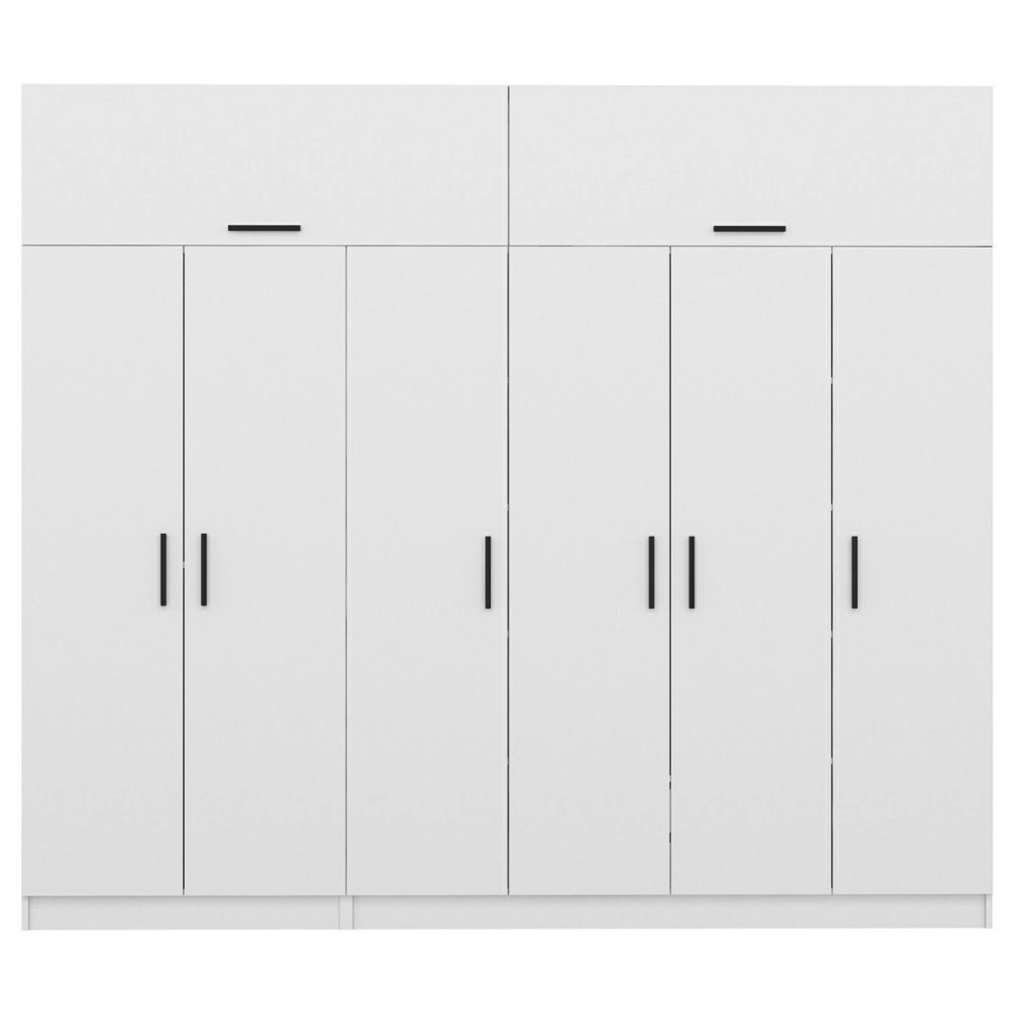 Skriňu uzatvára 6 otočných a 2 výklopné dvere, vďaka ktorým môžete maximálne využiť vnútorný priestor. Ich predné plochy sú doplnené o plastové rúčky na ľahšiu každodennú manipuláciu. Vnútorné vybavenie pozostáva celkom z 3 šatníkových tyčí, 2 priestranných zásuviek a 8 vložených políc. Konštrukcia skrine je vyrobená z laminovanej drevotriesky s povrchom nenáročným na údržbu.