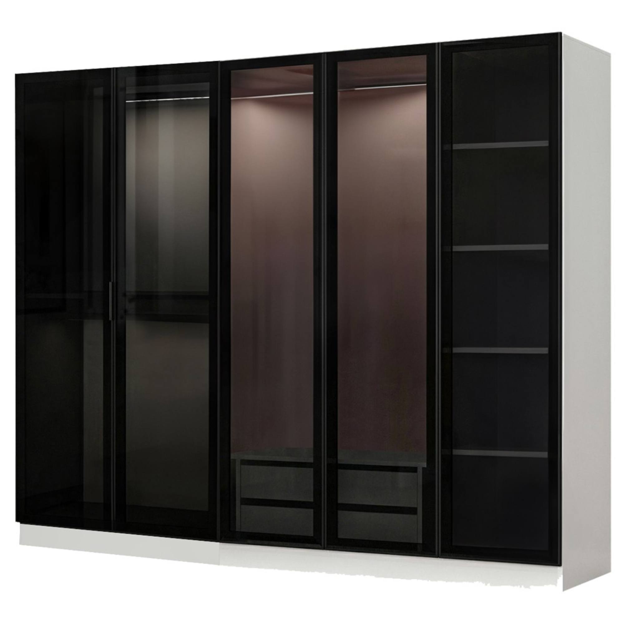 Skriňa je uzatvárateľná pomocou 5 otočných dverí, ktoré sú vybavené nenápadnými rúčkami na jednoduchšiu každodennú manipuláciu. Dvere sú navyše vyplnené dymovým sklom, vďaka ktorému je obsah skrine chránený pred okolitými vplyvmi, ale stále zostáva čiastočne na očiach. Sklo je tiež dizajnérskym prvkom, ktorý zaujme na prvý pohľad a robí nábytok jedinečným. Vnútorné vybavenie pozostáva celkom z 3 šatníkových tyčí, 2 priestranných zásuviek a 5 vložených políc na prehľadné uskladnenie oblečenia a doplnkov s ľahkým prístupom. Konštrukcia skrine je vyrobená z laminovanej drevotriesky s povrchom nenáročným na údržbu. Dodávaná je vrátane vnútorného LED osvetlenia.