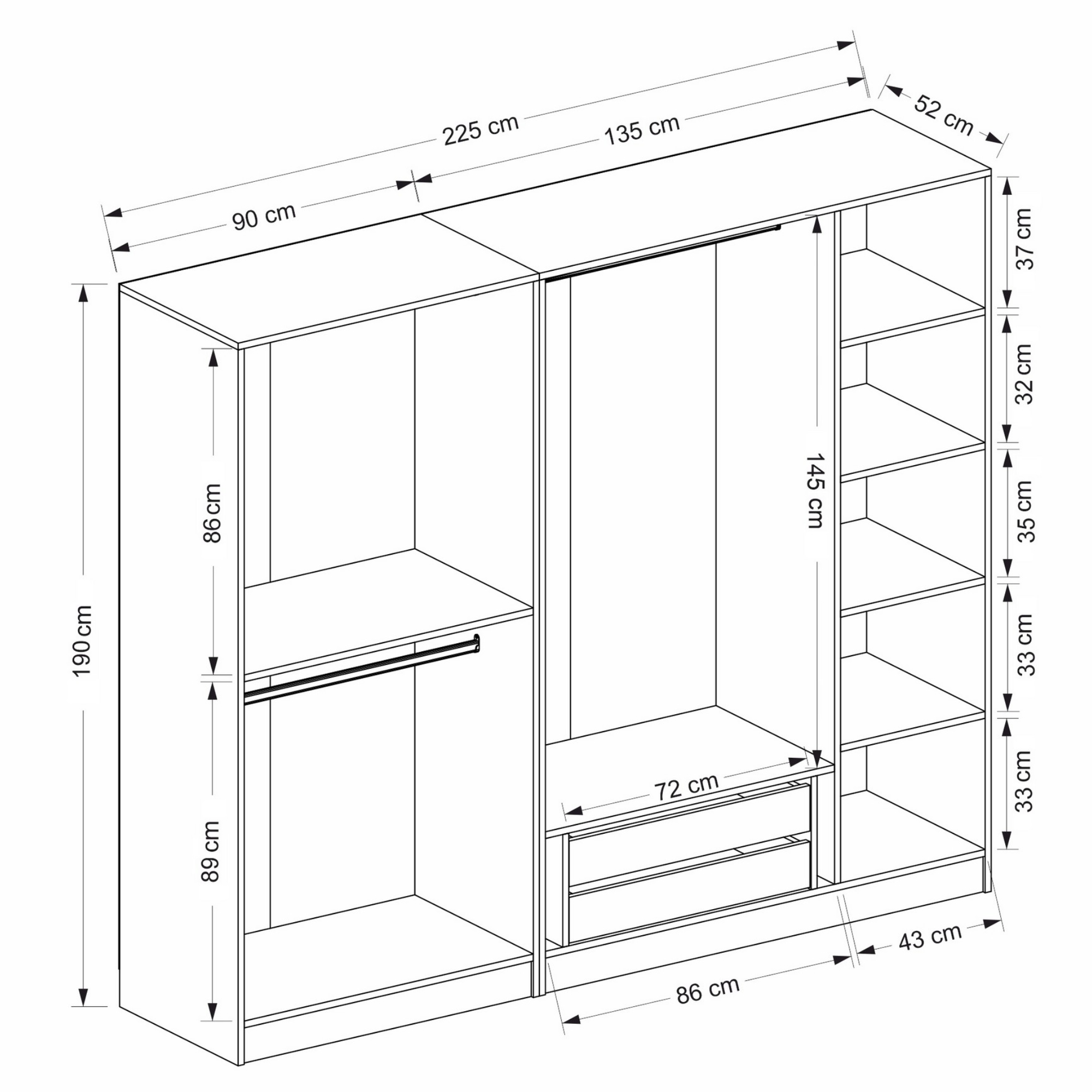 - 3 šatníkové tyče, 2 zásuvky a 5 vložených políc