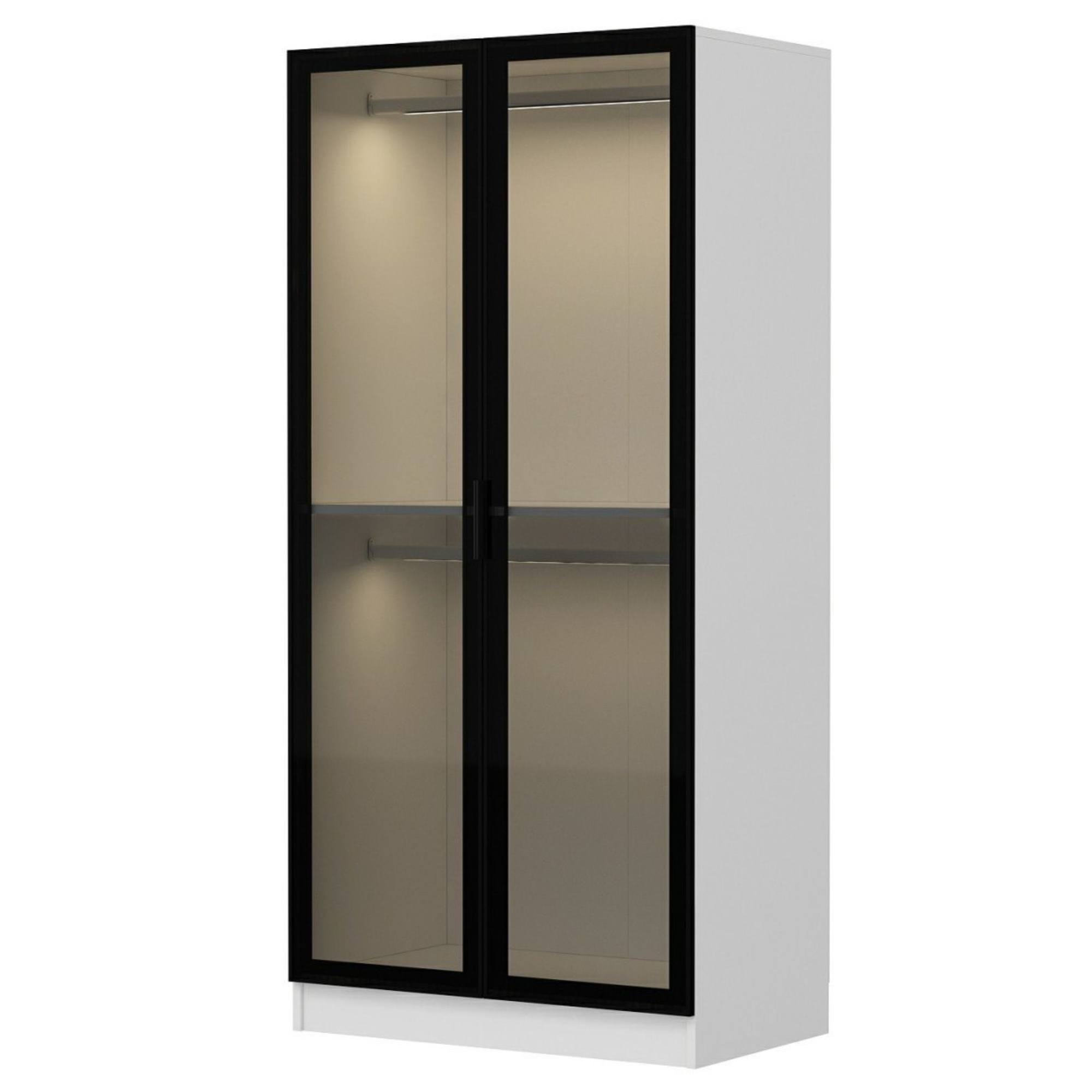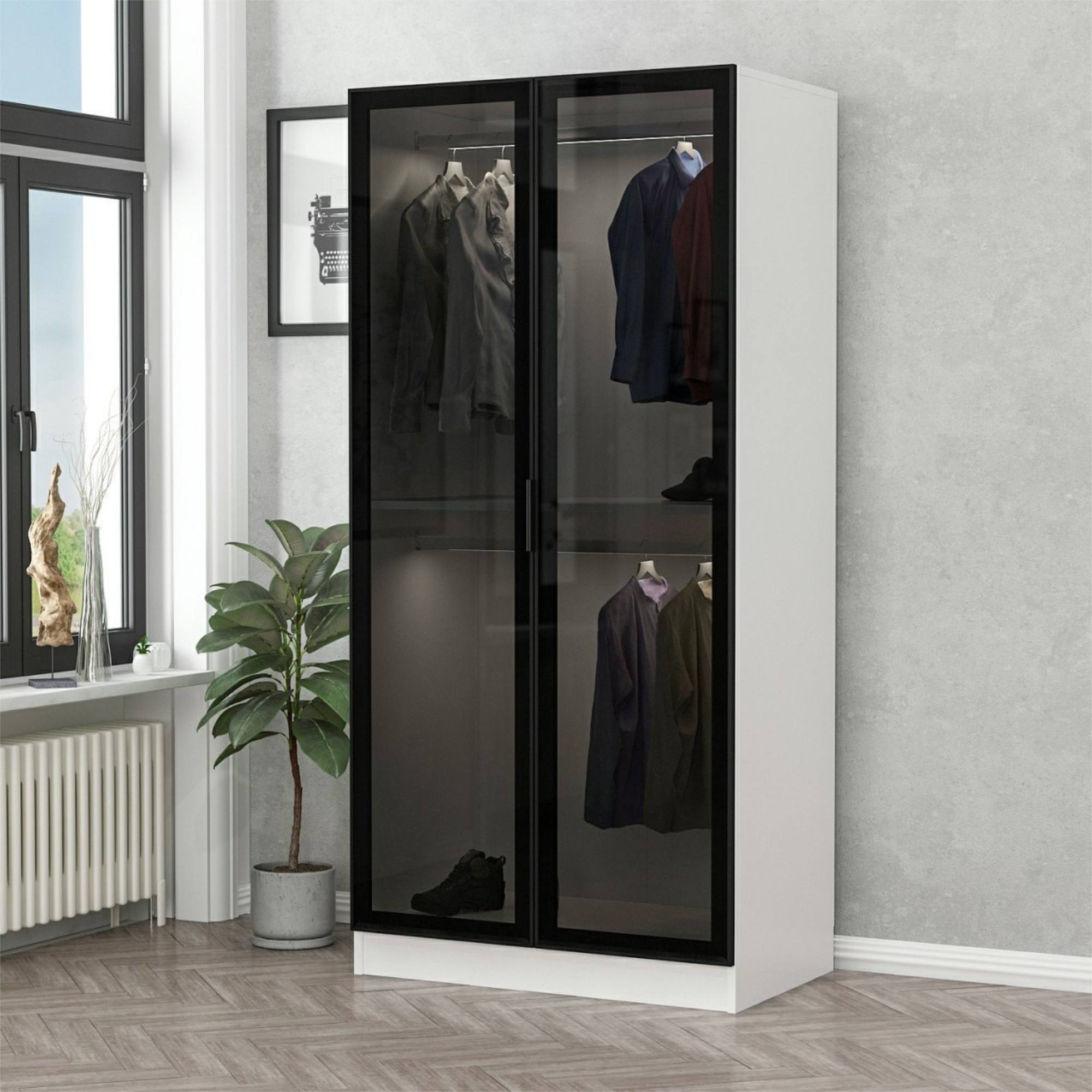 Skriňa je uzatvárateľná pomocou páru otočných dverí, ktoré sú vybavené nenápadnou rúčkou na jednoduchšiu každodennú manipuláciu. Dvere sú navyše vyplnené dymovým sklom, vďaka ktorému je obsah skrine chránený pred okolitými vplyvmi, ale stále zostáva čiastočne na očiach. Sklo je tiež dizajnérskym prvkom, ktorý zaujme na prvý pohľad a robí nábytok jedinečným. Jednoducho riešené vnútorné vybavenie pozostáva z 2 nad sebou uložených šatníkových tyčí na prehľadné zavesenie odevov s ľahkým prístupom. Konštrukcia je vyrobená z laminovanej drevotriesky s povrchom nenáročným na údržbu. Skriňa je dodávaná vrátane vnútorného LED osvetlenia.