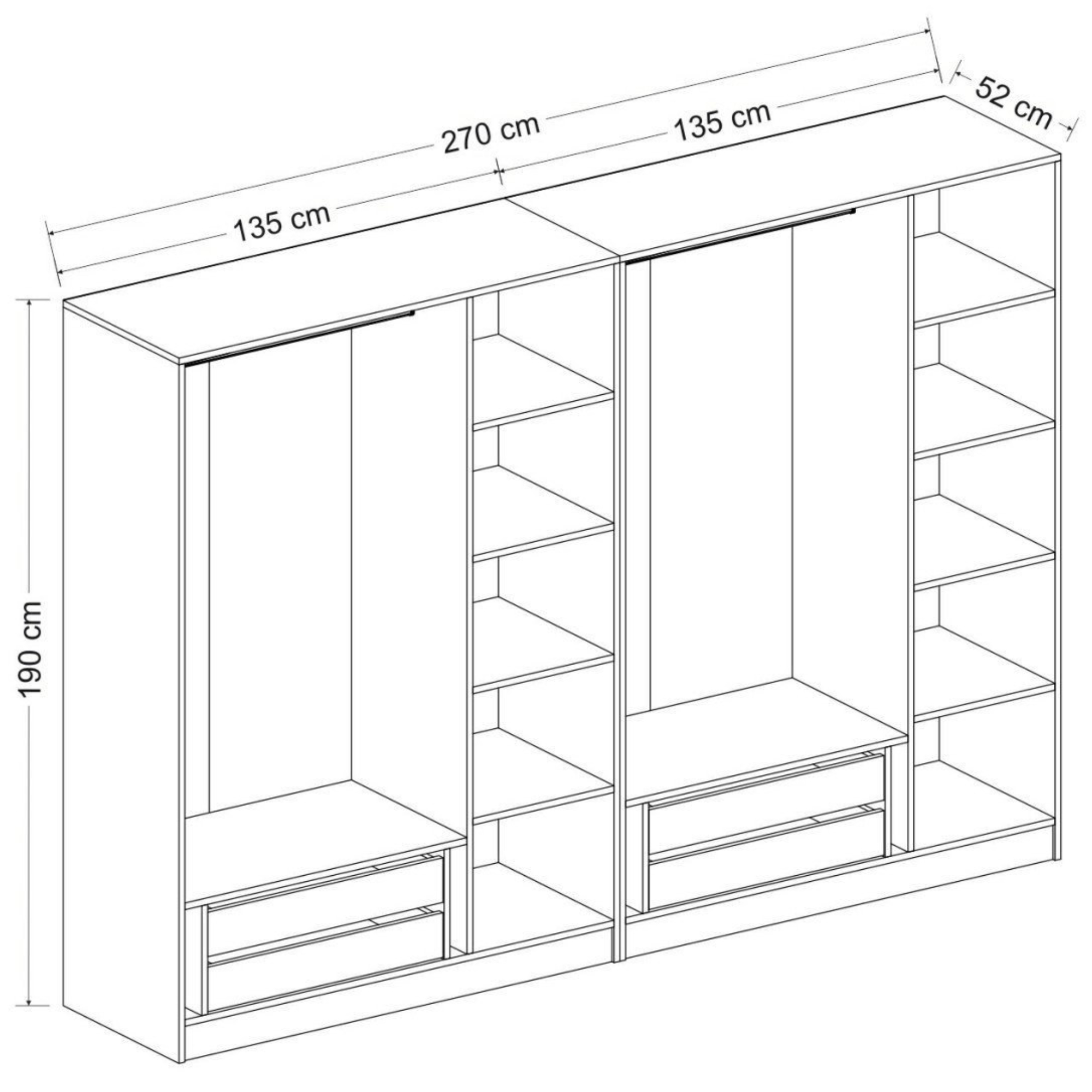 Vnútorné vybavenie pozostáva z 2 šatníkových tyčí na zavesenie krčivých a objemnejších odevov a 4 priestranných zásuviek na oddelenie drobnejších predmetov. Do 8 vložených políc môžete uložiť poskladaný textil. Vďaka otvorenému vyhotoveniu skrine budete mať svoje obľúbené kúsky stále na očiach s ľahkým prístupom. Ich rozmiestnenie si môžete čiastočne zvoliť sami počas montáže. Konštrukcia skrine je vyrobená z laminovanej drevotriesky s povrchom nenáročným na údržbu.