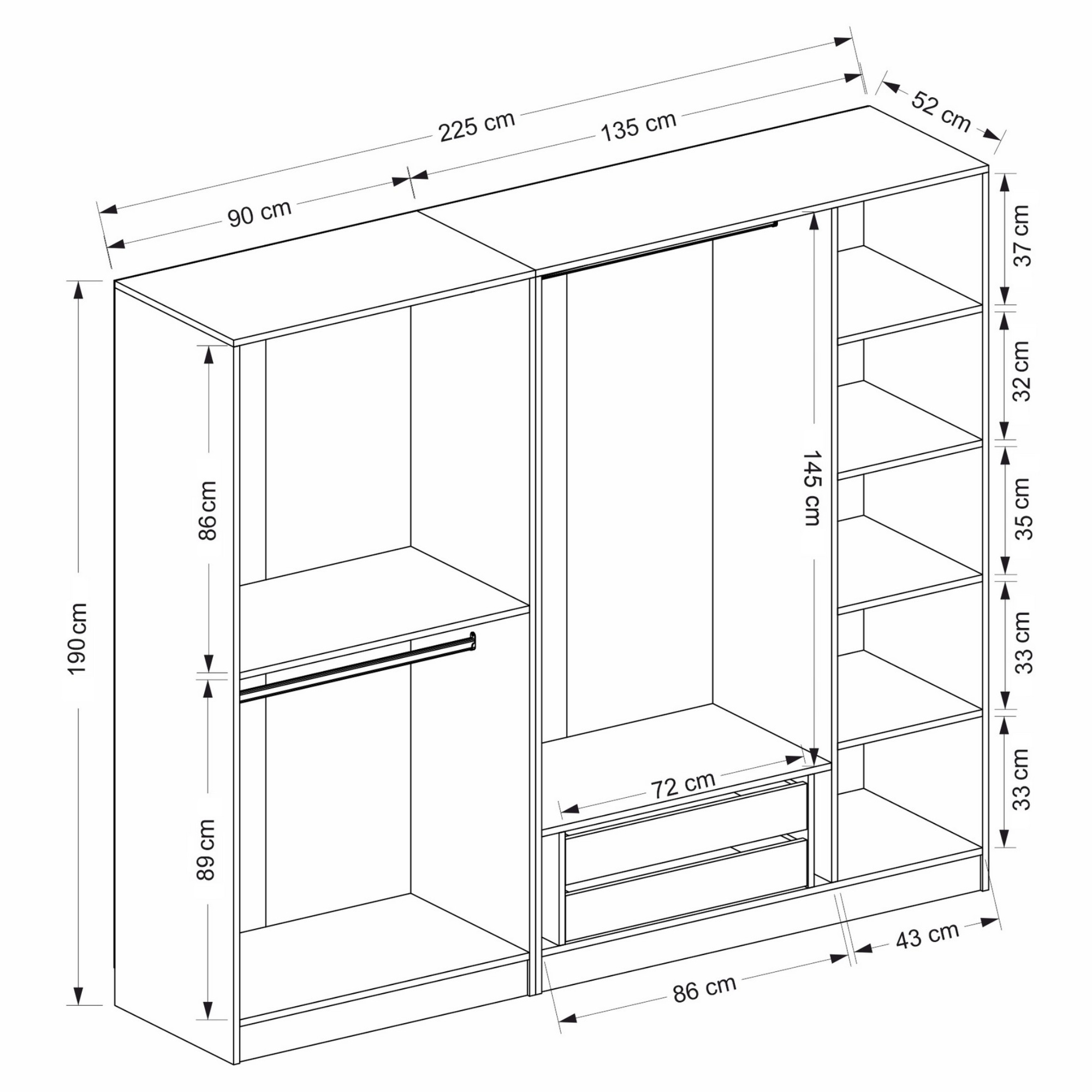 Vnútorné vybavenie pozostáva z 3 šatníkových tyčí na zavesenie krčivých a objemnejších odevov a 2 priestranných zásuviek na oddelenie drobnejších predmetov. Do 4 vložených políc môžete uložiť poskladaný textil. Vďaka otvorenému vyhotoveniu skrine budete mať svoje obľúbené kúsky stále na očiach s ľahkým prístupom. Konštrukcia skrine je vyrobená z laminovanej drevotriesky s povrchom nenáročným na údržbu.