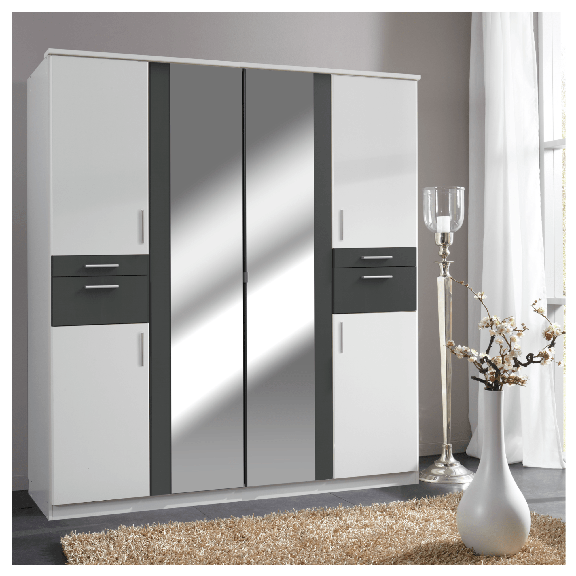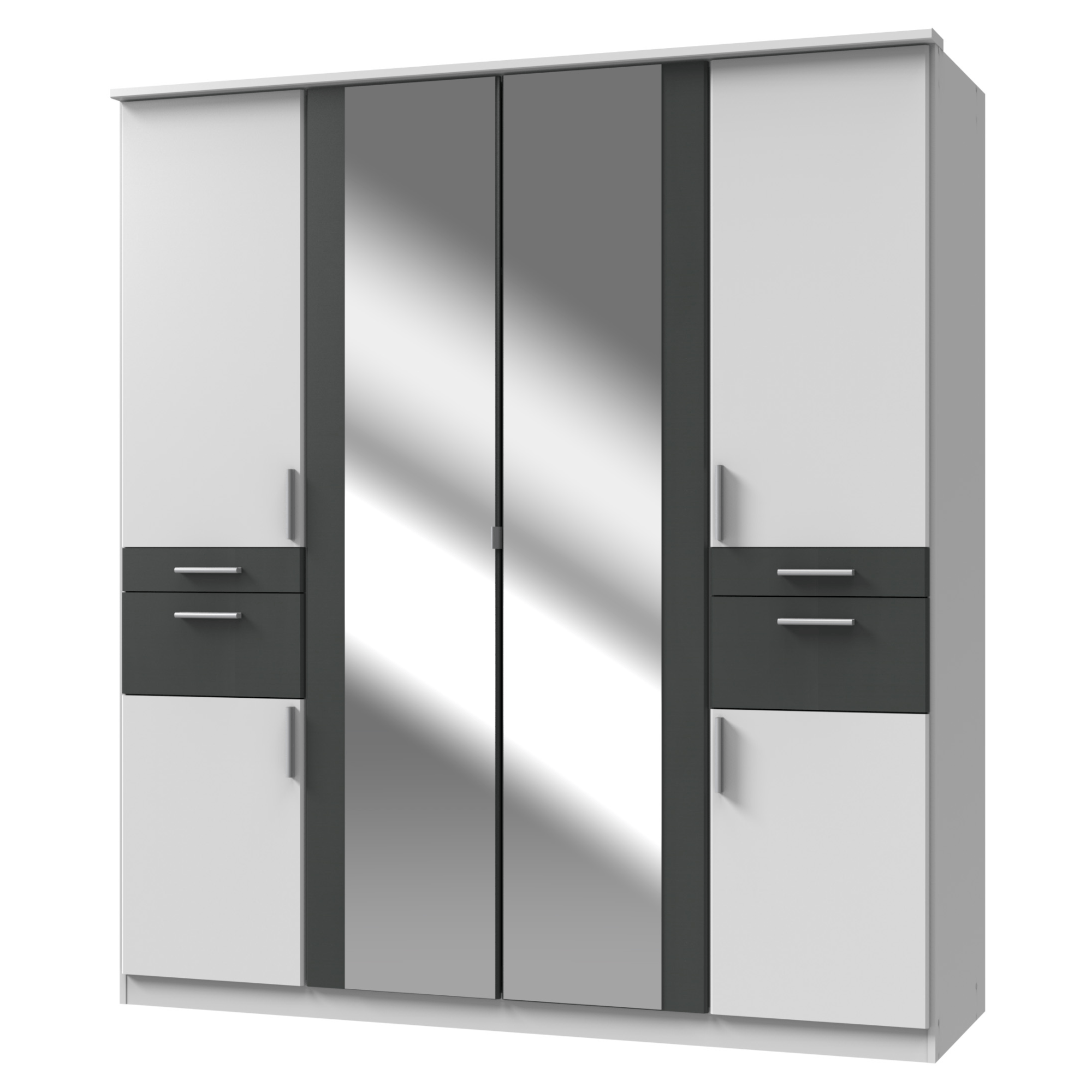 Skriňu uzatvára 6 otočných dverí, ktoré umožňujú maximálne využitie vnútorného priestoru. 2 prostredné dvere sú vyplnené zrkadlami, v ktorých si môžete kedykoľvek skontrolovať svoj vzhľad a tiež pomôžu opticky zväčšiť a presvetliť miestnosť. Za týmto párom dverí sa nachádza prepojený priestor s 1 vloženou policou a 1 šatníkovou tyčou. Ľavá strana, rovnako ako tá pravá, obsahuje 2 otočné dvere a 2 praktické zásuvky. Za každými vrchnými dverami sa nachádza šatníková tyč a za spodnými vložená polica. Všetky predné plochy sú doplnené o výrazné rúčky, ktoré uľahčia každodennú manipuláciu. Skriňa je vyrobená z laminovaného dreveného materiálu.