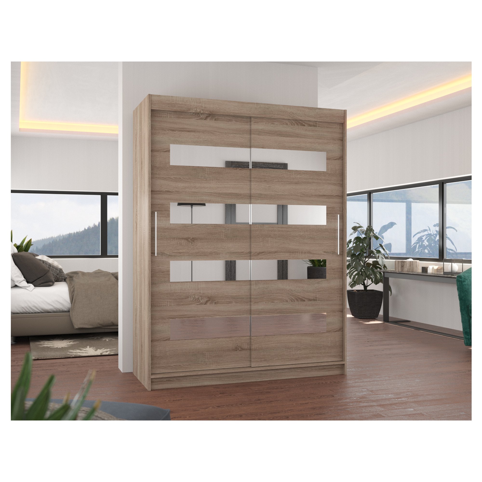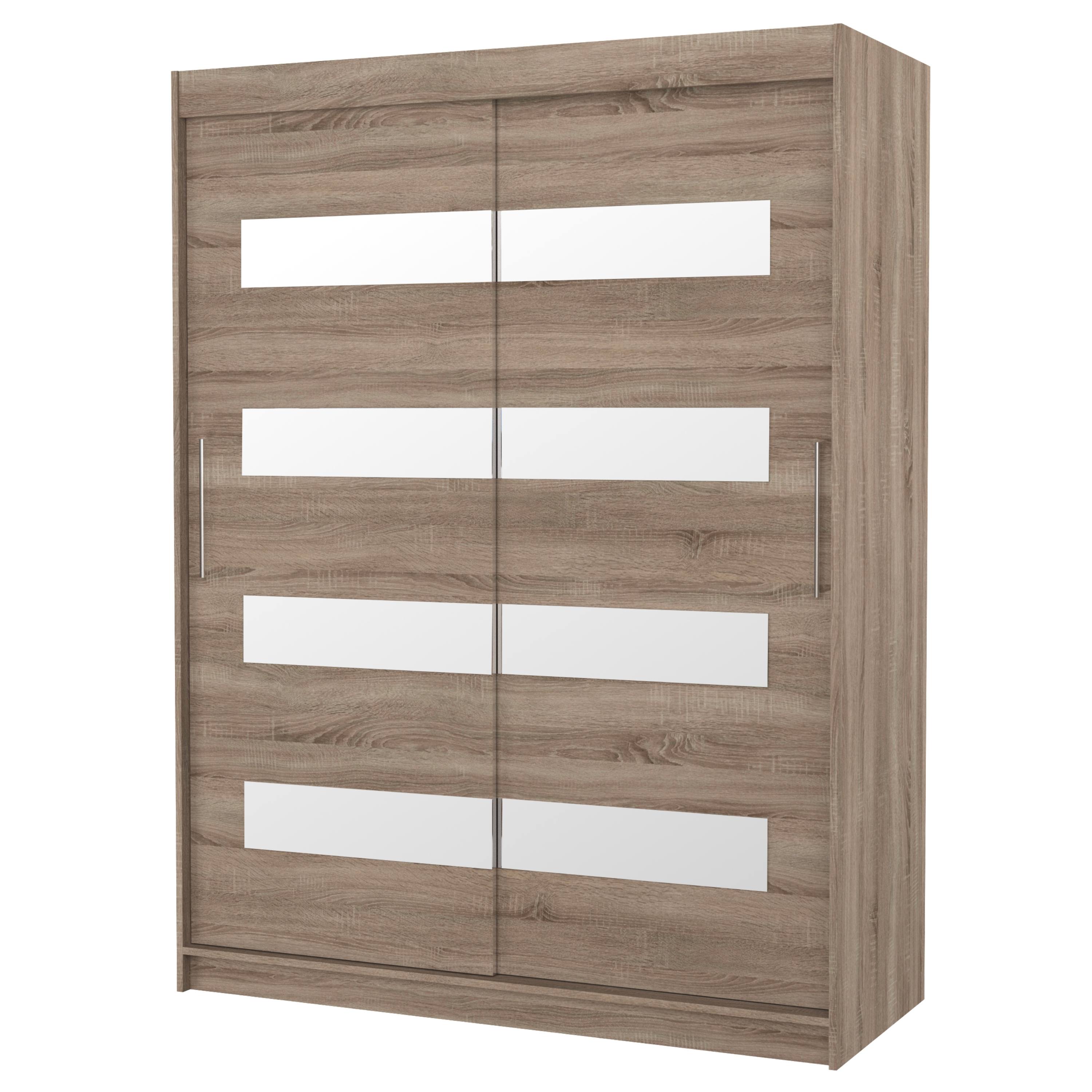 Disponuje posuvnými dverami s hliníkovými vodiacimi lištami pre pohodlné otváranie, ktoré zároveň šetrí miesto. Dvere skrine sú doplnené zrkadlovými pruhmi, ktoré slúžia ako štýlová a zároveň praktická dekorácia.
