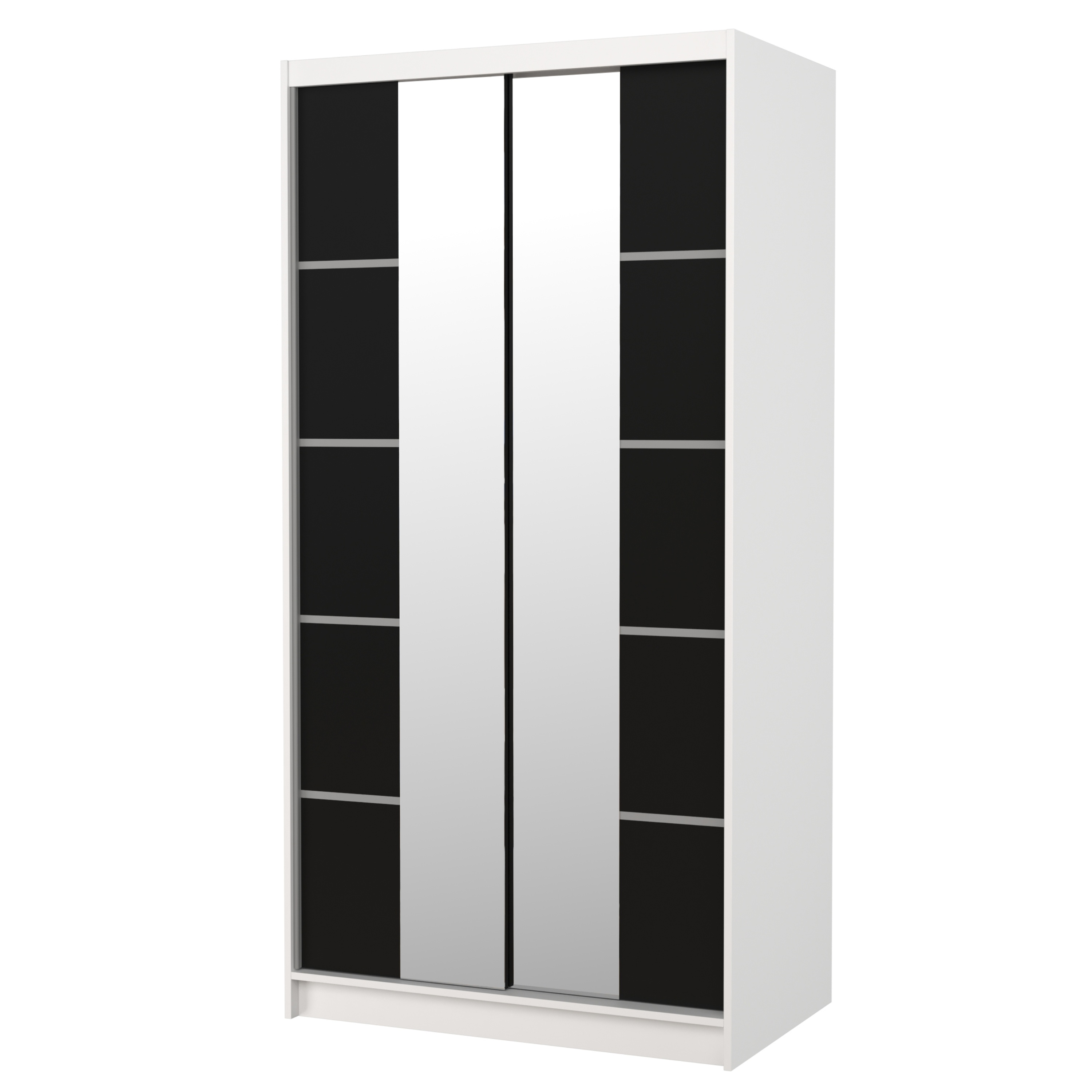 Skriňa je vybavená párom posuvných dverí, ktoré sa neotvárajú do priestoru, a tak šetria množstvo cenného miesta vo vnútri aj mimo skriňu. Súčasťou dverí sú aj praktické zrkadlové plochy, vďaka ktorým si môžete kedykoľvek upraviť svoj vzhľad. Vnútorný priestor je vybavený celkom 4 policami na prehľadné uloženie poskladaného oblečenia alebo sezónnych doplnkov a tiež šatníkovou tyčou, ktorá je ideálna na zavesenie objemných alebo krčivých odevov. Skriňa je vyrobená z laminovaného dreveného materiálu doplneného o ABS hrany chrániace pred mechanickým poškodením.