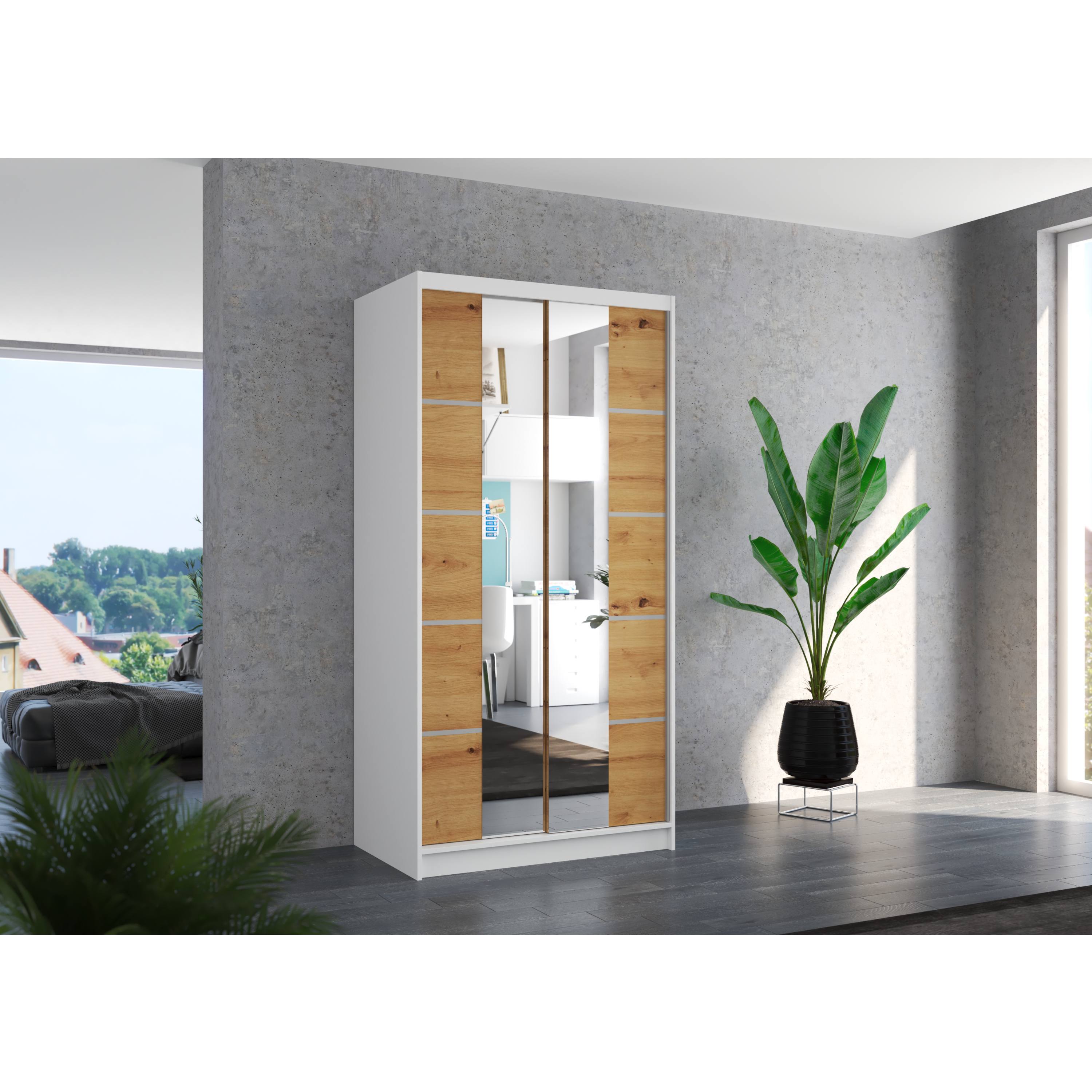 Skriňa je vybavená párom posuvných dverí, ktoré sa neotvárajú do priestoru, a tak šetria množstvo cenného miesta vo vnútri aj mimo skriňu. Súčasťou dverí sú aj praktické zrkadlové plochy, vďaka ktorým si môžete kedykoľvek upraviť svoj vzhľad. Vnútorný priestor je vybavený celkom 4 policami na prehľadné uloženie poskladaného oblečenia alebo sezónnych doplnkov a tiež šatníkovou tyčou, ktorá je ideálna na zavesenie objemných alebo krčivých odevov. Skriňa je vyrobená z laminovaného dreveného materiálu doplneného o ABS hrany chrániace pred mechanickým poškodením.