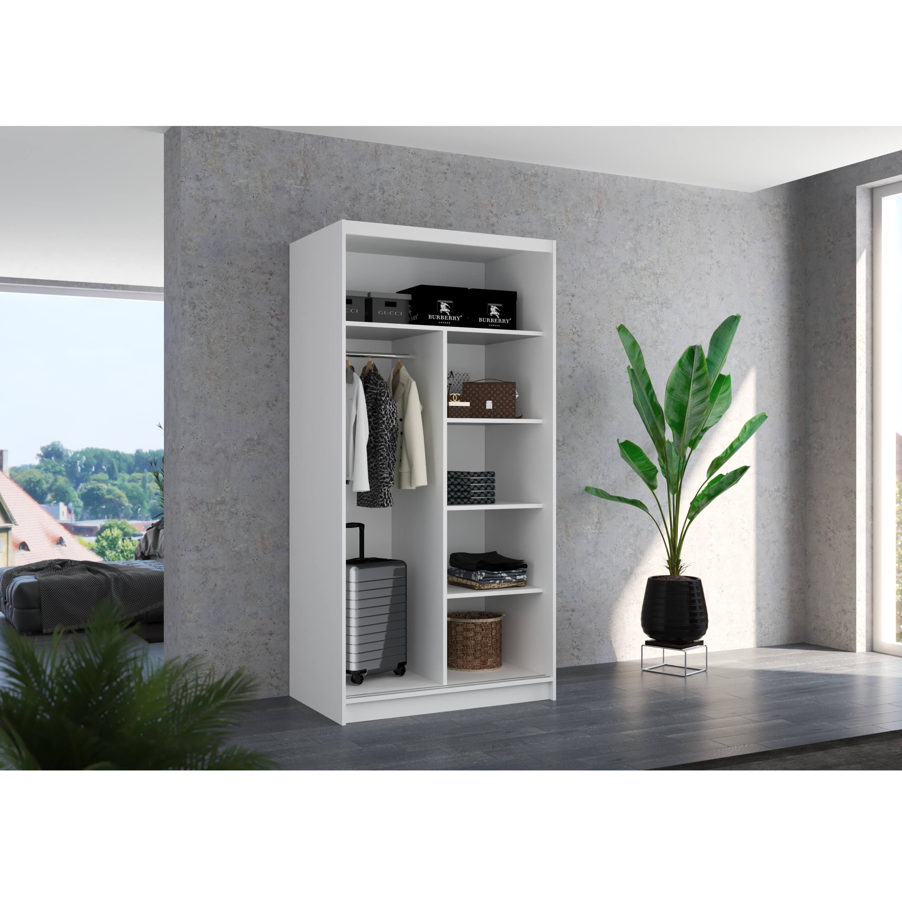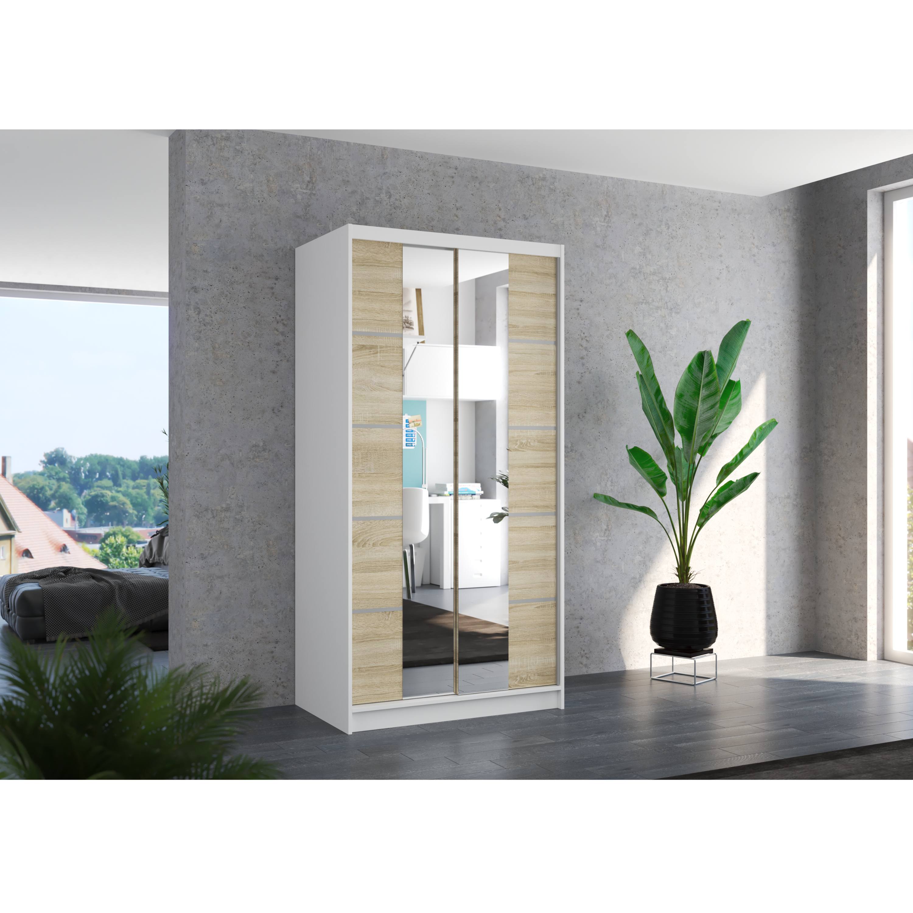 Skriňa je vybavená párom posuvných dverí, ktoré sa neotvárajú do priestoru, a tak šetria množstvo cenného miesta vo vnútri aj mimo skriňu. Súčasťou dverí sú aj praktické zrkadlové plochy, vďaka ktorým si môžete kedykoľvek upraviť svoj vzhľad. Vnútorný priestor je vybavený celkom 4 policami na prehľadné uloženie poskladaného oblečenia alebo sezónnych doplnkov a tiež šatníkovou tyčou, ktorá je ideálna na zavesenie objemných alebo krčivých odevov. Skriňa je vyrobená z laminovaného dreveného materiálu doplneného o ABS hrany chrániace pred mechanickým poškodením.