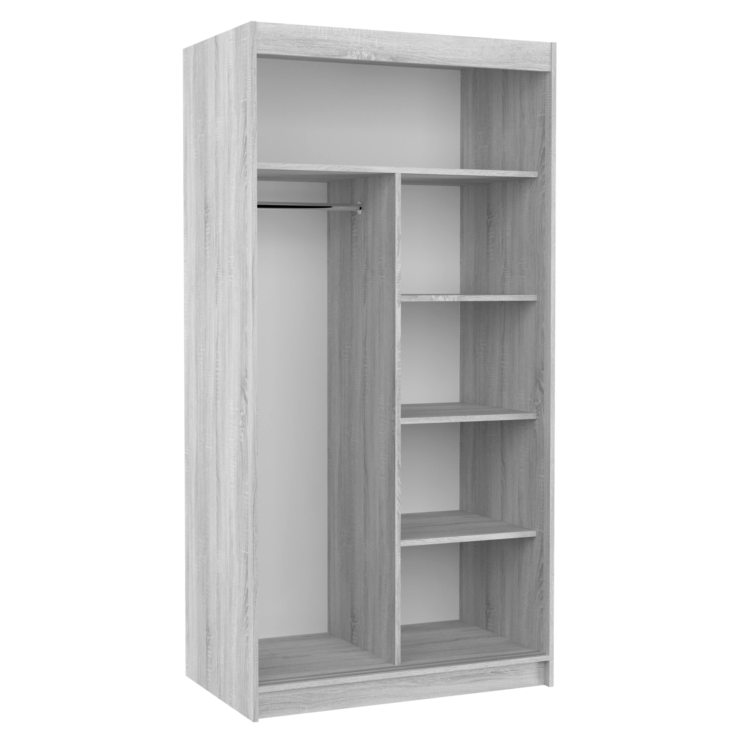 Skriňa je vybavená párom posuvných dverí, ktoré sa neotvárajú do priestoru, a tak šetria množstvo cenného miesta vo vnútri aj mimo skriňu. Súčasťou dverí sú aj praktické zrkadlové plochy, vďaka ktorým si môžete kedykoľvek upraviť svoj vzhľad. Vnútorný priestor je vybavený celkom 4 policami na prehľadné uloženie poskladaného oblečenia alebo sezónnych doplnkov a tiež šatníkovou tyčou, ktorá je ideálna na zavesenie objemných alebo krčivých odevov. Skriňa je vyrobená z laminovaného dreveného materiálu doplneného o ABS hrany chrániace pred mechanickým poškodením.