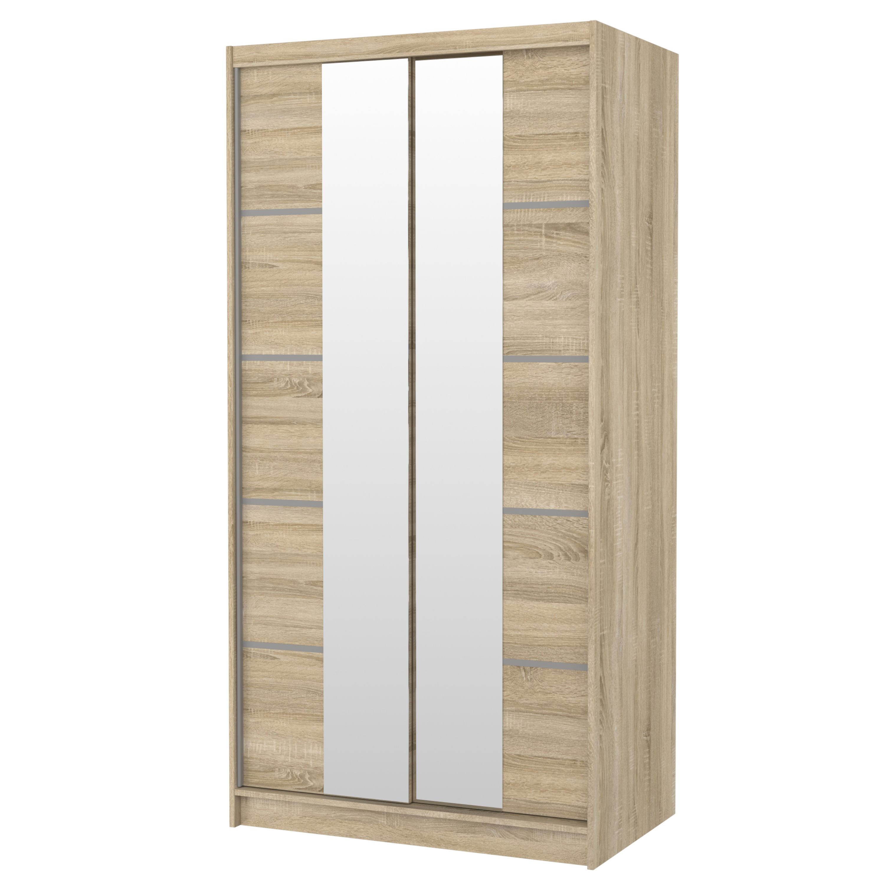 Skriňa je vybavená párom posuvných dverí, ktoré sa neotvárajú do priestoru, a tak šetria množstvo cenného miesta vo vnútri aj mimo skriňu. Súčasťou dverí sú aj praktické zrkadlové plochy, vďaka ktorým si môžete kedykoľvek upraviť svoj vzhľad. Vnútorný priestor je vybavený celkom 4 policami na prehľadné uloženie poskladaného oblečenia alebo sezónnych doplnkov a tiež šatníkovou tyčou, ktorá je ideálna na zavesenie objemných alebo krčivých odevov. Skriňa je vyrobená z laminovaného dreveného materiálu doplneného o ABS hrany chrániace pred mechanickým poškodením.