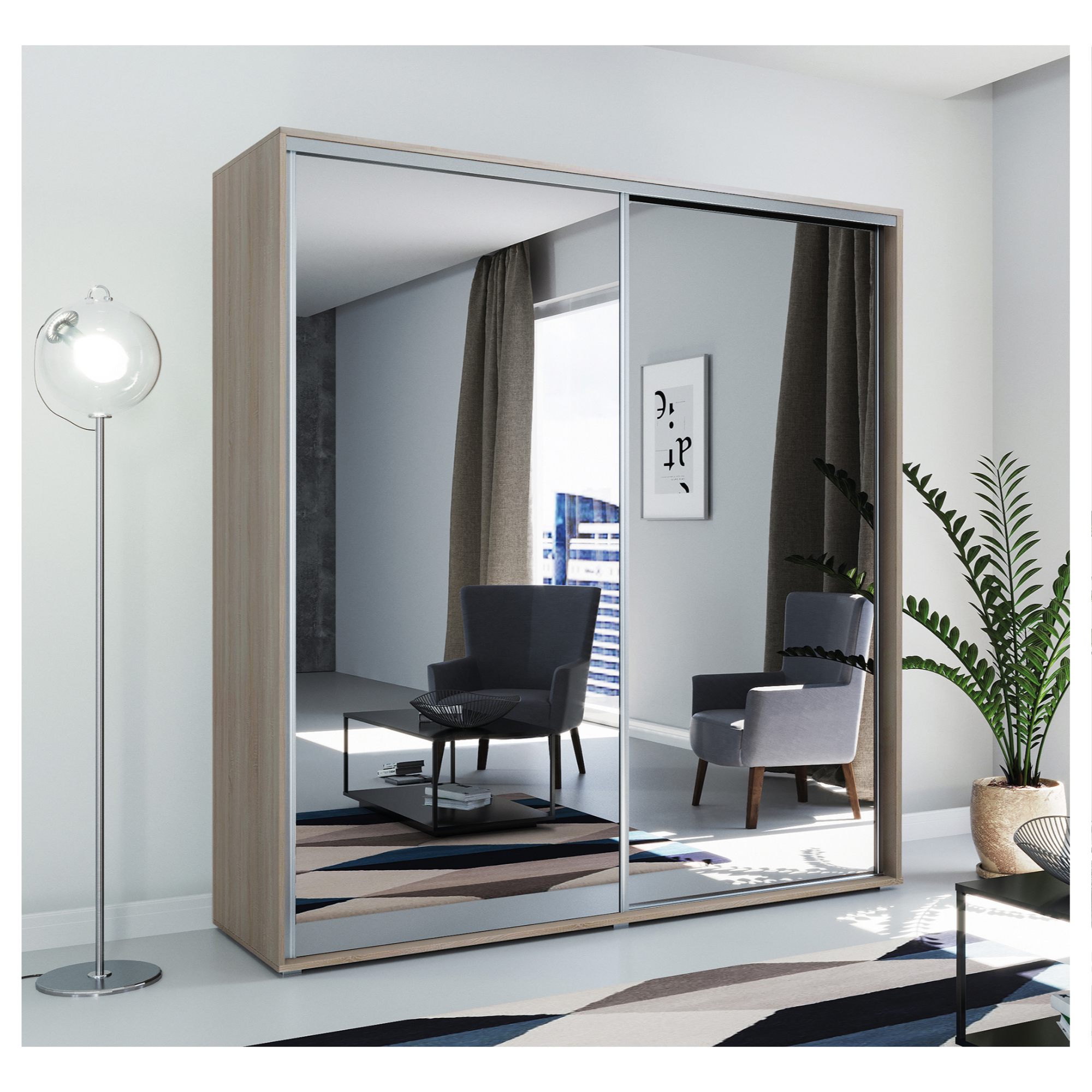 Predné plochy sú celé vyplnené zrkadlami, ktoré opticky zväčšia a presvetlia miestnosť a zároveň tiež zaistia váš bezchybný vzhľad. Vďaka posuvnému systému otvárania dverí ušetríte cenné miesto a môžete na maximum využiť priestor zvonku aj vo vnútri skrine. Skriňa je na pravej strane vybavená šatníkovou tyčou a vloženou policou nad ňou, zatiaľ čo na ľavej strane sa nachádzajú 4 vložené police. Skriňa je vyrobená z laminovanej drevotriesky s povrchom nenáročným na údržbu. Celkový vzhľad skrine dopĺňam lištami na ľahšiu manipuláciu vo farbe kovu.