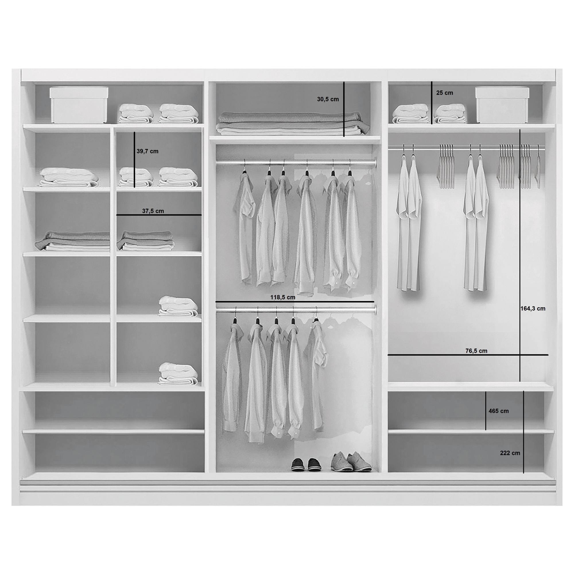 - 13 vložených políc, 3 šatníkové tyče