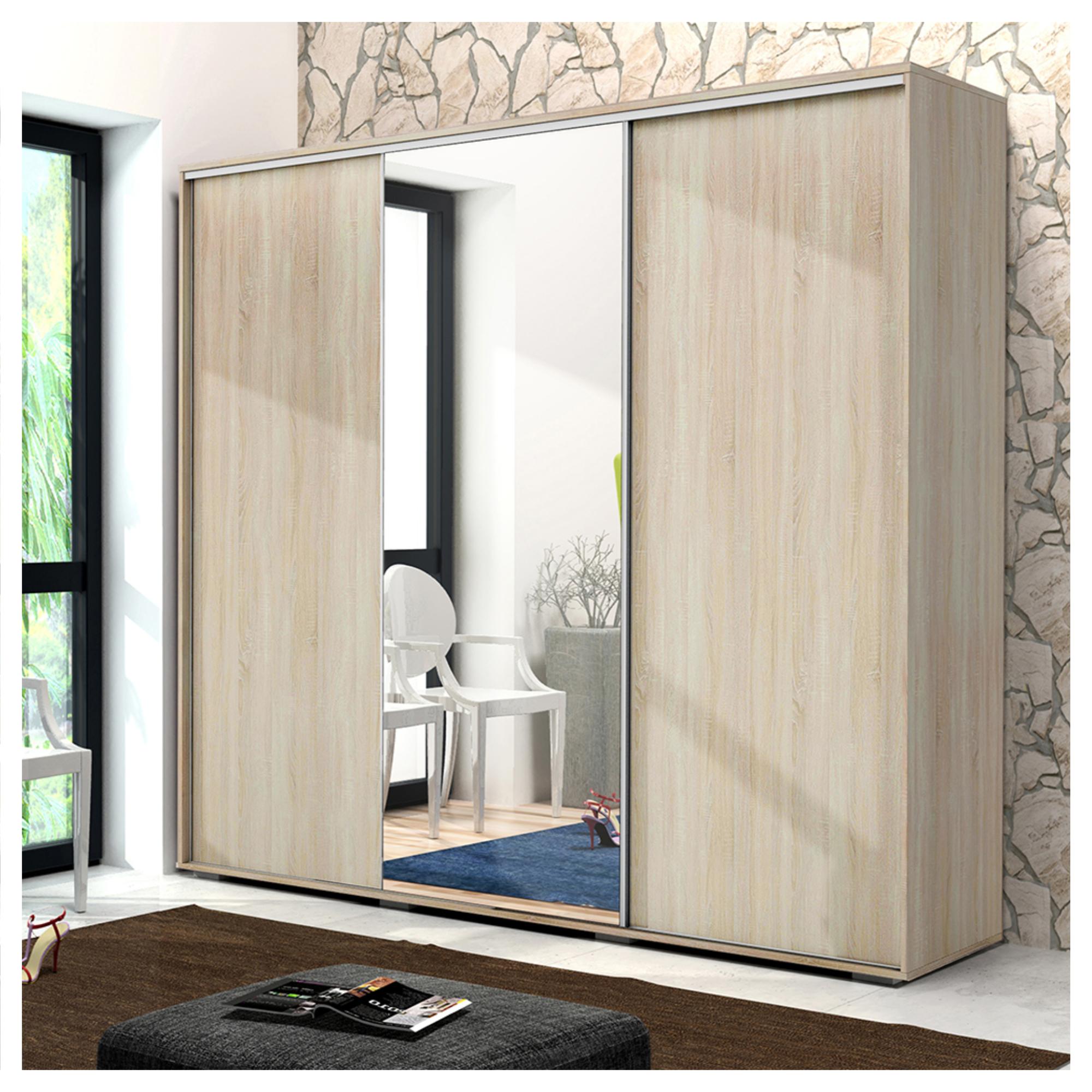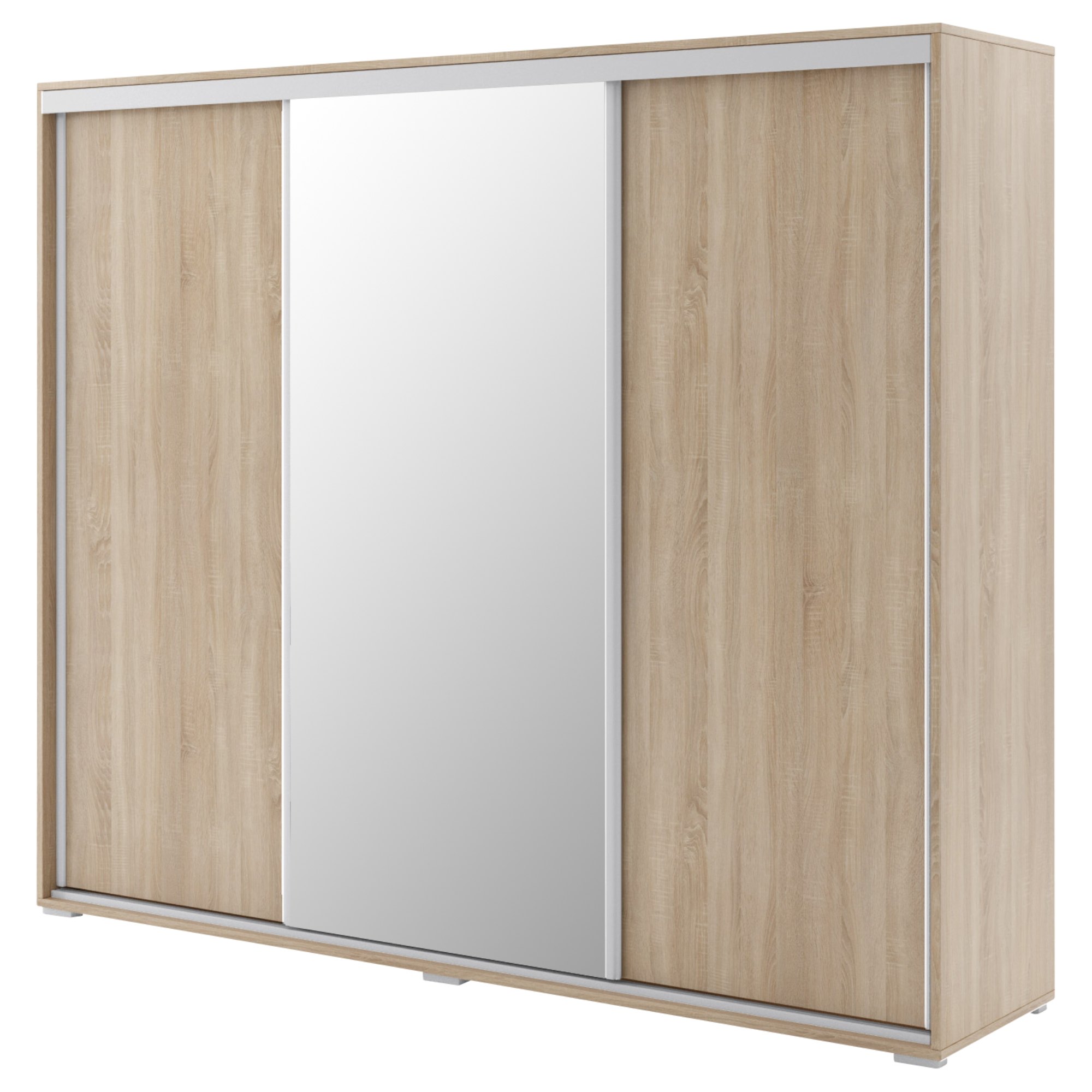 Vďaka posuvnému systému otvárania dverí ušetríte cenné miesto a môžete na maximum využiť priestor zvonku aj vo vnútri skrine. Jedny z dverí sú navyše vyplnené zrkadlom, ktoré opticky zväčší a presvetlí miestnosť a zároveň sa tiež postará o váš bezchybný vzhľad. Jednoduché otváranie dverí umožňujú praktické lišty vyhotovené vo farbe kovu. Vnútorný priestor je rozdelený do 3 oddelených blokov a obsahuje celkom 13 vložených políc a 3 šatníkové tyče. Vyrobená je z laminovanej drevotriesky s povrchom nenáročným na údržbu.