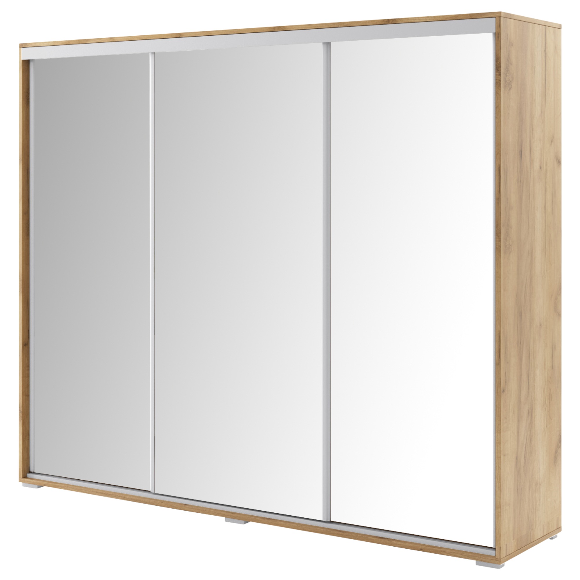 Skriňa je vybavená posuvnými, zrkadlovými dverami, ktoré sa neotvárajú do priestoru a šetria tak veľa cenného miesta zvonku aj vo vnútri skrine. Vnútorný priestor obsahuje celkom 11 vložených políc a 3 šatníkové tyče na prehľadné skladovanie oblečenia, doplnkov a iného textilu. Šatníková skriňa je vyrobená z laminovanej drevotriesky s povrchom nenáročným na údržbu.