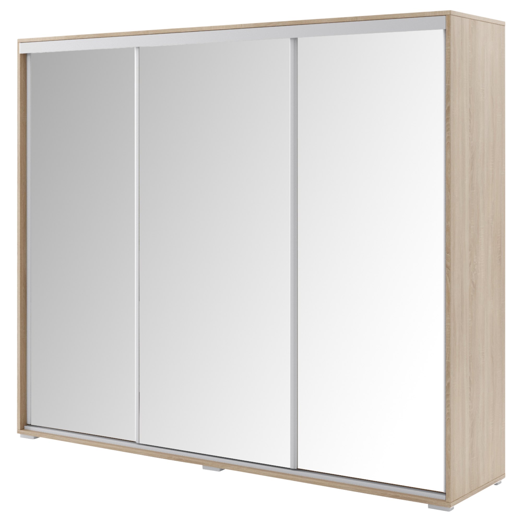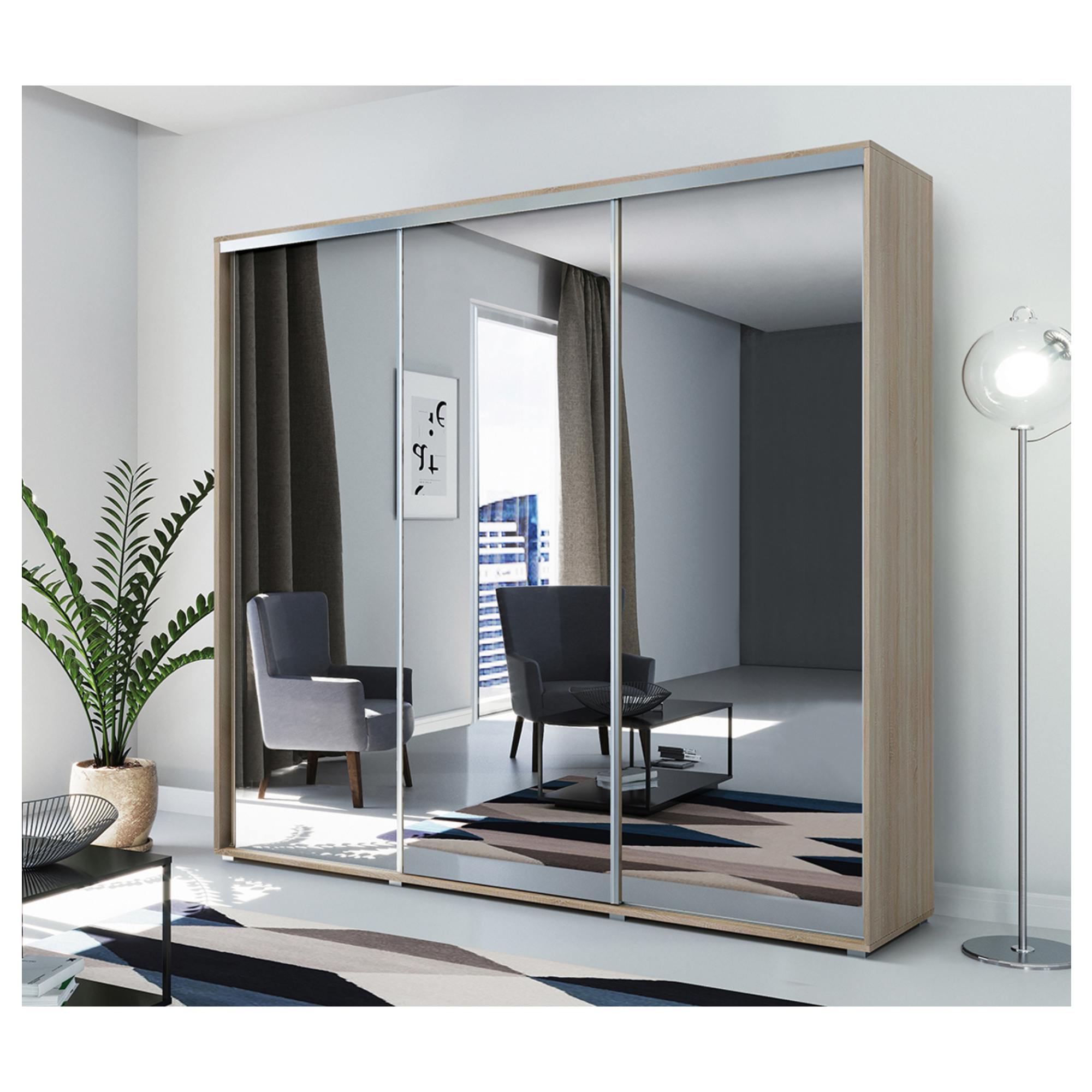 Vďaka posuvnému systému otvárania dverí ušetríte cenné miesto a môžete na maximum využiť priestor zvonku aj vo vnútri skrine. Predné plochy sú navyše celé vyplnené zrkadlami, ktoré opticky zväčšia a presvetlia miestnosť a zároveň tiež zaistia váš bezchybný vzhľad. Vnútorný priestor obsahuje celkom 13 vložených políc a 3 šatníkové tyče na prehľadné skladovanie. Skriňa je vyrobená z laminovanej drevotriesky s povrchom nenáročným na údržbu. Celkový vzhľad skrine dopĺňam lišty na jednoduchšiu manipuláciu vyhotovenú vo farbe kovu.