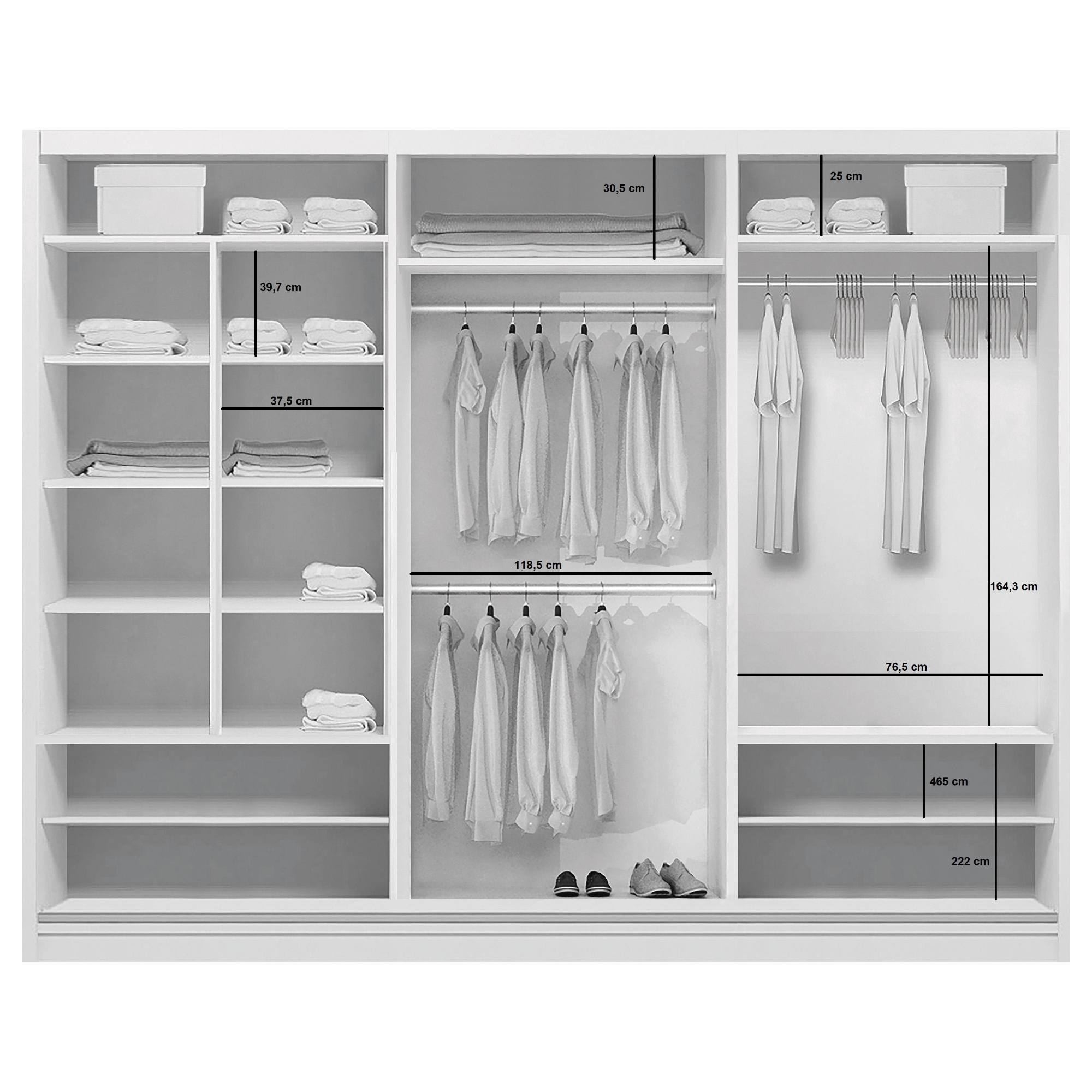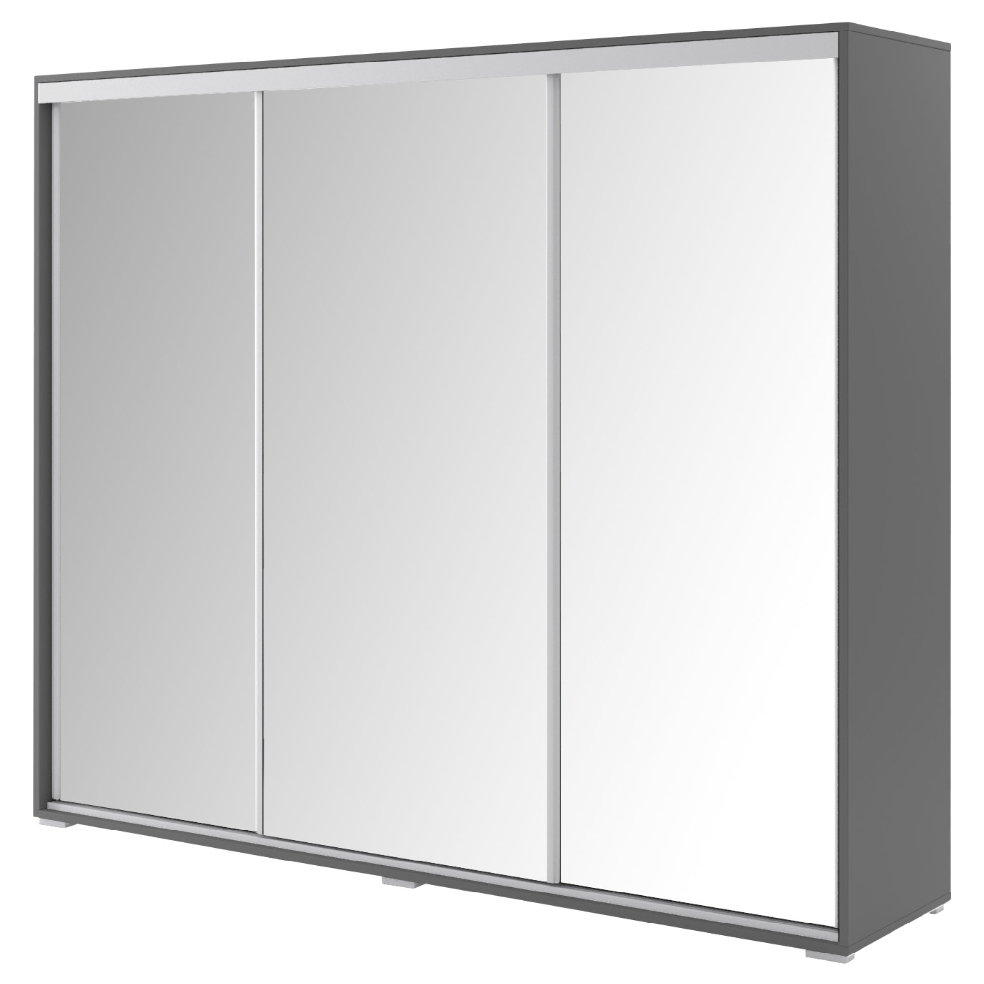 Vďaka posuvnému systému otvárania dverí ušetríte cenné miesto a môžete na maximum využiť priestor zvonku aj vo vnútri skrine. Predné plochy sú navyše celé vyplnené zrkadlami, ktoré opticky zväčšia a presvetlia miestnosť a zároveň tiež zaistia váš bezchybný vzhľad. Vnútorný priestor obsahuje celkom 13 vložených políc a 3 šatníkové tyče na prehľadné skladovanie. Skriňa je vyrobená z laminovanej drevotriesky s povrchom nenáročným na údržbu. Celkový vzhľad skrine dopĺňam lišty na jednoduchšiu manipuláciu vyhotovenú vo farbe kovu.