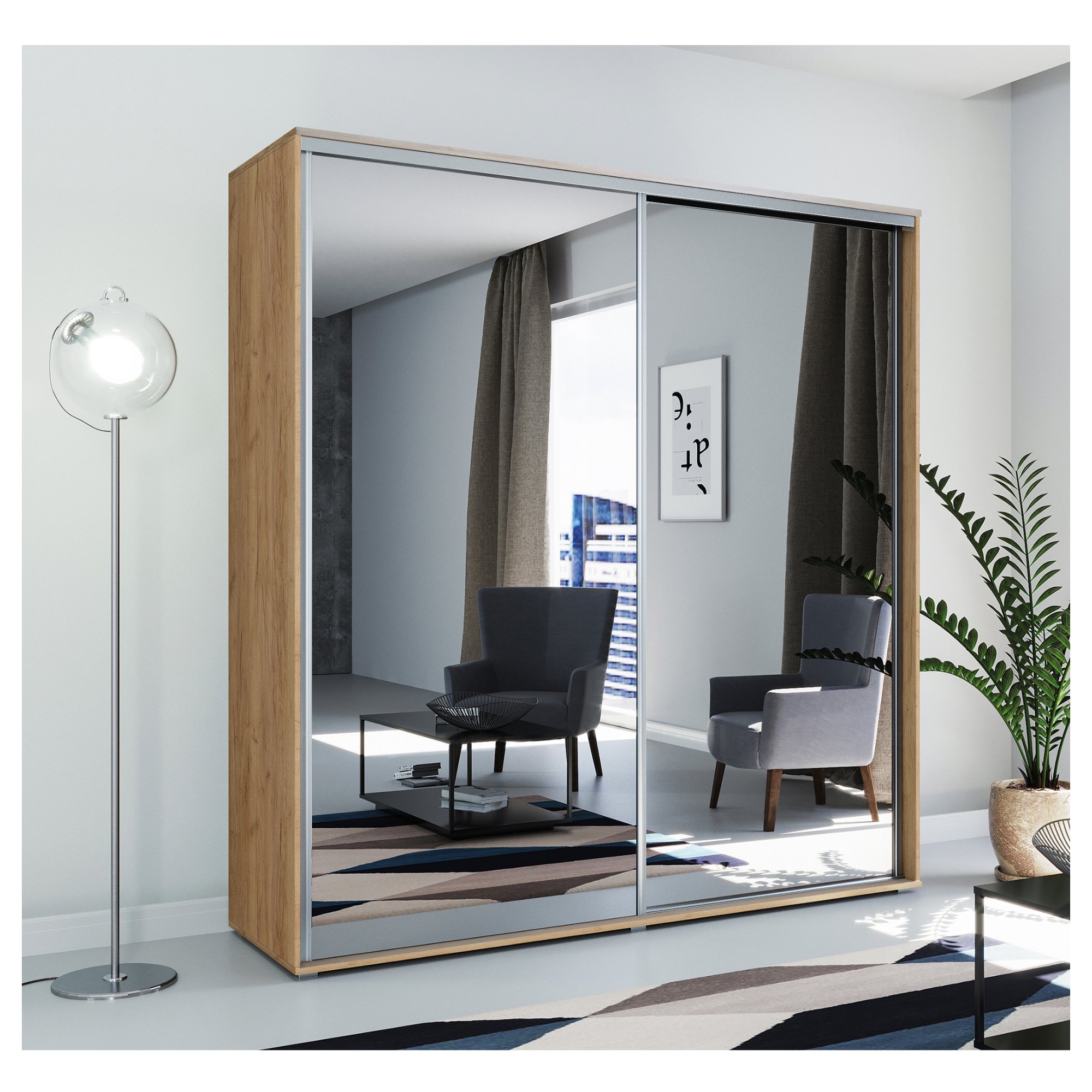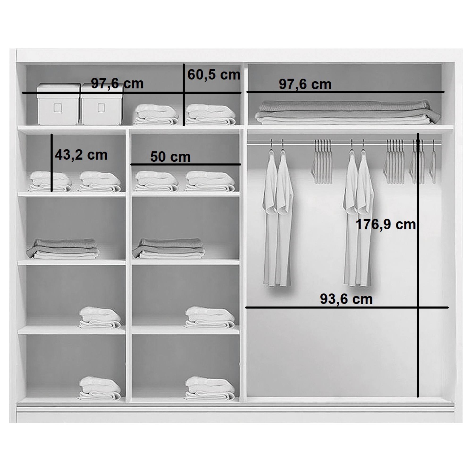 Skriňa je vybavená párom posuvných, zrkadlových dverí, ktoré sa neotvárajú do priestoru a šetria tak veľa cenného miesta zvonku aj vo vnútri skrine. Ľavá časť skrine je vybavená 7 vloženými policami na prehľadné uloženie poskladaného oblečenia. Na pravej strane nájdete vloženú policu a pod ňou šatníkovú tyč, ktorá je vhodná na zavesenie objemných alebo krčivých kúskov. Šatníková skriňa je vyrobená z laminovanej drevotriesky s povrchom nenáročným na údržbu.