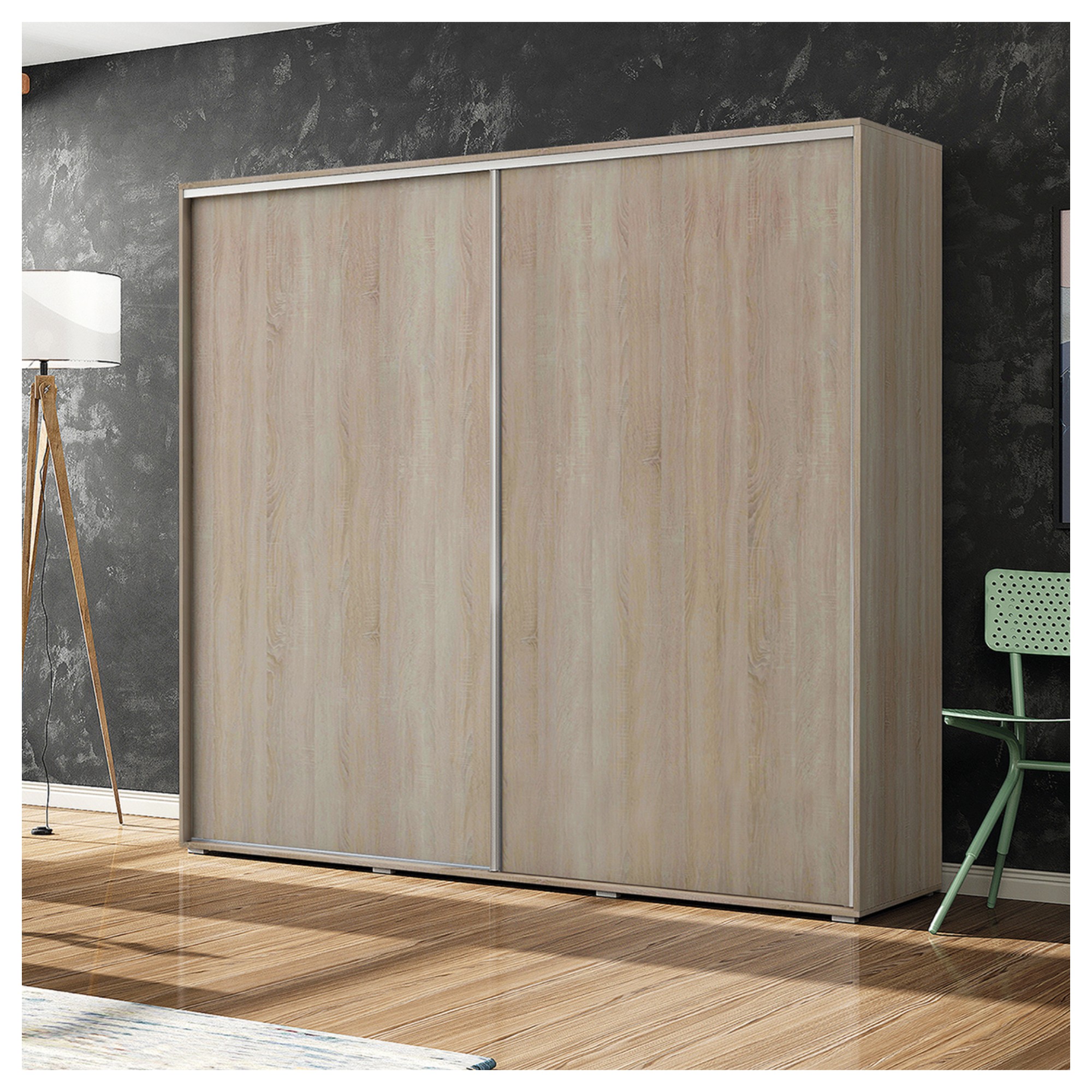 Skriňa je na pravej strane vybavená šatníkovou tyčou a vloženou policou nad ňou, zatiaľ čo na ľavej strane sa nachádzajú 4 vložené police. Skriňu uzatvárajú posuvné dvere, ktoré šetria cenný priestor zvonku aj vo vnútri skrine. Celkový vzhľad dopĺňajú lišty na ľahšiu manipuláciu vyhotovené vo farbe kovu. Skriňa je vyrobená z laminovanej drevotriesky s povrchom nenáročným na údržbu