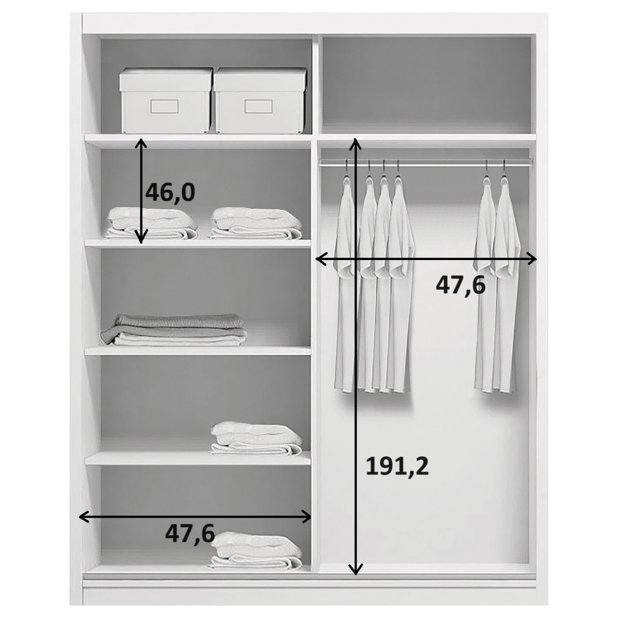 Skriňa je na pravej strane vybavená šatníkovou tyčou a vloženou policou nad ňou, zatiaľ čo na ľavej strane sa nachádzajú 4 vložené police. Skriňu uzatvárajú posuvné dvere, ktoré šetria cenný priestor zvonku aj vo vnútri skrine. Celkový vzhľad dopĺňajú lišty na ľahšiu manipuláciu vyhotovené vo farbe kovu. Skriňa je vyrobená z laminovanej drevotriesky s povrchom nenáročným na údržbu