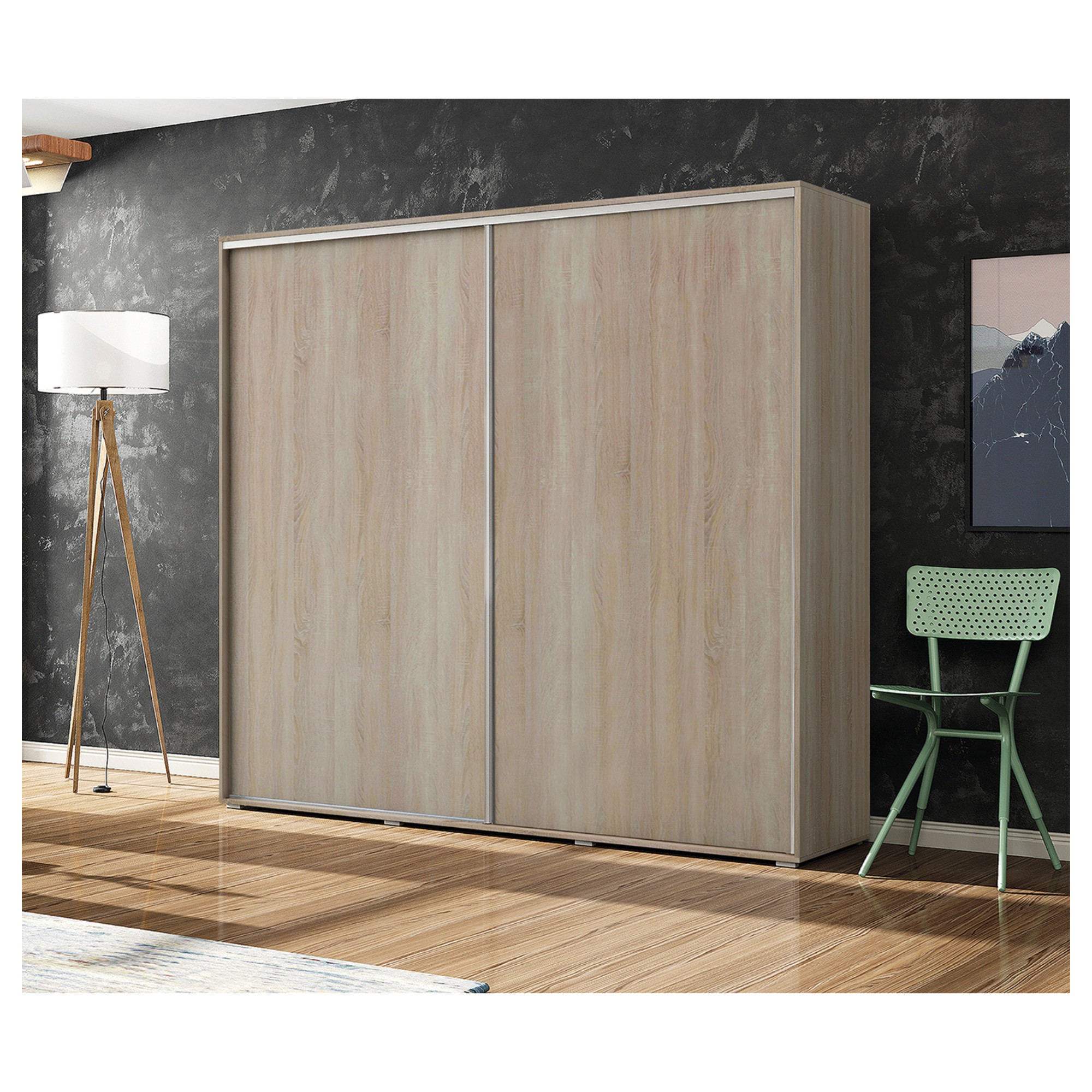 Skriňa je vybavená párom posuvných dverí, ktoré sa neotvárajú do priestoru a šetria tak veľa cenného miesta zvonku aj vo vnútri skrine. Ľavá časť skrine je vybavená 7 vloženými policami na prehľadné uloženie poskladaného oblečenia. Na pravej strane sa nachádza 1 vložená polica a pod ňou šatníková tyč, ktorá je ideálna na zavesenie objemných alebo krčivých odevov. Predné plochy dverí sú navyše doplnené o praktické lišty na ľahkú každodennú manipuláciu. Šatníková skriňa je vyrobená z laminovanej drevotriesky s povrchom nenáročným na údržbu.