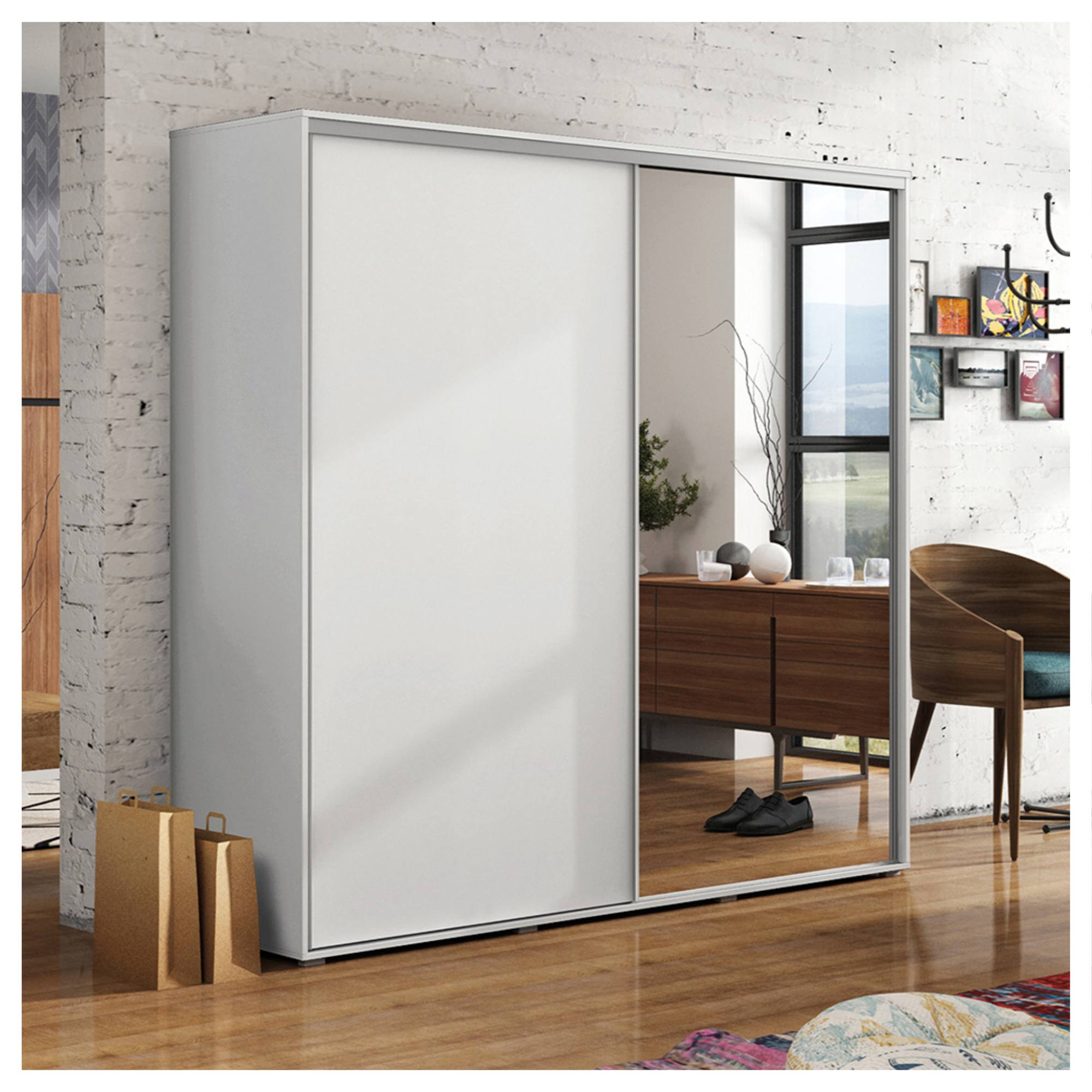 Vďaka posuvnému systému otvárania dverí ušetríte cenné miesto a môžete na maximum využiť priestor zvonku aj vo vnútri skrine. Jedny z dverí sú navyše vyplnené zrkadlom, ktoré opticky zväčší a presvetlí miestnosť a zároveň sa tiež postará o váš bezchybný vzhľad. Jednoduché otváranie dverí umožňujú praktické lišty vyhotovené vo farbe kovu. Skriňa je na pravej strane vybavená šatníkovou tyčou a vloženou policou nad ňou, zatiaľ čo ľavá strana obsahuje 4 vložené police. Skriňa je vyrobená z laminovanej drevotriesky s povrchom nenáročným na údržbu.