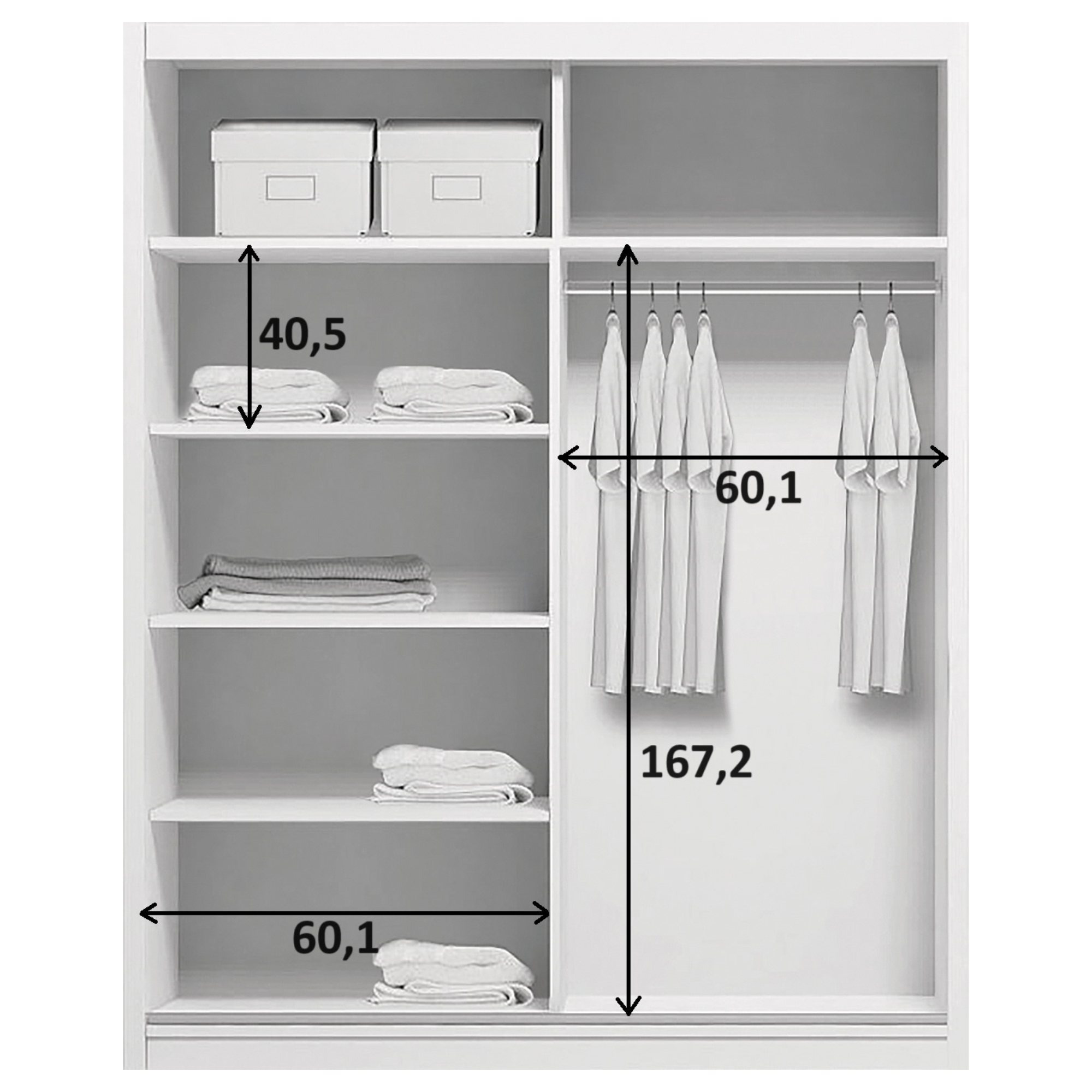 Vďaka posuvnému systému otvárania dverí ušetríte cenné miesto a môžete na maximum využiť priestor zvonku aj vo vnútri skrine. Jedny z dverí sú navyše vyplnené zrkadlom, ktoré opticky zväčší a presvetlí miestnosť a zároveň sa tiež postará o váš bezchybný vzhľad. Jednoduché otváranie dverí umožňujú praktické lišty vyhotovené vo farbe kovu. Skriňa je na pravej strane vybavená šatníkovou tyčou a vloženou policou nad ňou, zatiaľ čo ľavá strana obsahuje 4 vložené police. Skriňa je vyrobená z laminovanej drevotriesky s povrchom nenáročným na údržbu.