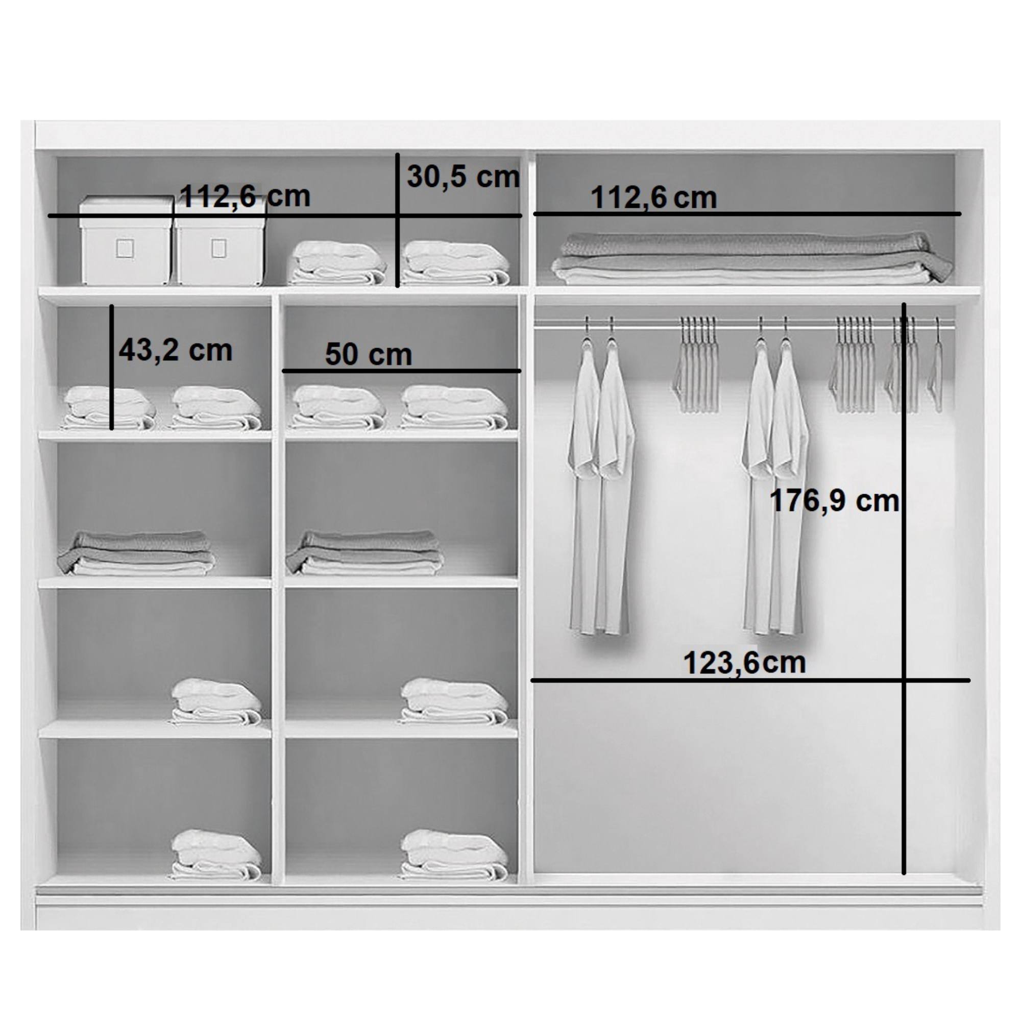 Vďaka posuvnému systému otvárania dverí ušetríte cenné miesto a môžete na maximum využiť priestor zvonku aj vo vnútri skrine. Jedny z dverí sú navyše vyplnené zrkadlom, ktoré opticky zväčší a presvetlí miestnosť a zároveň sa tiež postará o váš bezchybný vzhľad. Jednoduché otváranie dverí umožňujú praktické lišty vyhotovené vo farbe kovu. Ľavá časť skrine je vybavená 7 vloženými policami na prehľadné uloženie poskladaného oblečenia. Na pravej strane sa nachádza 1 vložená polica a pod ňou šatníková tyč, ktorá je ideálna na zavesenie objemných alebo krčivých odevov. Šatníková skriňa je vyrobená z laminovanej drevotriesky s povrchom nenáročným na údržbu.