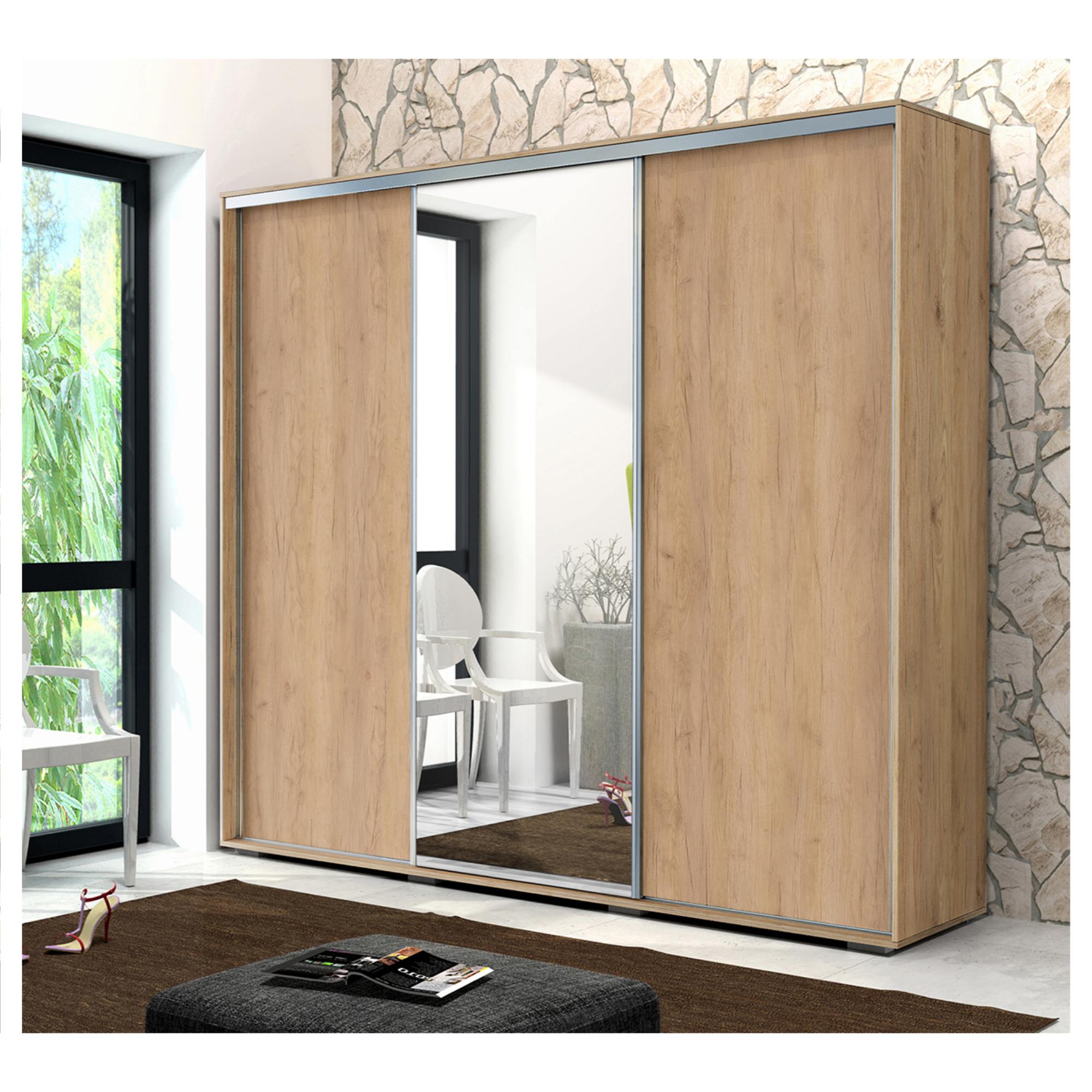 Vďaka posuvnému systému otvárania dverí ušetríte cenné miesto a môžete na maximum využiť priestor zvonku aj vo vnútri skrine. Jedny z dverí sú navyše vyplnené zrkadlom, ktoré opticky zväčší a presvetlí miestnosť a zároveň sa tiež postará o váš bezchybný vzhľad. Jednoduché otváranie dverí umožňujú praktické lišty vyhotovené vo farbe kovu. Vnútorný priestor je rozdelený do 3 oddelených blokov a obsahuje celkom 11 vložených políc a 3 šatníkové tyče. Vyrobená je z laminovanej drevotriesky s povrchom nenáročným na údržbu.