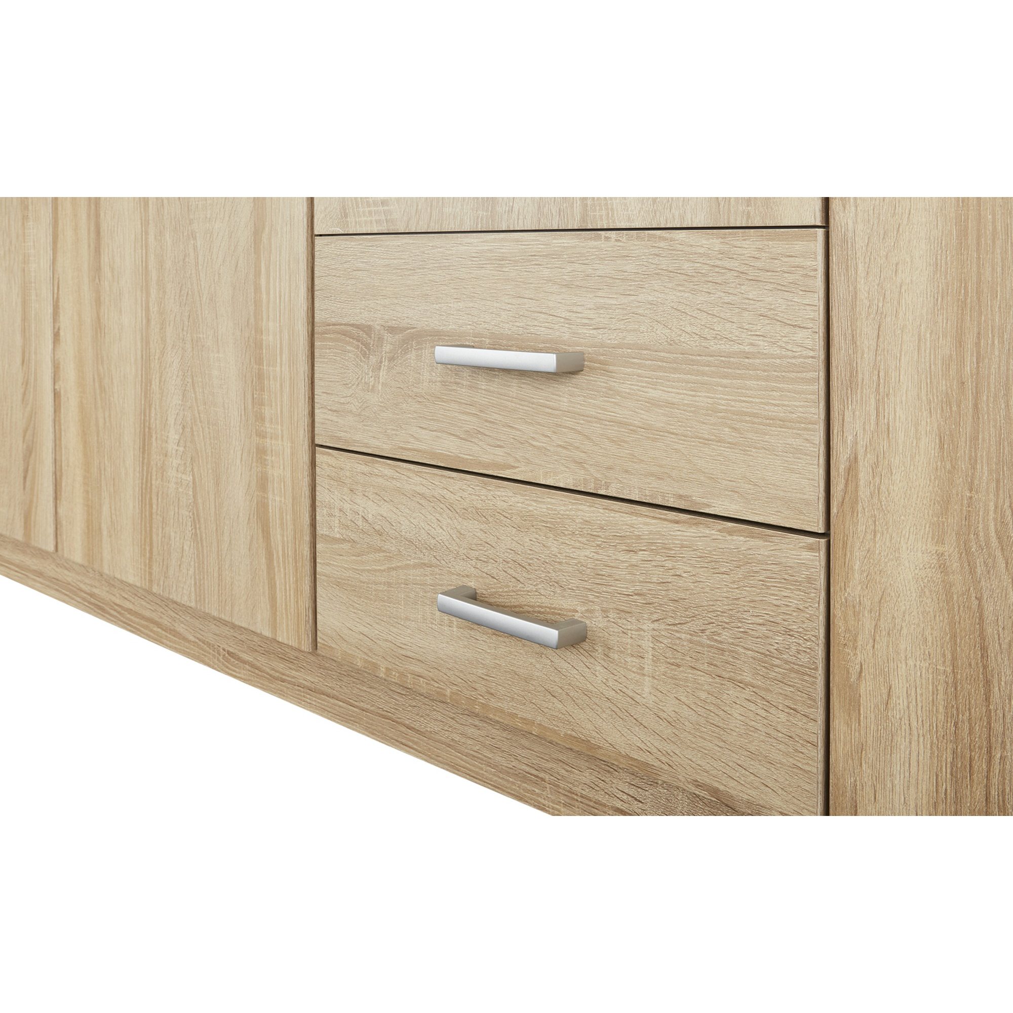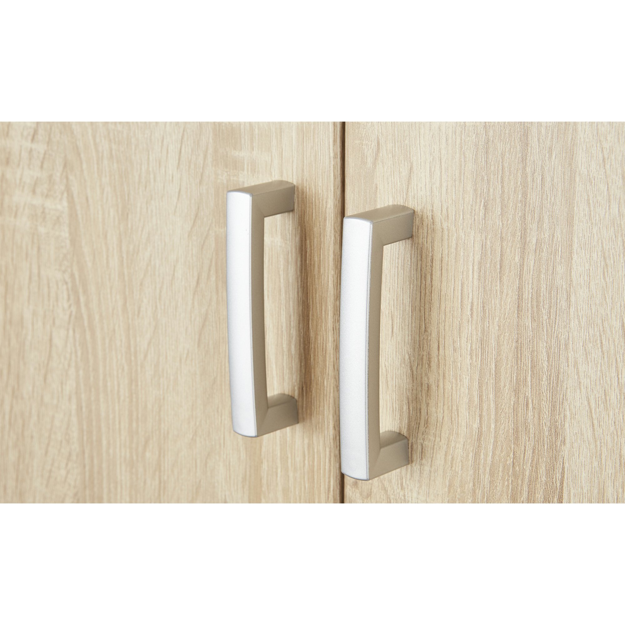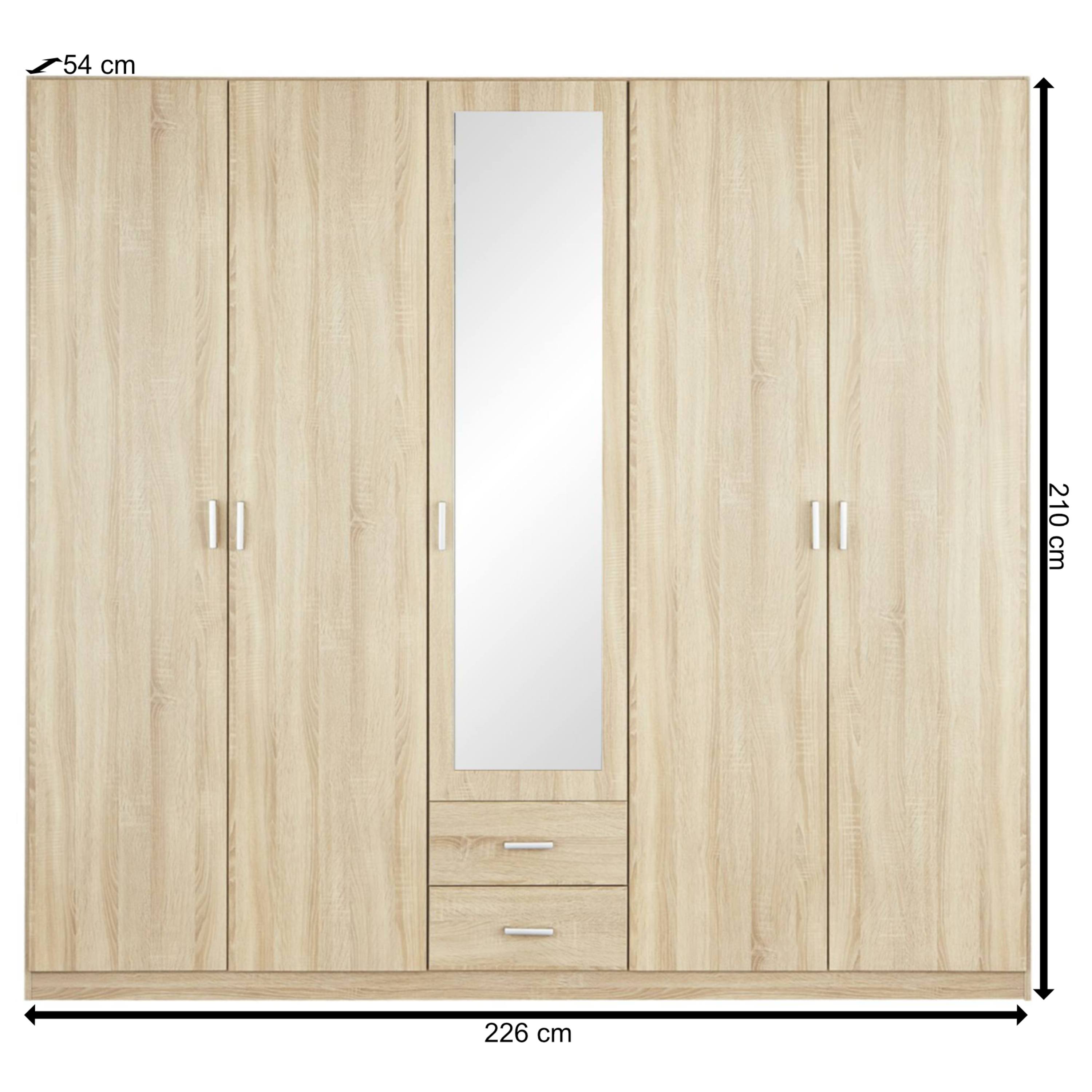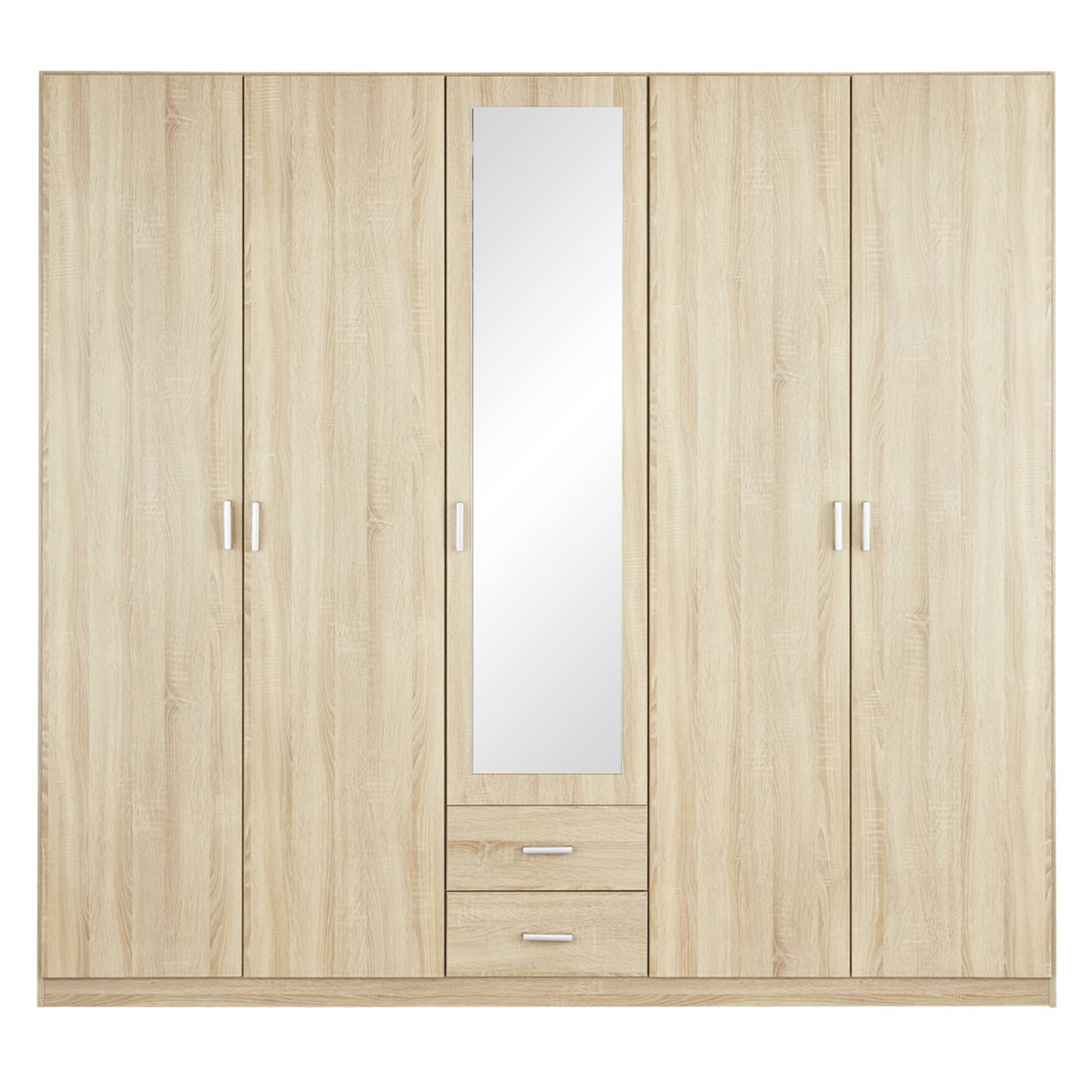 Šatníková skriňa má 5 otočných dverí a jedny z nich sú vybavené praktickým zrkadlom. Za dverami sa nachádza priestranné členené vnútorné vybavenie zostavené z 3 vložených políc a 3 šatníkových tyčí. V dolnej časti skrine sa nachádzajú 2 zásuvky. Decentné rúčky uľahčujú otváranie jednotlivých častí. Skriňa je vyrobená z laminovaného dreveného materiálu, ktorý je odolný a nenáročný na údržbu.
