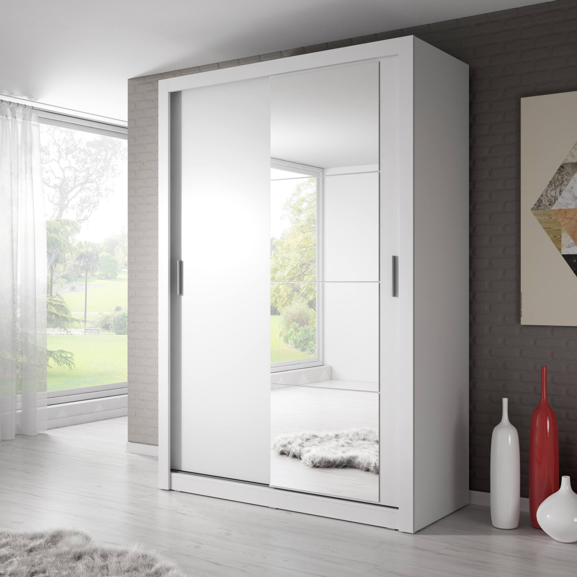 Šatníková skriňa disponuje dvojicou posuvných dverí, z čoho jedny sú zrkadlové. Pomôžu tak doladiť váš outfit a zároveň ušetríte miesto pri otváraní. Dostatočný úložný priestor zaisťuje päť políc a jedna šatníková tyč. Všetko oblečenie tak bude vždy logicky a prehľadne usporiadané. Skriňa je vyrobená z laminovaného dreveného materiálu, ktorý sa vyznačuje ľahkou udržiavateľnosťou aj dlhou životnosťou.