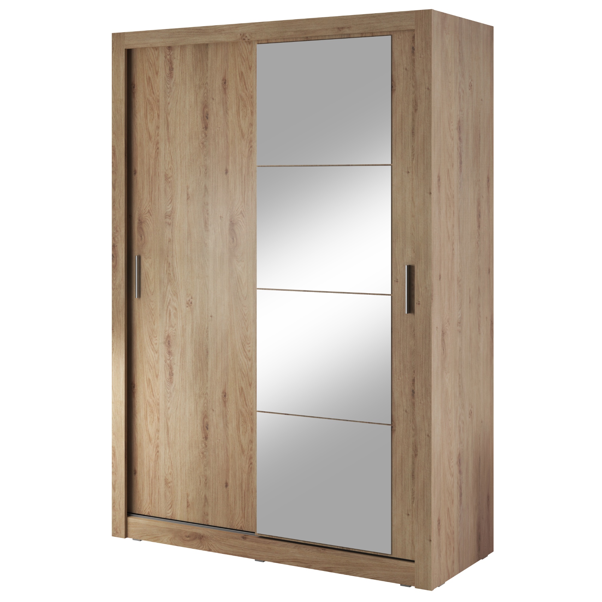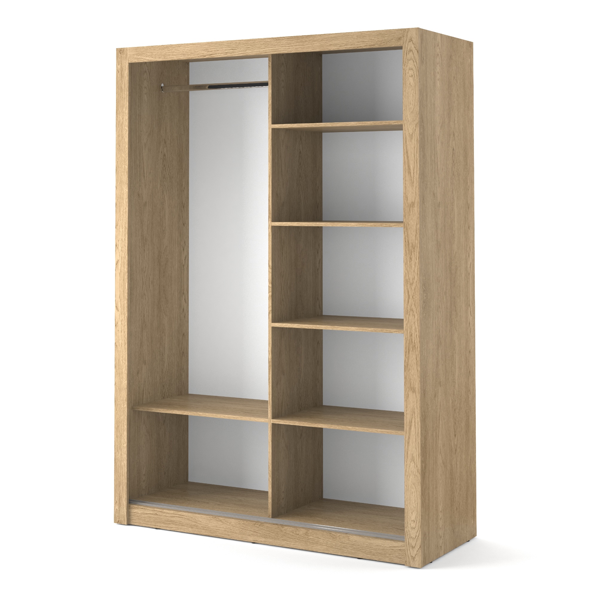 Šatníková skriňa disponuje dvojicou posuvných dverí, z čoho jedny sú zrkadlové. Pomôžu tak doladiť váš outfit a zároveň ušetríte miesto pri otváraní. Dostatočný úložný priestor zaisťuje päť políc a jedna šatníková tyč. Všetko oblečenie tak bude vždy logicky a prehľadne usporiadané. Skriňa je vyrobená z laminovaného dreveného materiálu, ktorý sa vyznačuje ľahkou udržiavateľnosťou aj dlhou životnosťou.