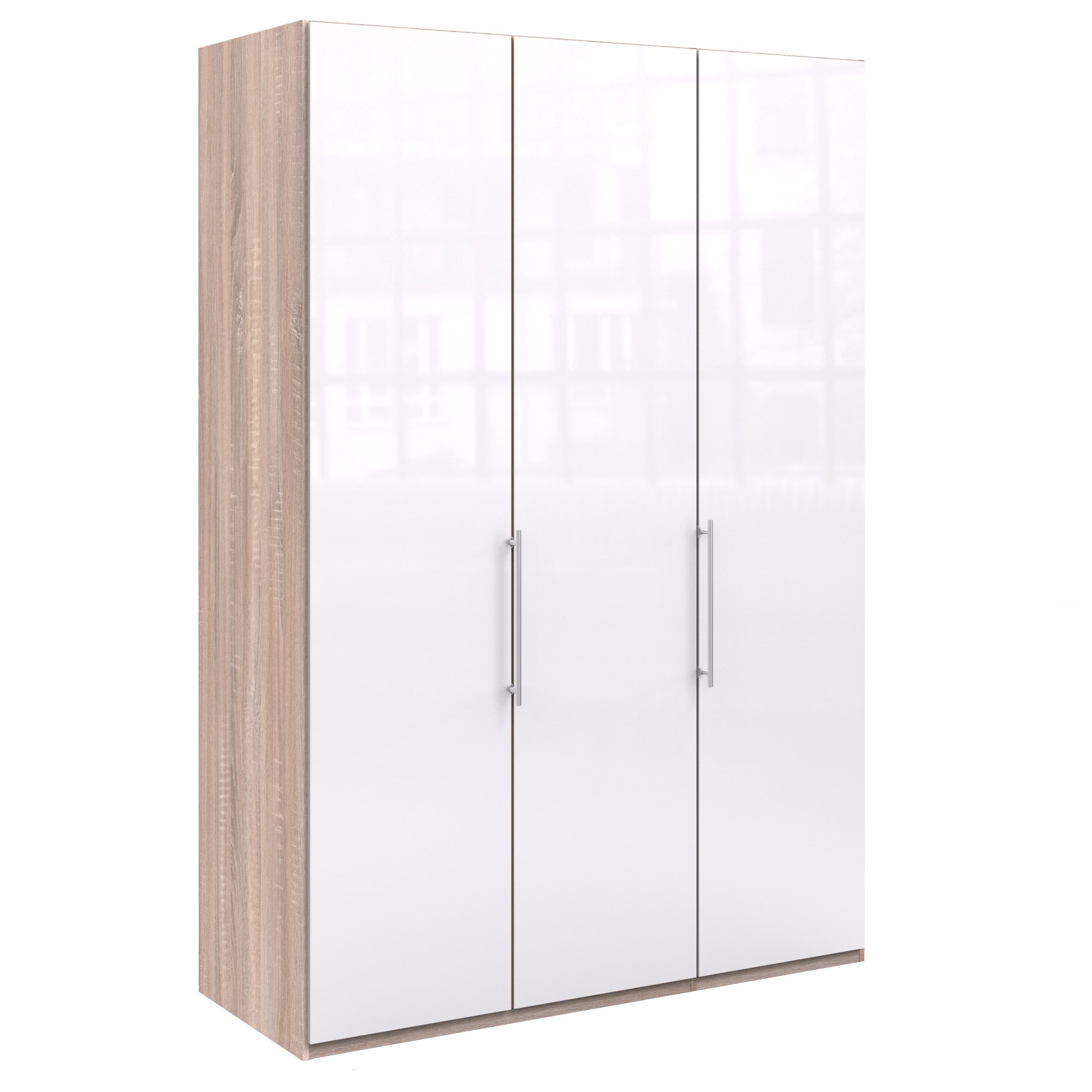 Šatníková skriňa disponuje skladacími dvierkami, ktoré sa elegantne pohybujú na kovových pojazdoch. Za nimi sa nachádza vnútorné vybavenie zostavené zo 4 vložených políc a 2 šatníkových tyčí. Decentné kovové rúčky uľahčujú otváranie jednotlivých častí skrine.
