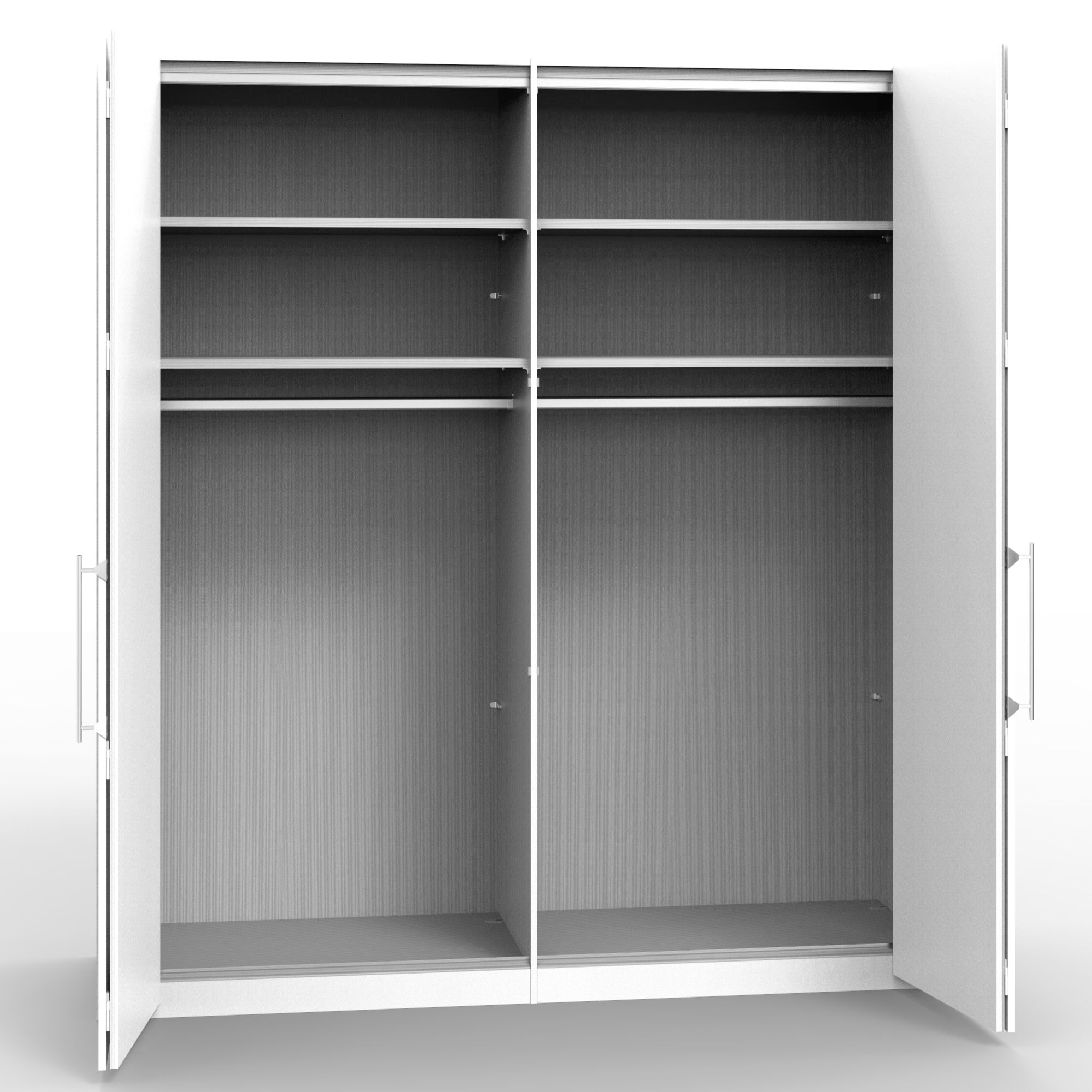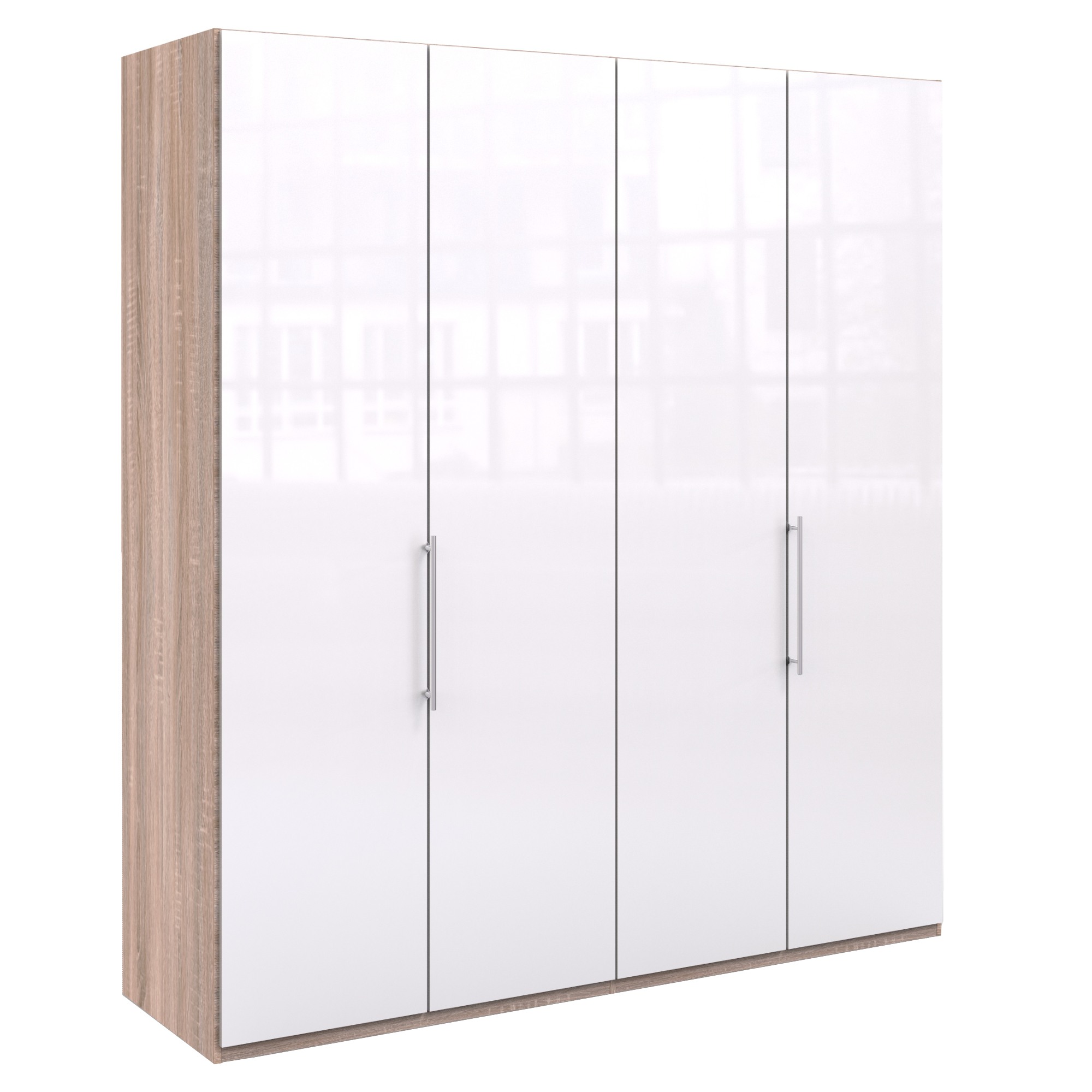 Šatníková skriňa disponuje skladacími dvierkami, ktoré sa elegantne pohybujú na kovových pojazdoch. Za nimi sa nachádza vnútorné vybavenie zostavené zo 4 vložených políc a 2 šatníkových tyčí. Decentné kovové rúčky uľahčujú otváranie jednotlivých častí skrine.